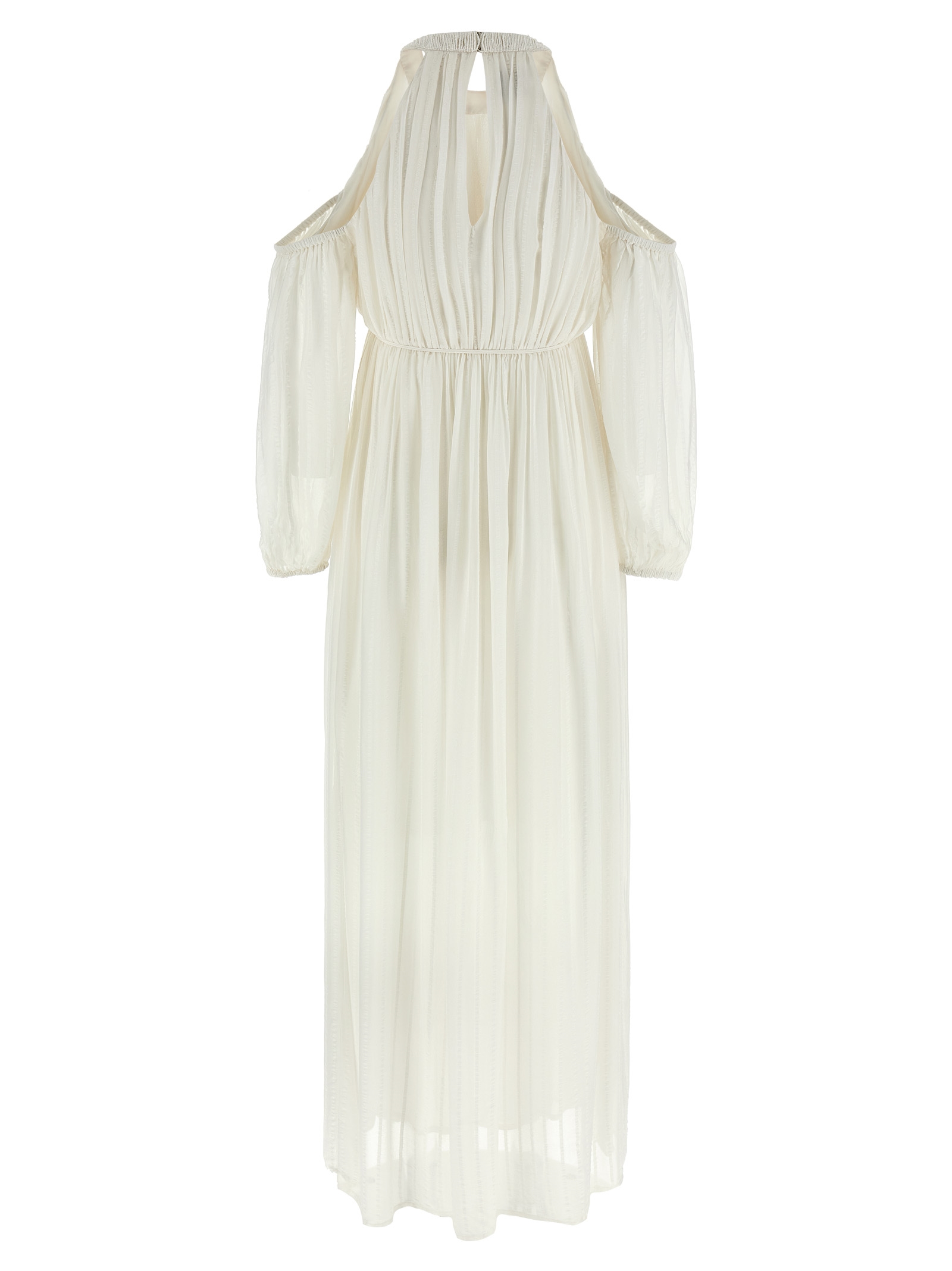 ‘Allenatore’ viscose georgette dress with tone-on-tone satin stripes, American neckline embroidered with beads with back hook closure and cut-out teardrop detail, front lacing closure with tassels decorated with beads and cut-out teardrop detail, off the shoulder model with long sleeves with elastic cuffs, front split, petticoat.