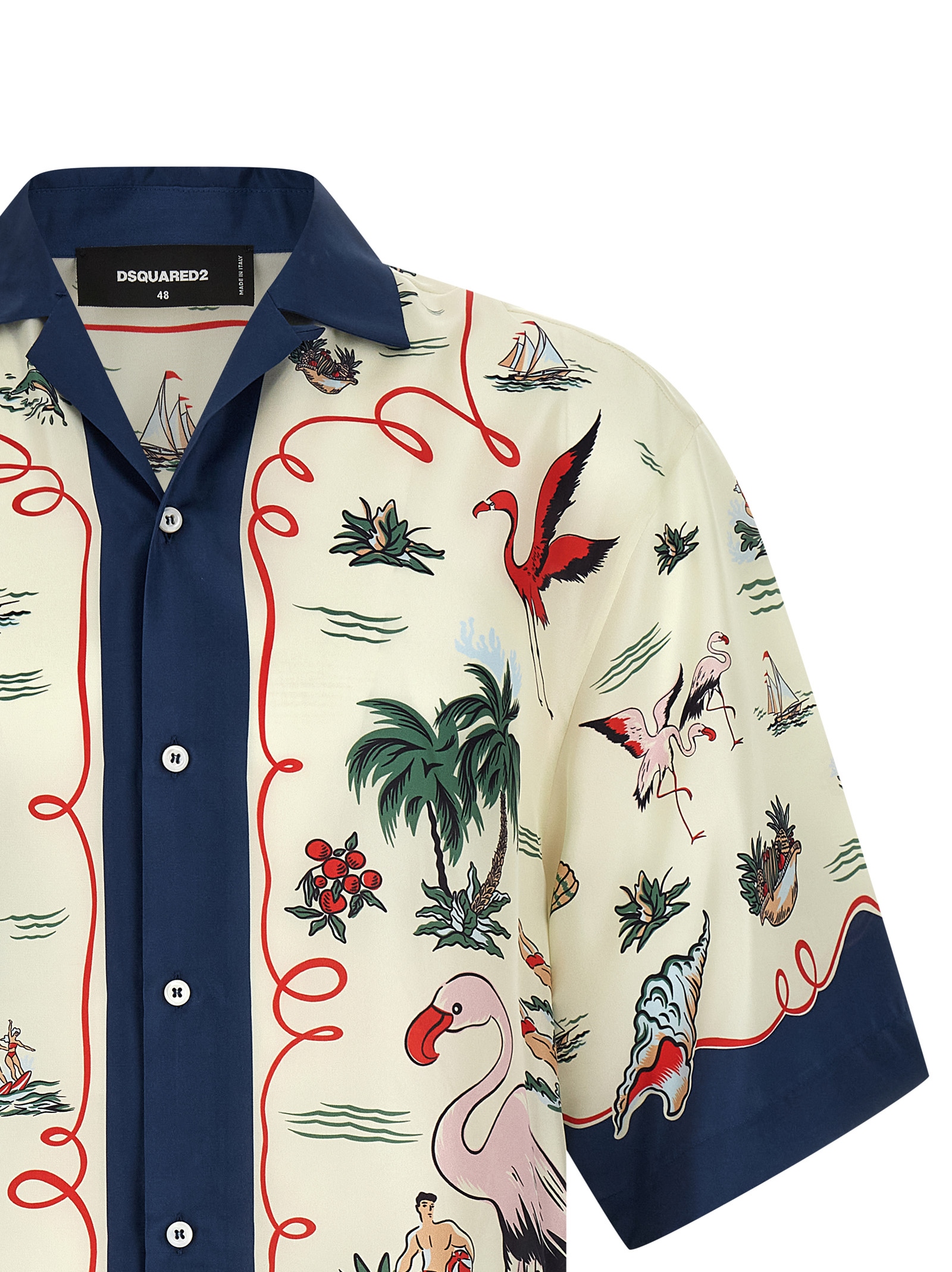 ‘Aloha Souvenir’ all-over patterned silk twill shirt, bowling style, front button closure, short sleeves with dropped shoulders, small side slits on the hem.
