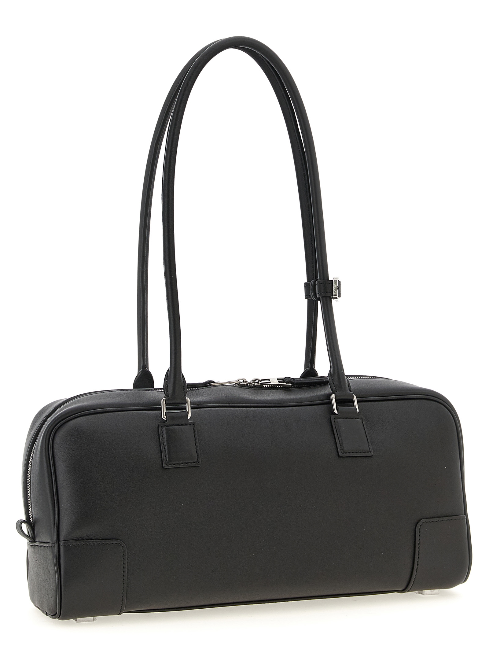 ‘Amazona’ shoulder bag in shiny calf leather, elongated bowling bag silhouette, metal padlock detail with removable embossed ‘Anagram’ logo, front embossed ‘Anagram’ logo, double fixed tubular handle, top zip closure, rigid base with metal feet, suede lining.