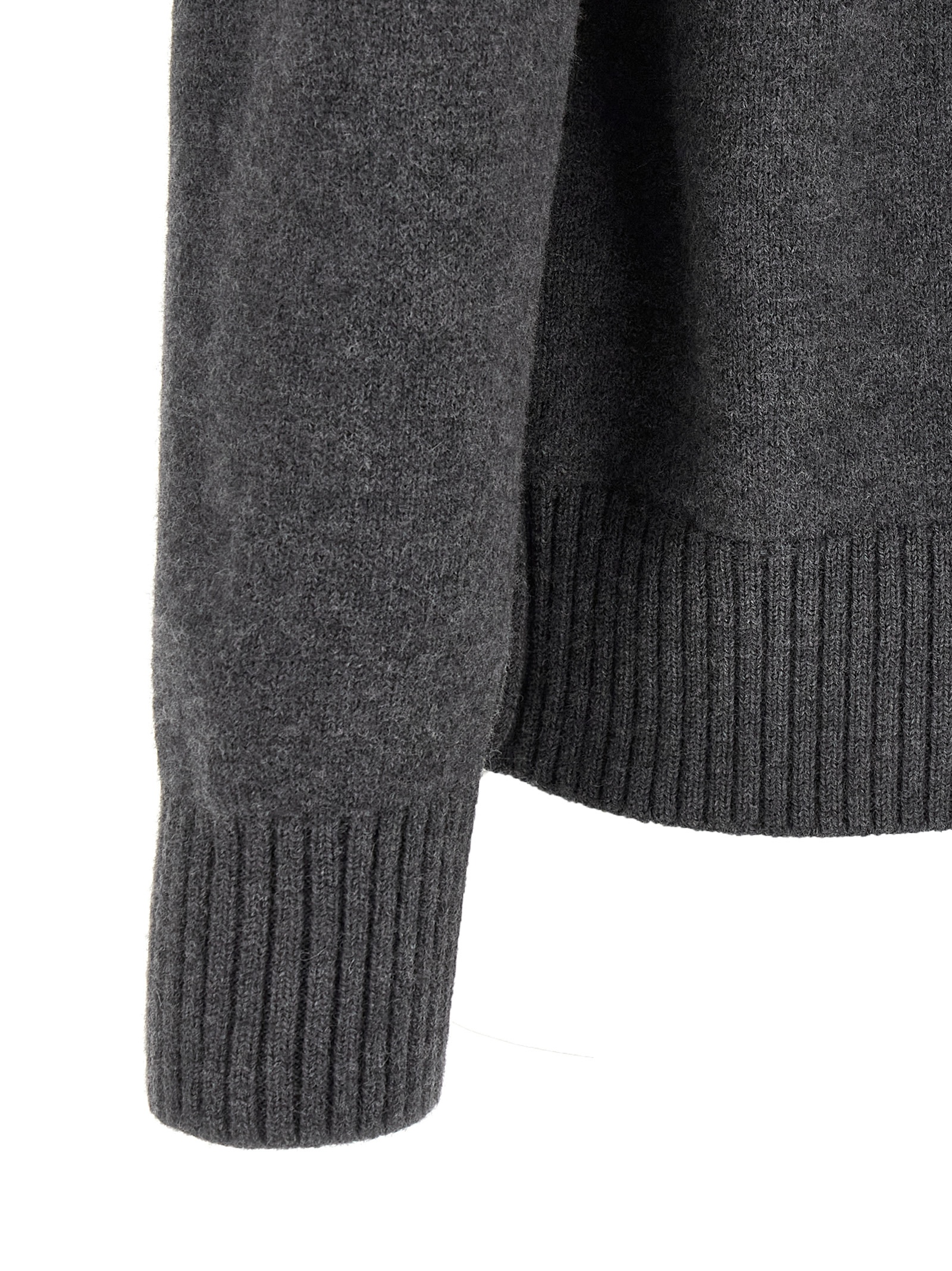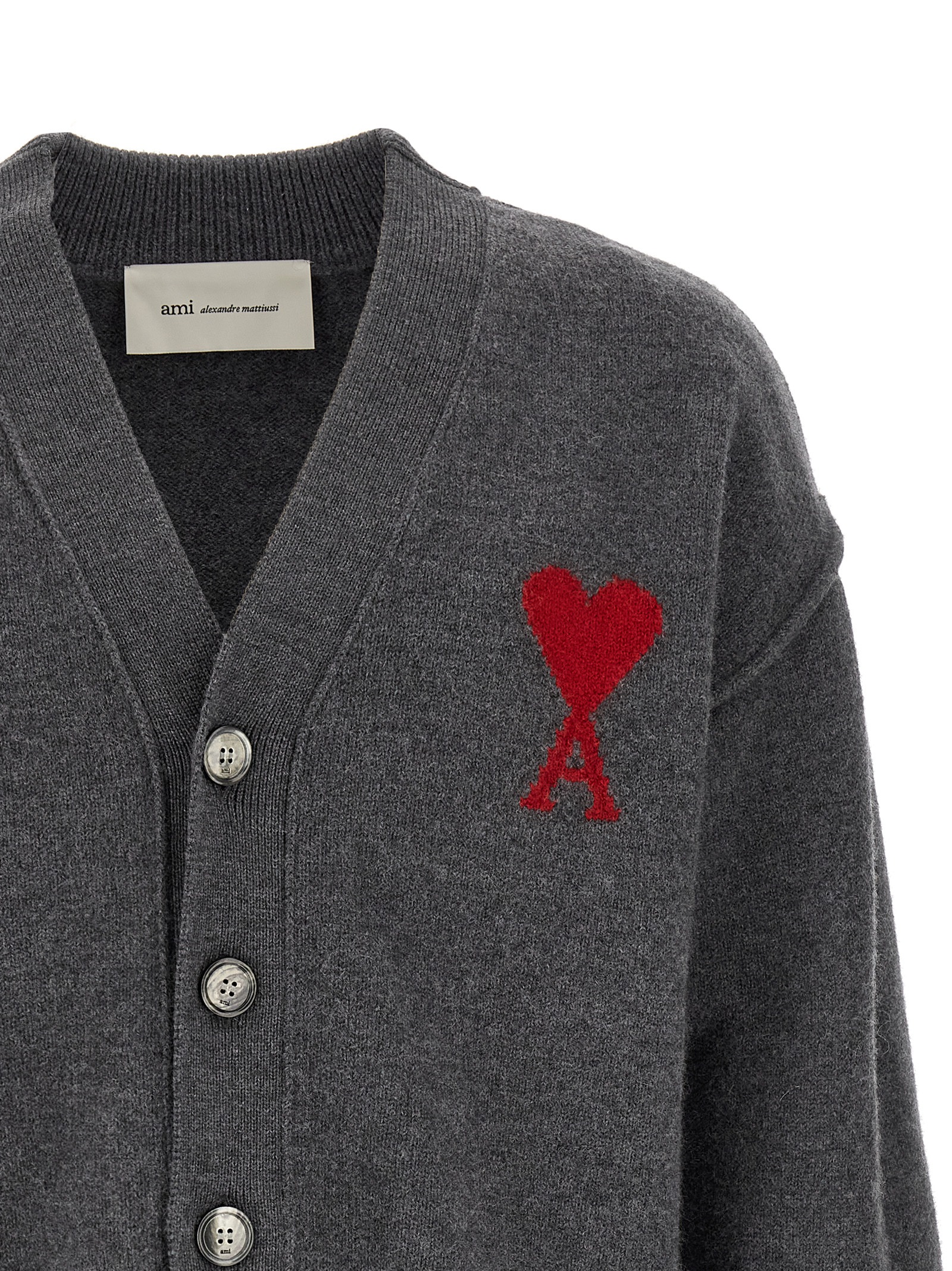 Felted merino wool cardigan knitted with front inlaid ‘Ami de Coeur’, V-neck, front button closure, long cuffed sleeves.