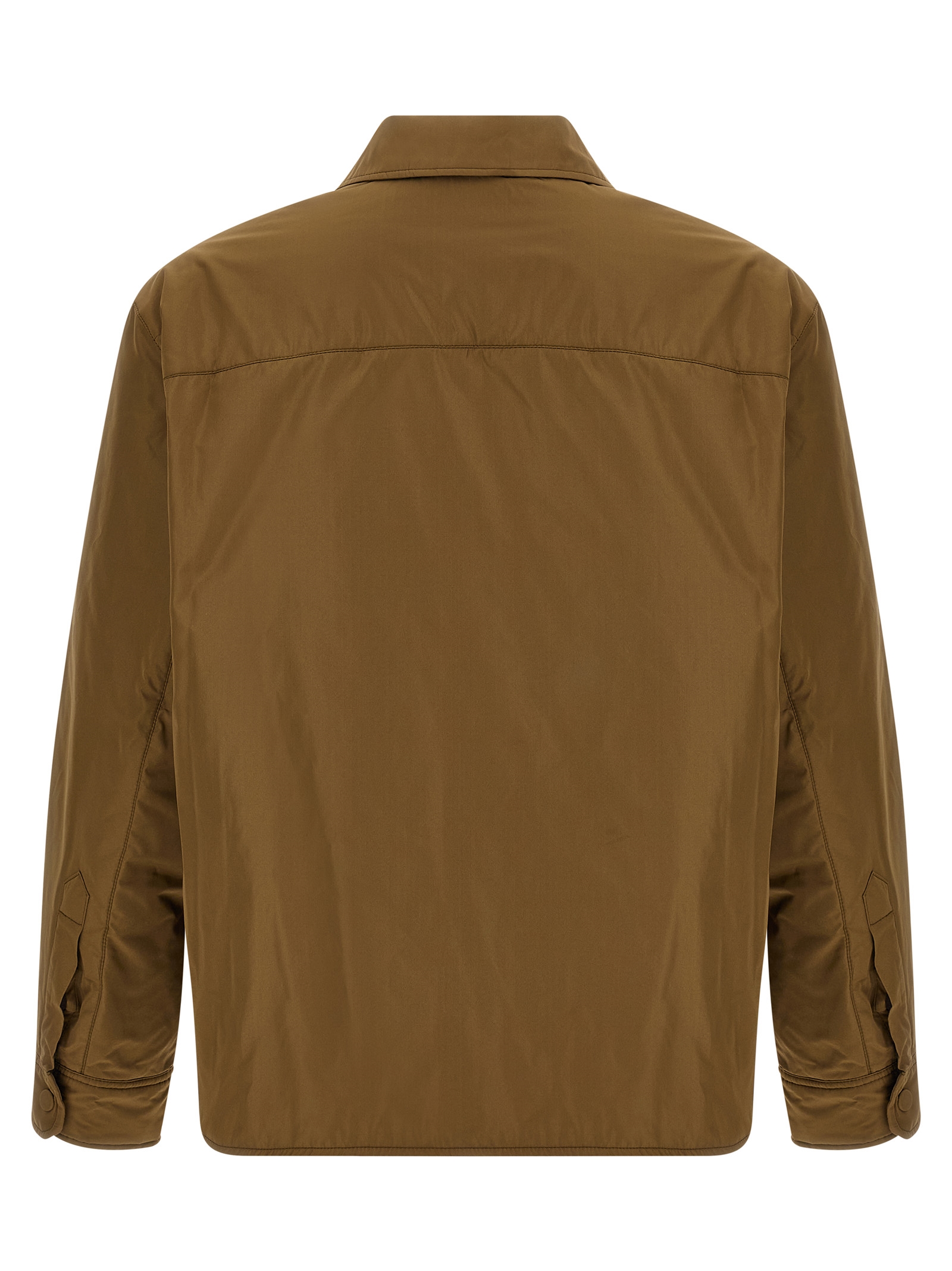 Synthetic fabric overshirt, wrinkled-effect fabric lining, collar, breast pocket with ‘Ami De Coeur’ embroidery, front snap button closure, long cuffed sleeves, side slits.