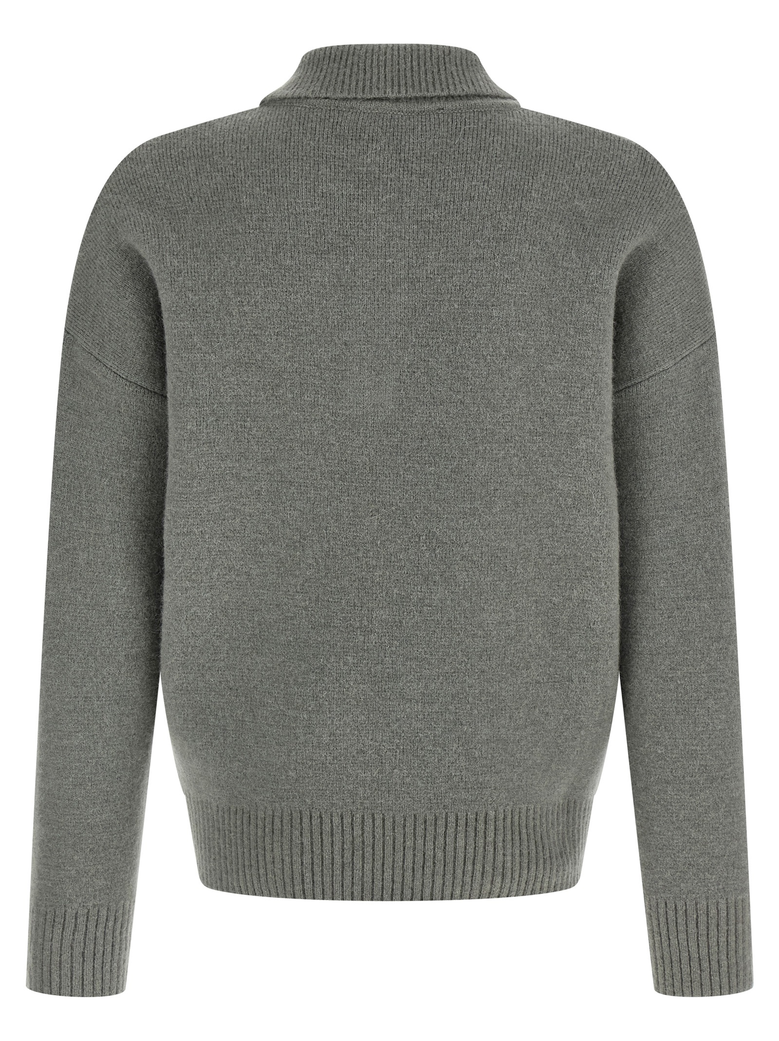 Felted merino wool knit polo shirt with contrast ‘Ami De Coeur’ intarsia on the front, collar and buttons, long cuffed sleeves and dropped shoulders.