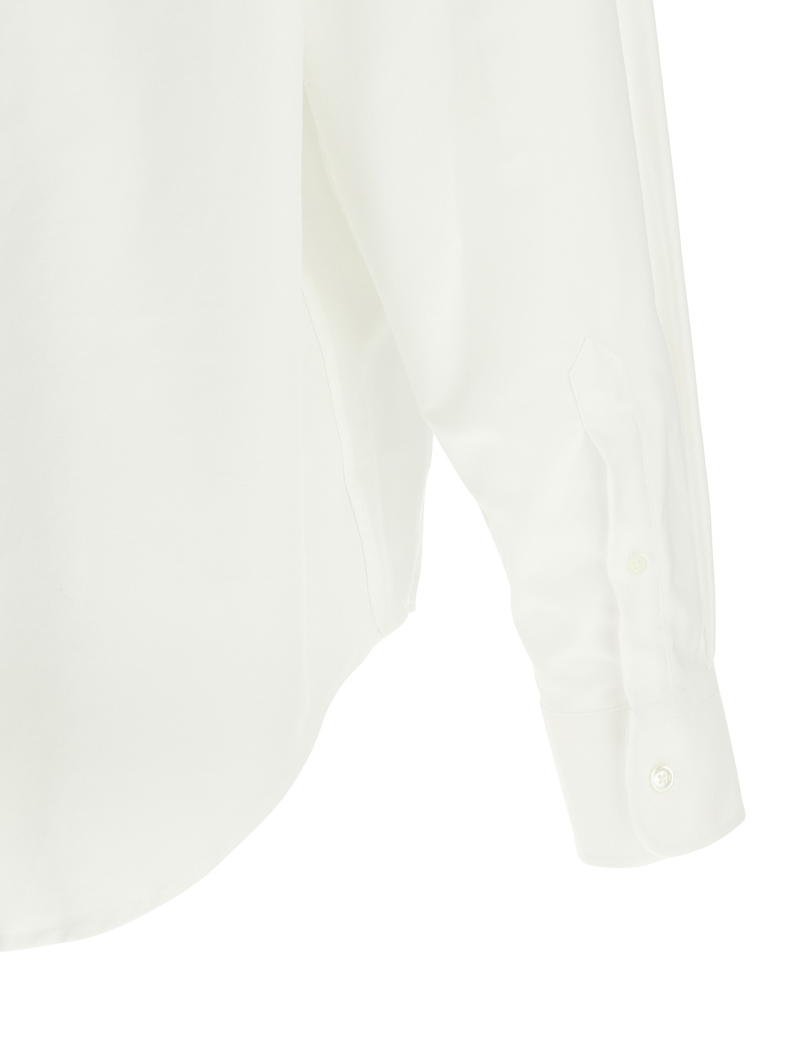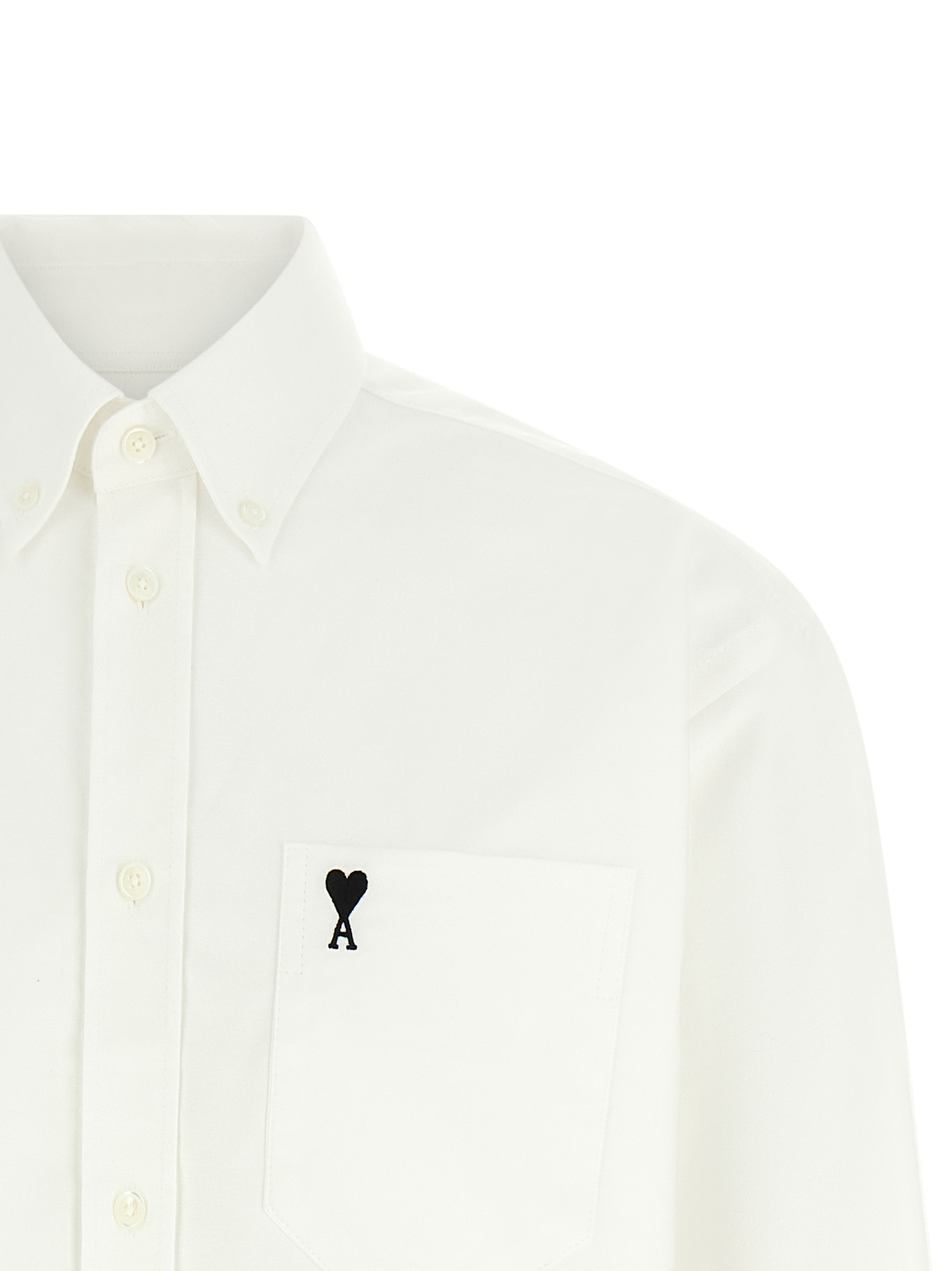Oxford cotton shirt with button-down style, pocket with contrasting ‘Ami de Coeur’ embroidery, front button closure, long sleeves with cuffs and dropped shoulders, asymmetrical and rounded hem.