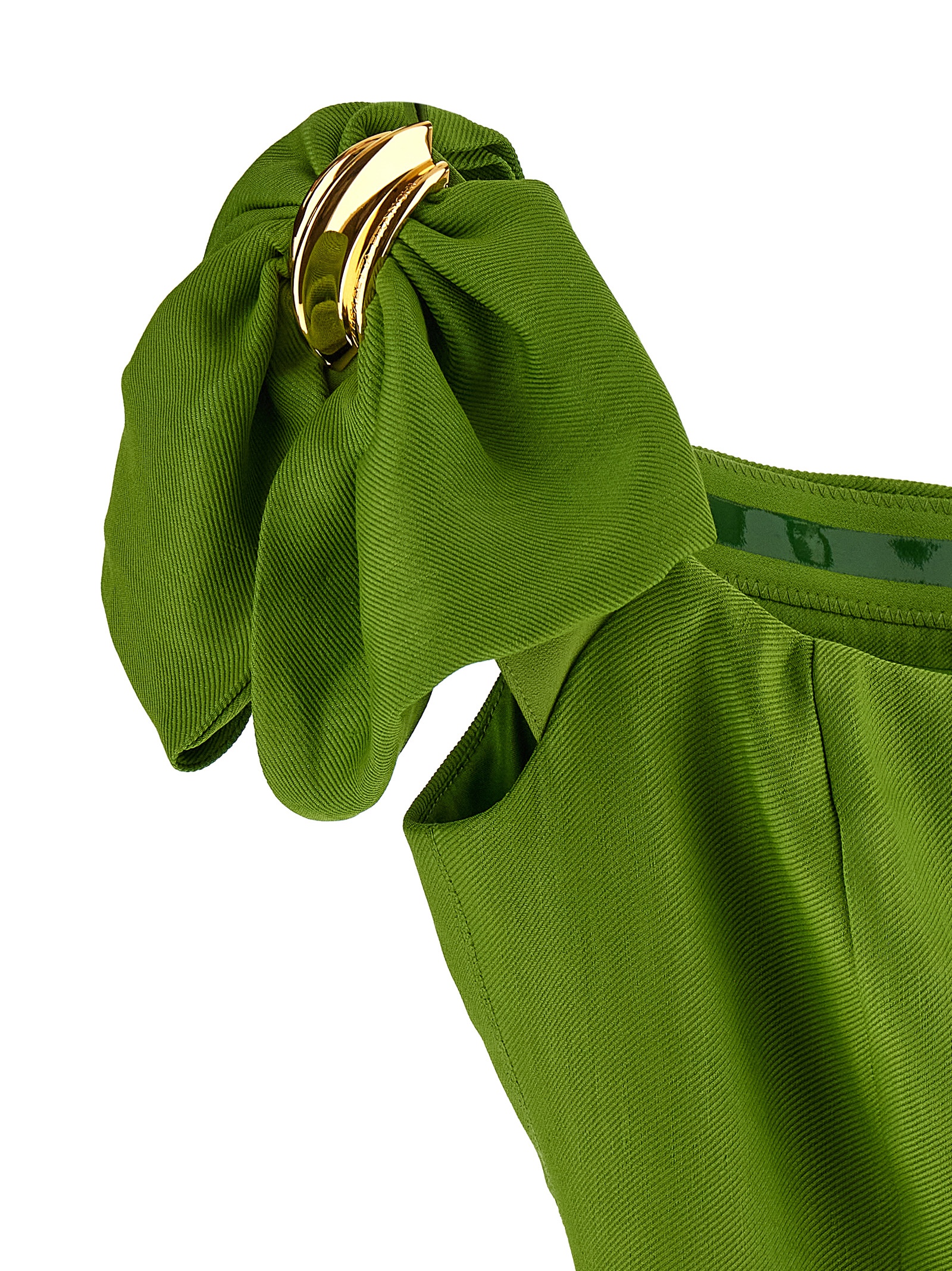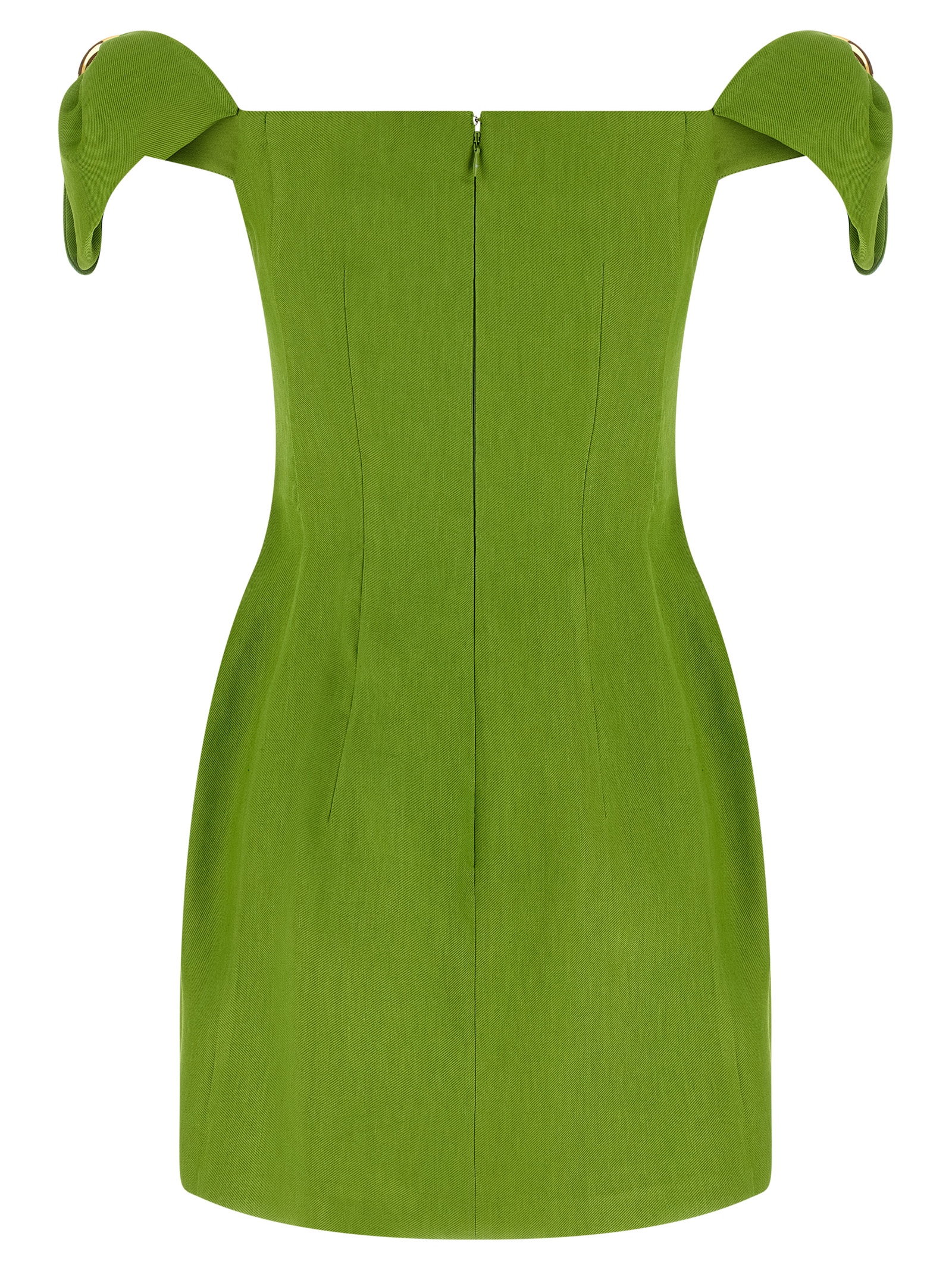 Mini dress in linen and viscose blend, amphora construction, off the shoulder model with square neckline on the front and back, short sleeves with metal detail to recreate the shape of a bow, back zip closure, satin lining.