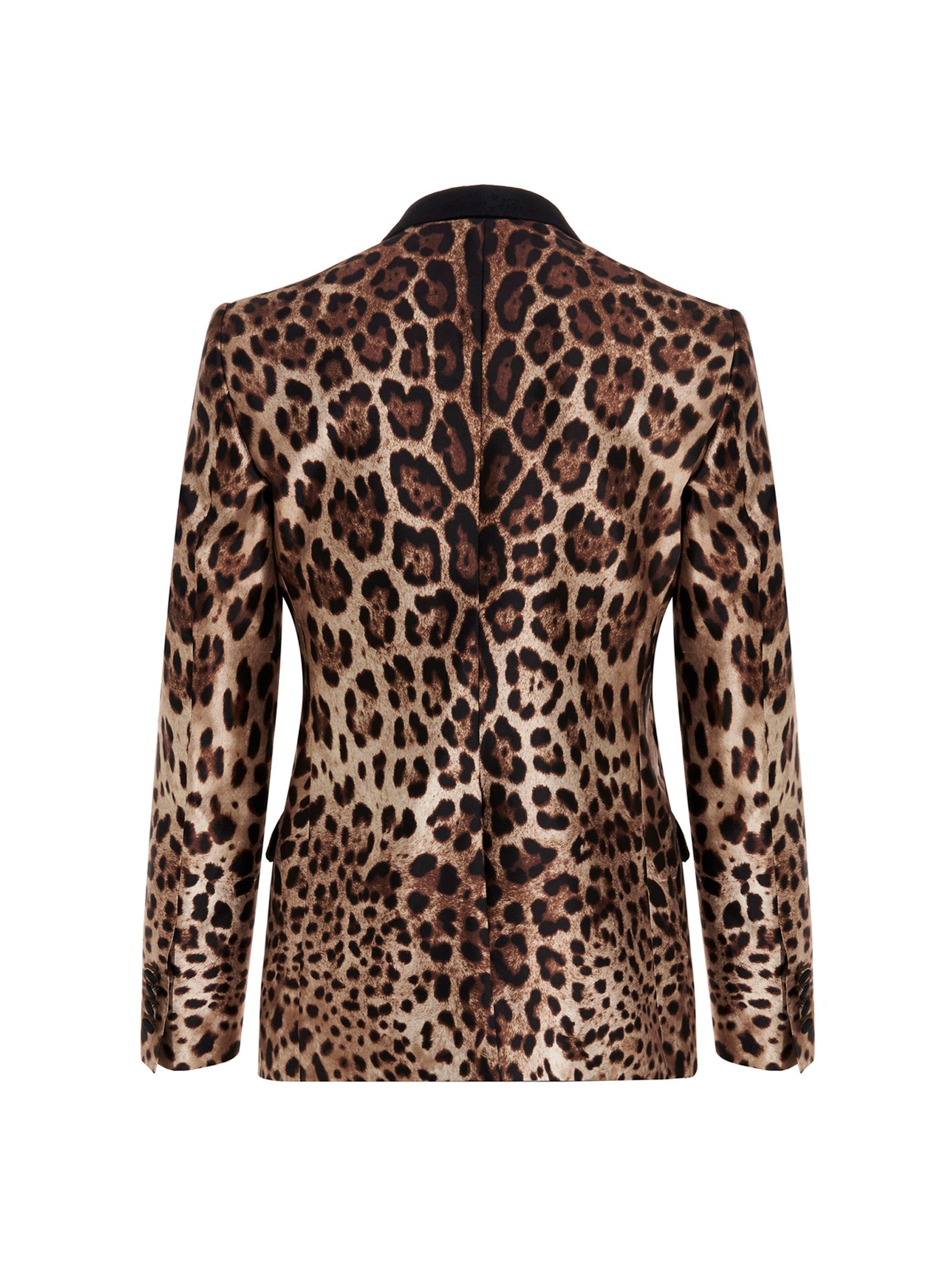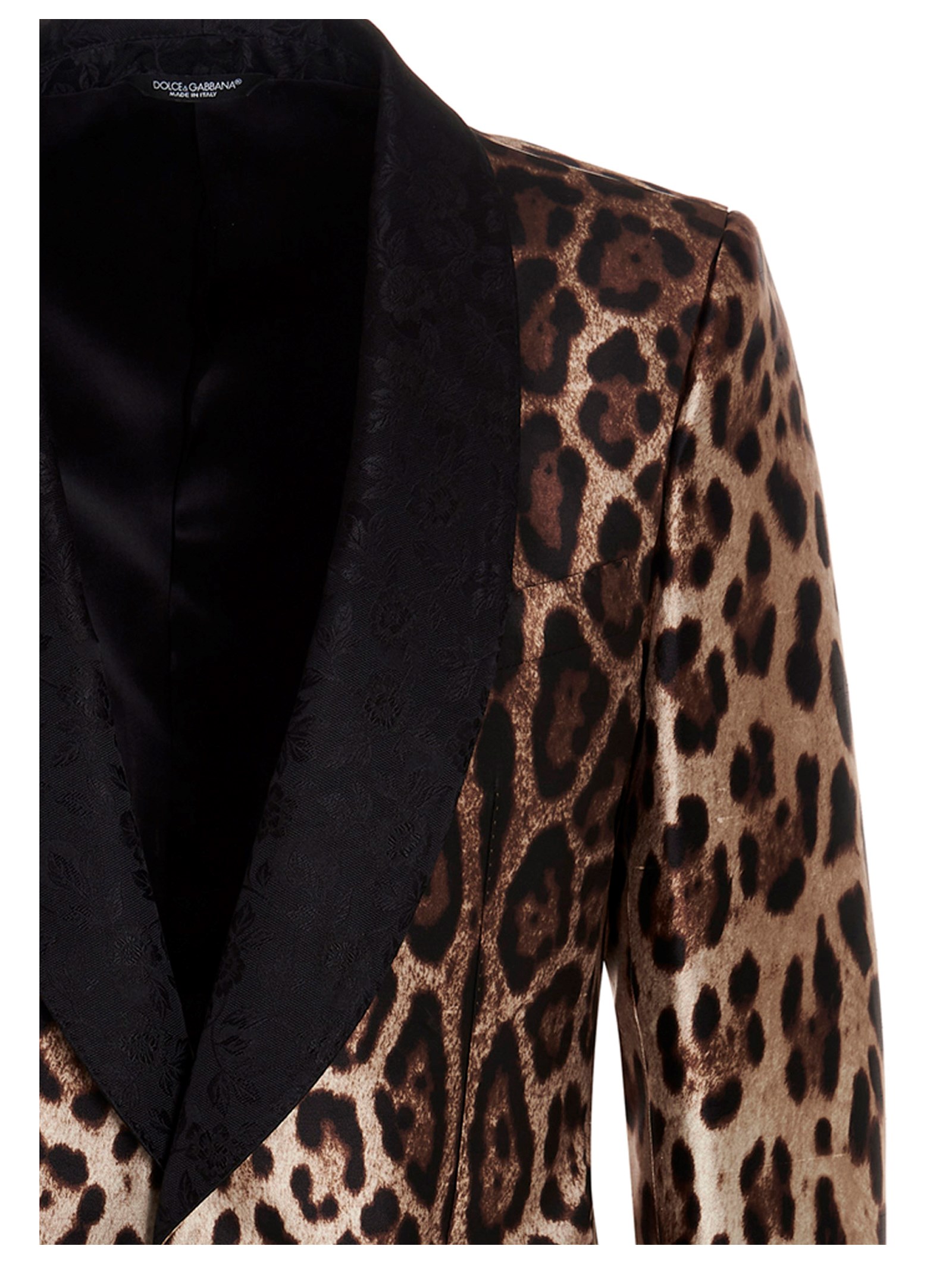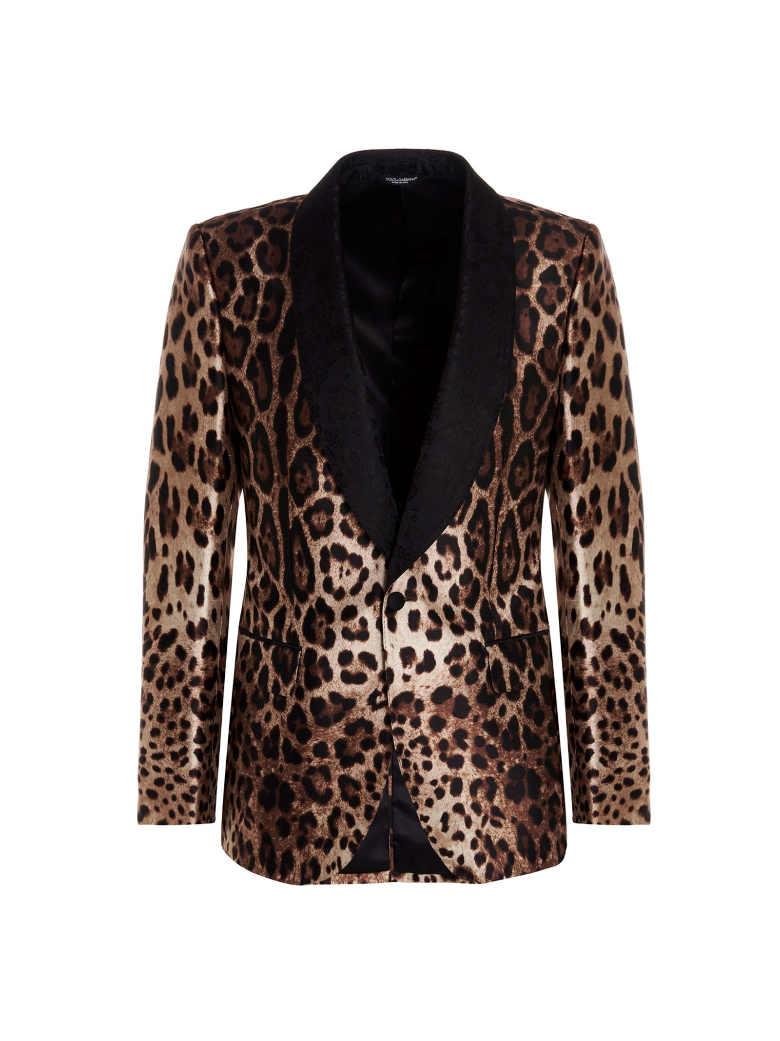 Animal print silk suit made up of a single breast animal print blazer jacket with padded shoulders and a slit on the back, brocade satin lapels, brocade patterned trousers with a zip and button.