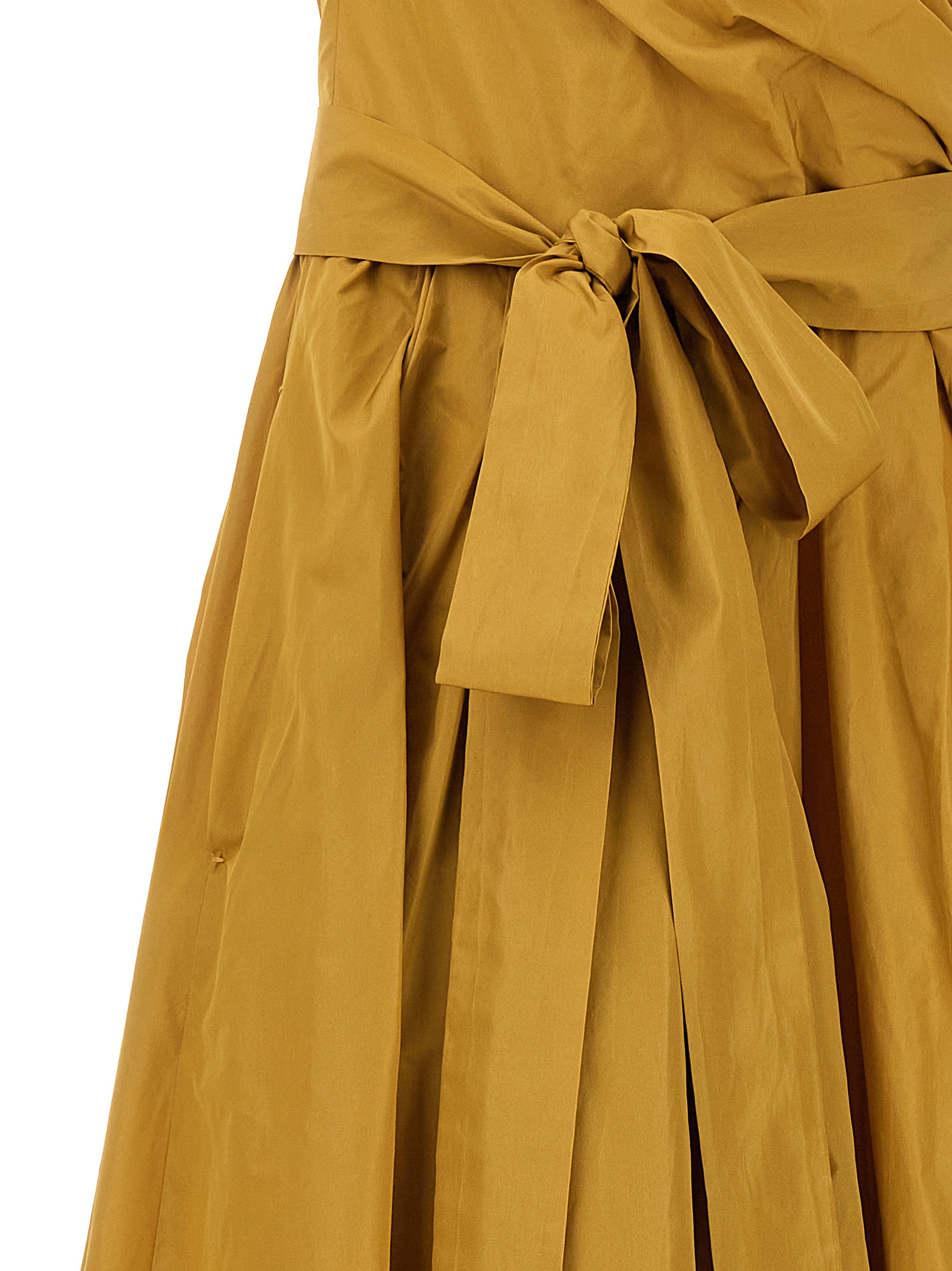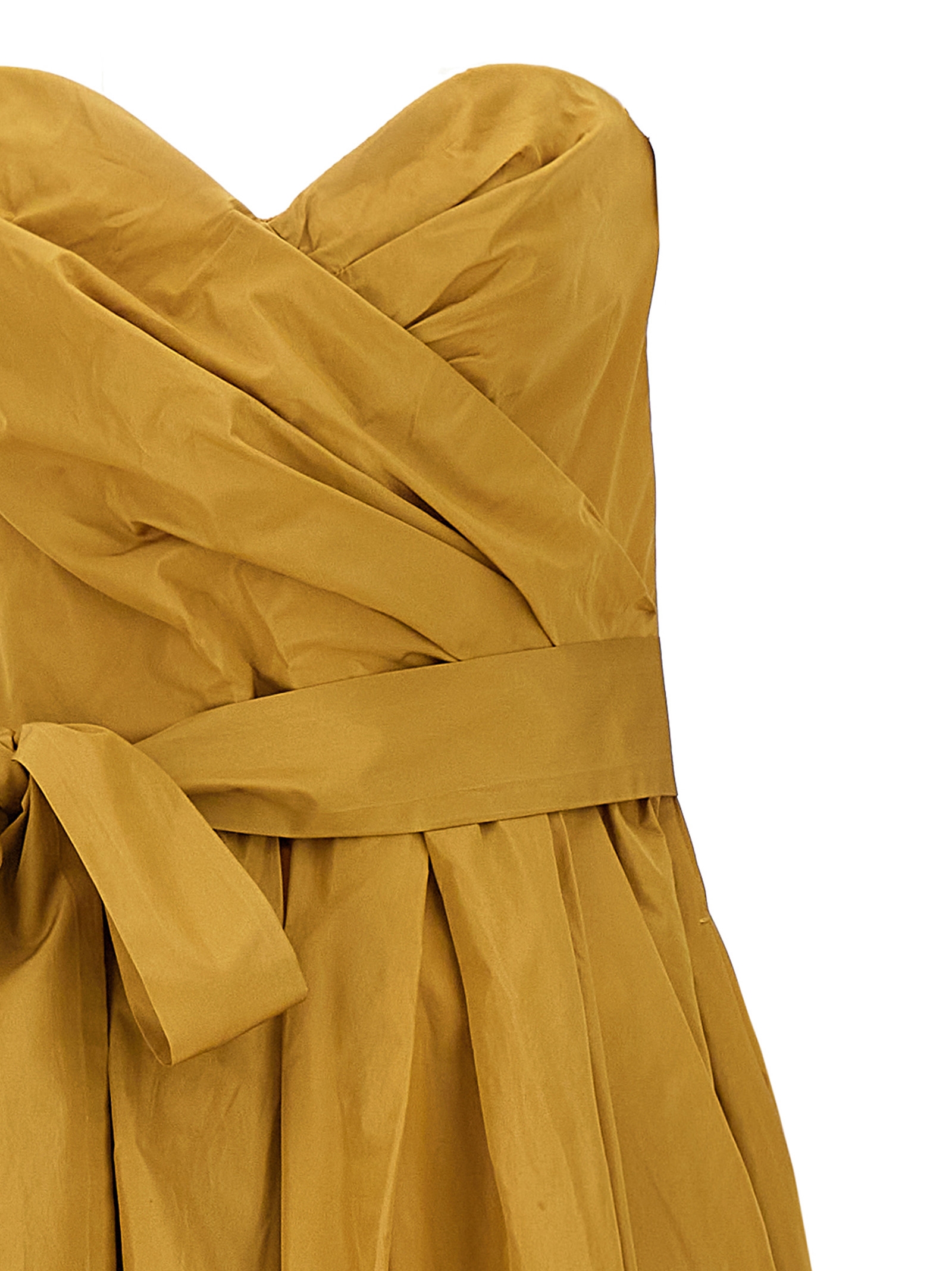 Corset-style Anzio dress in long silk taffeta blend, embellished with elegant draping with matching belt at the waist, lining, and back zipper closure.