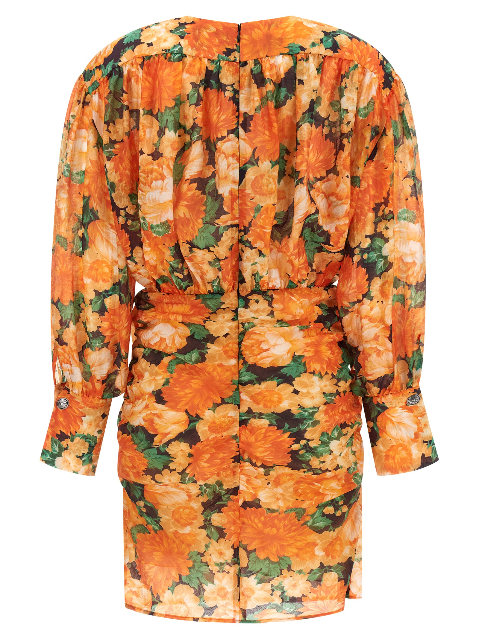Mini ‘Apericena’ dress in lightweight voile fabric of flamed effect lyocell blend with all-over ‘Botanic Garden’ print, wide upper part with deep front V-neck with ribbons to cross and tie as desired, long balloon sleeves with slightly flared buttoned cuffs, back zip closure, straight skirt with draping and curls, lining.
