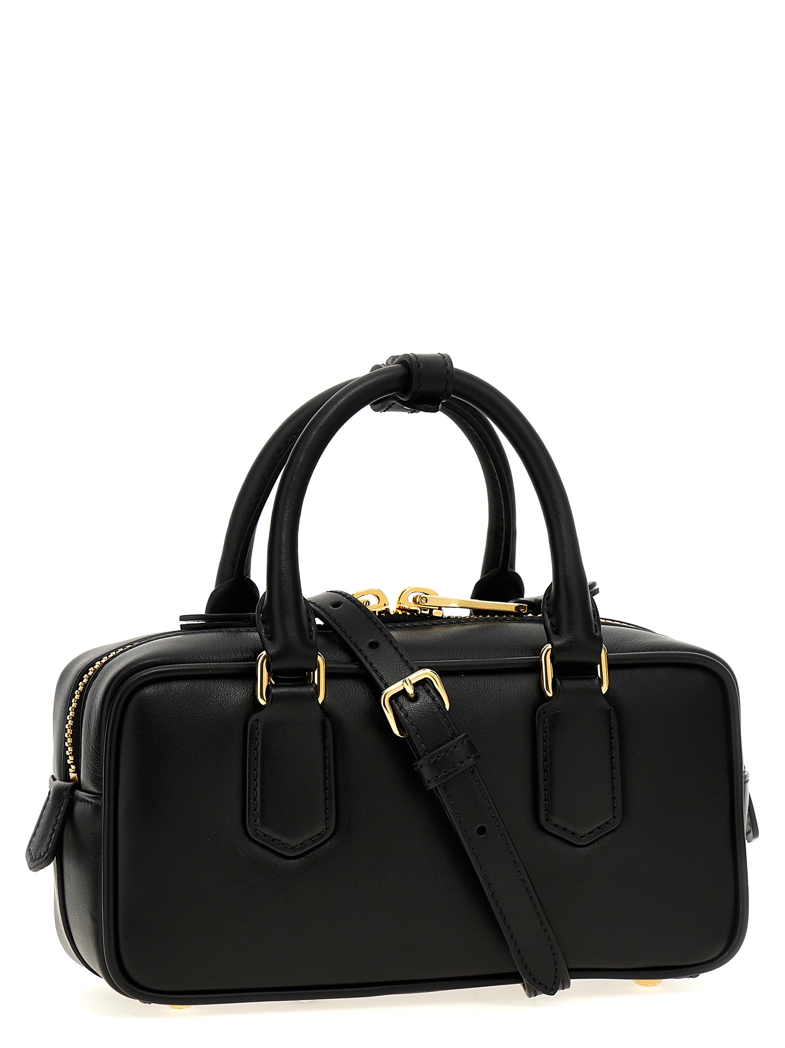 ‘Arcadie’ nappa handbag with tone-on-tone metal logo on the front, zip closure, double handle, adjustable and removable shoulder strap.