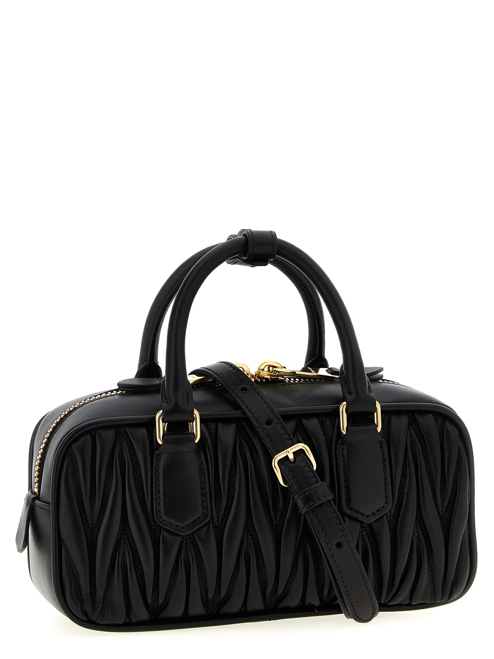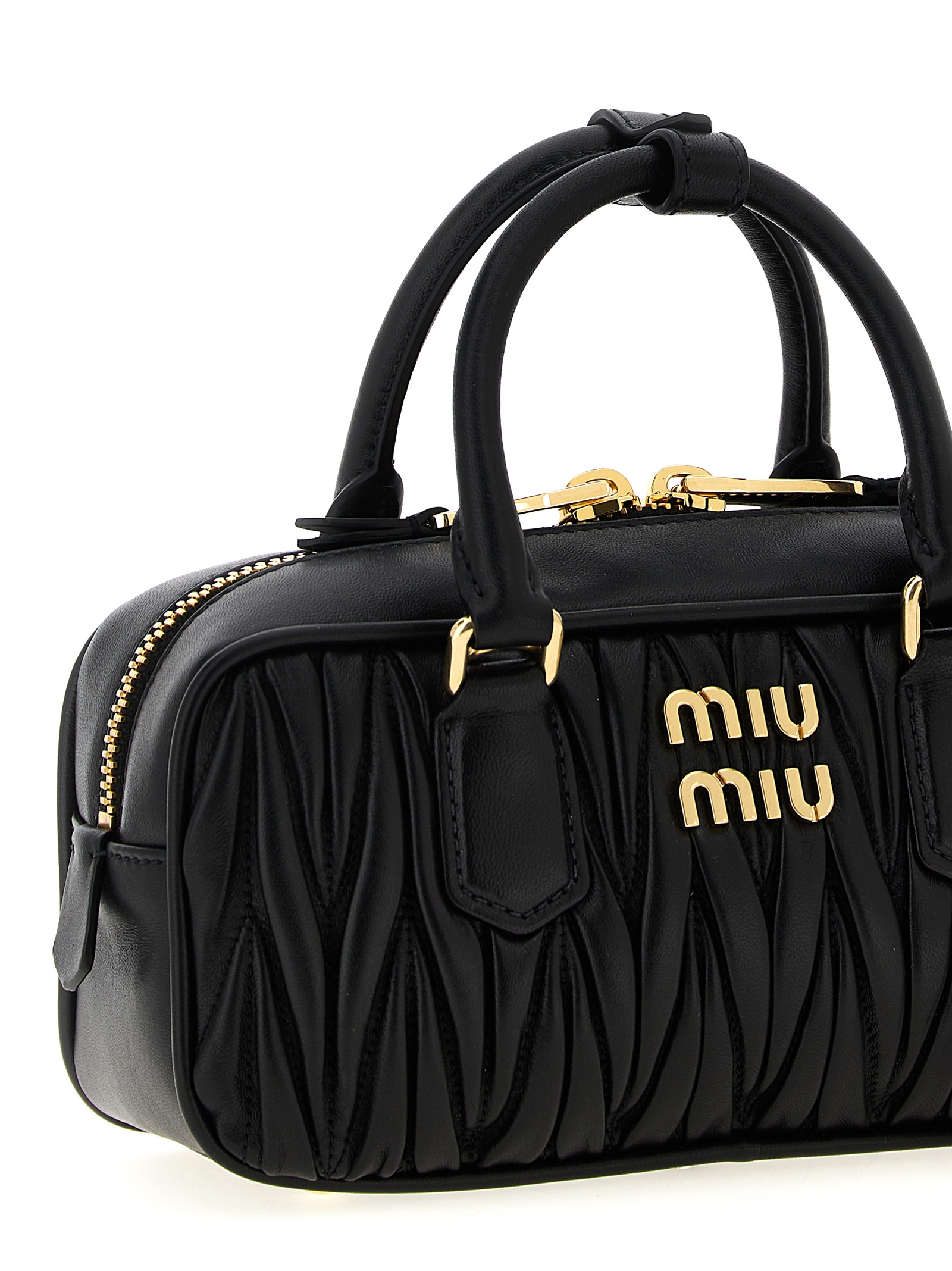 ‘Arcadie’ matelassé nappa leather handbag, front metal lettering logo, top zip closure, double fixed handle, adjustable and removable shoulder strap, removable keyring.
