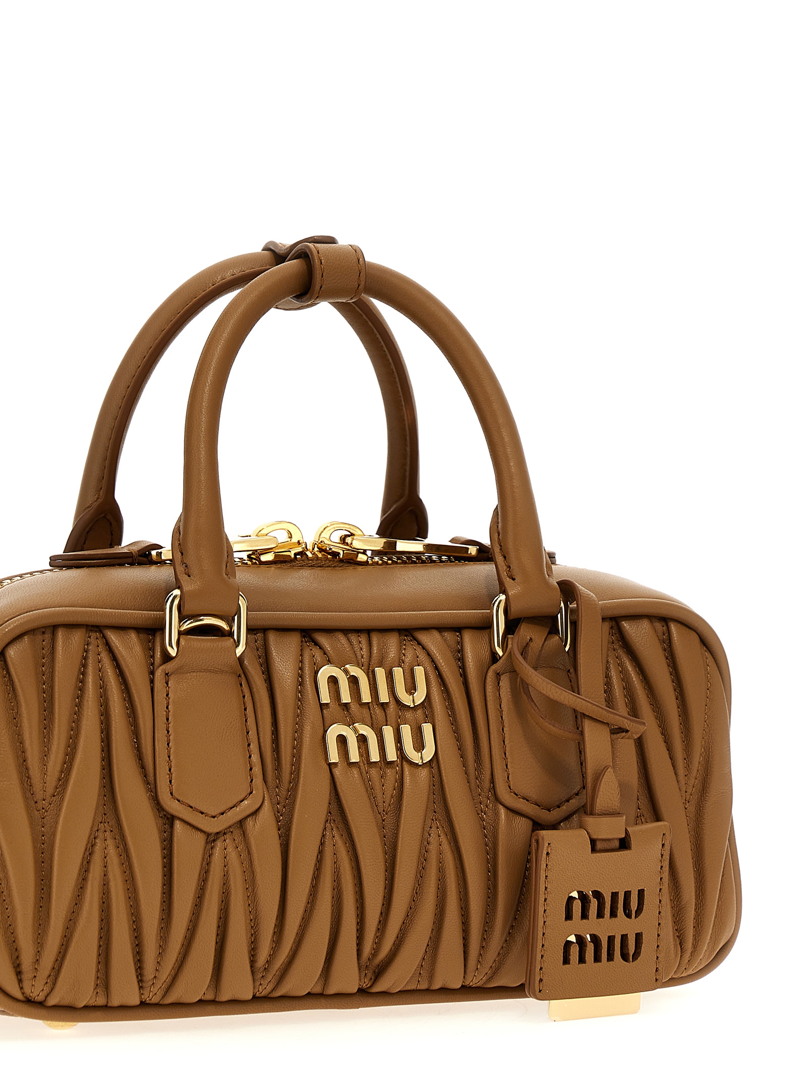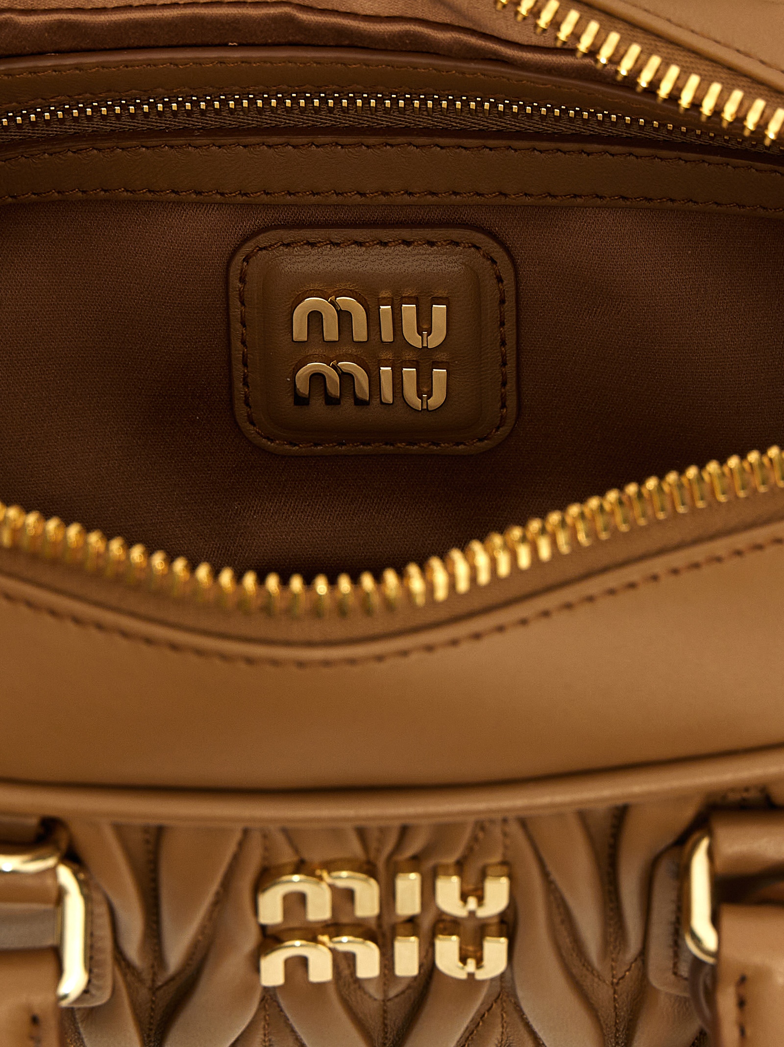 ‘Arcadie’ matelassé nappa leather handbag with front metal logo, zip closure, double handle, adjustable and removable shoulder strap.