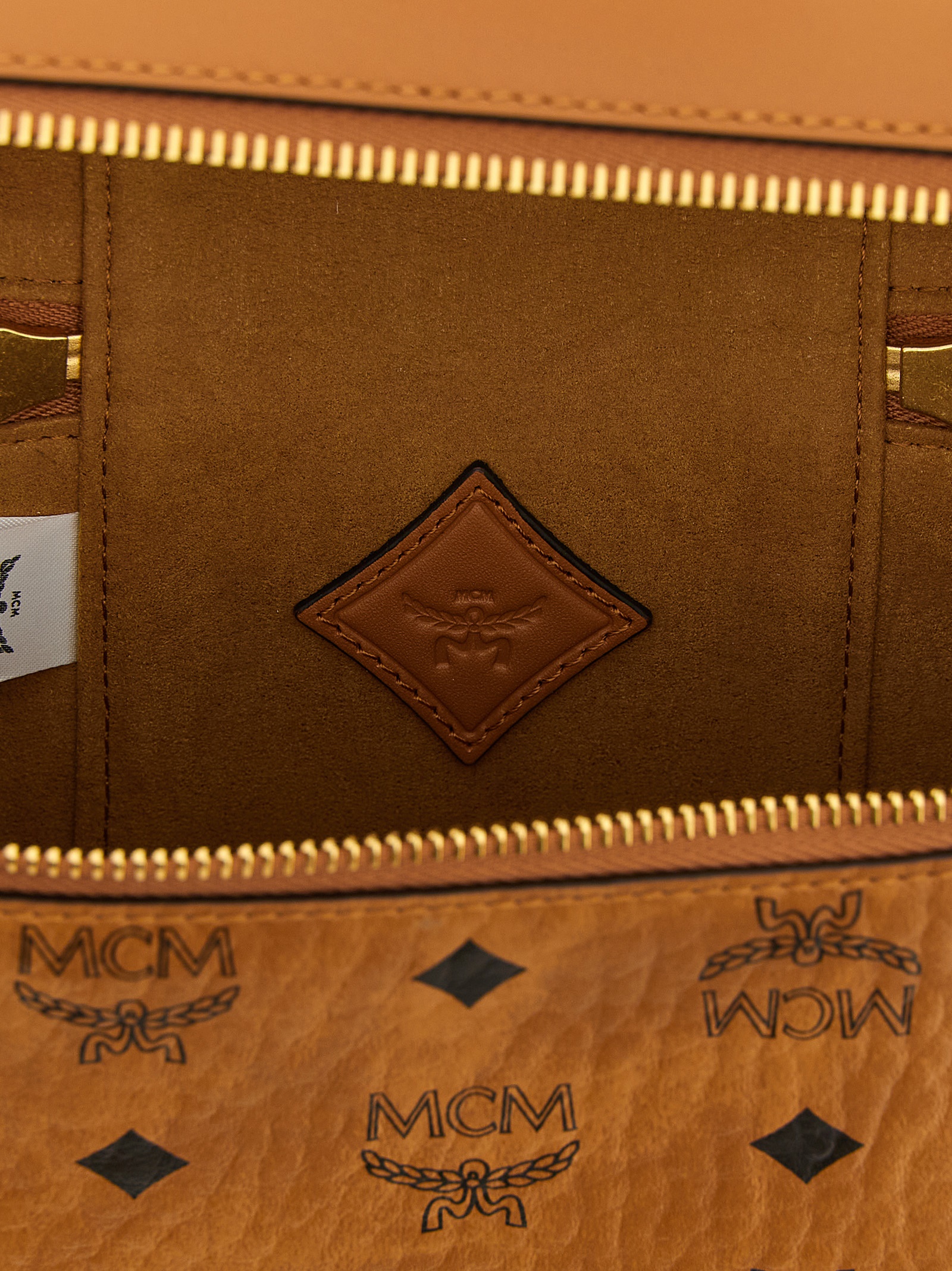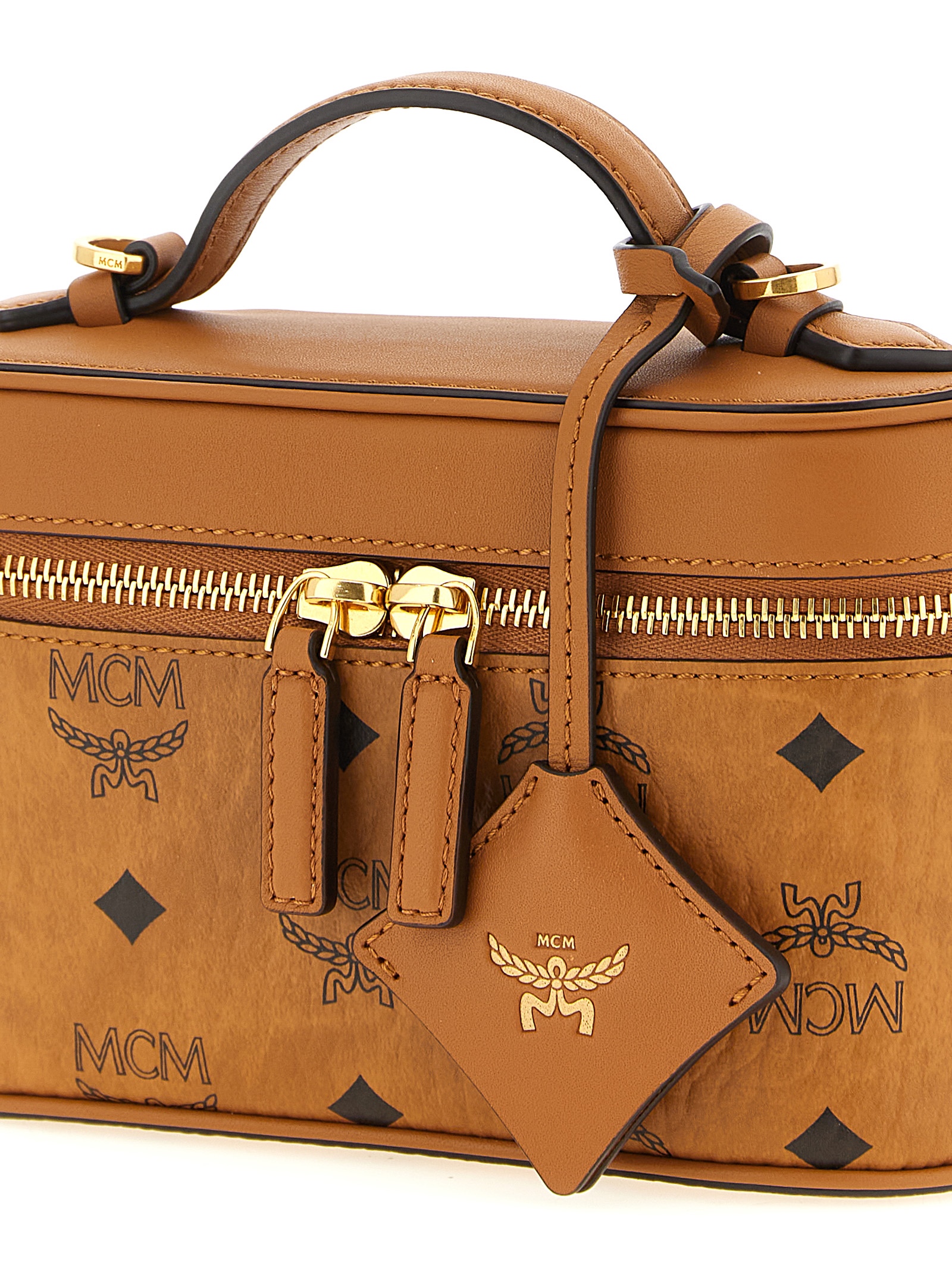 in Visetos monogram canvas with natural leather details, fixed handle, zip closure, microfiber lining with suede finish, adjustable and removable shoulder strap, removable ‘Bavarian Diamond’ charm.
