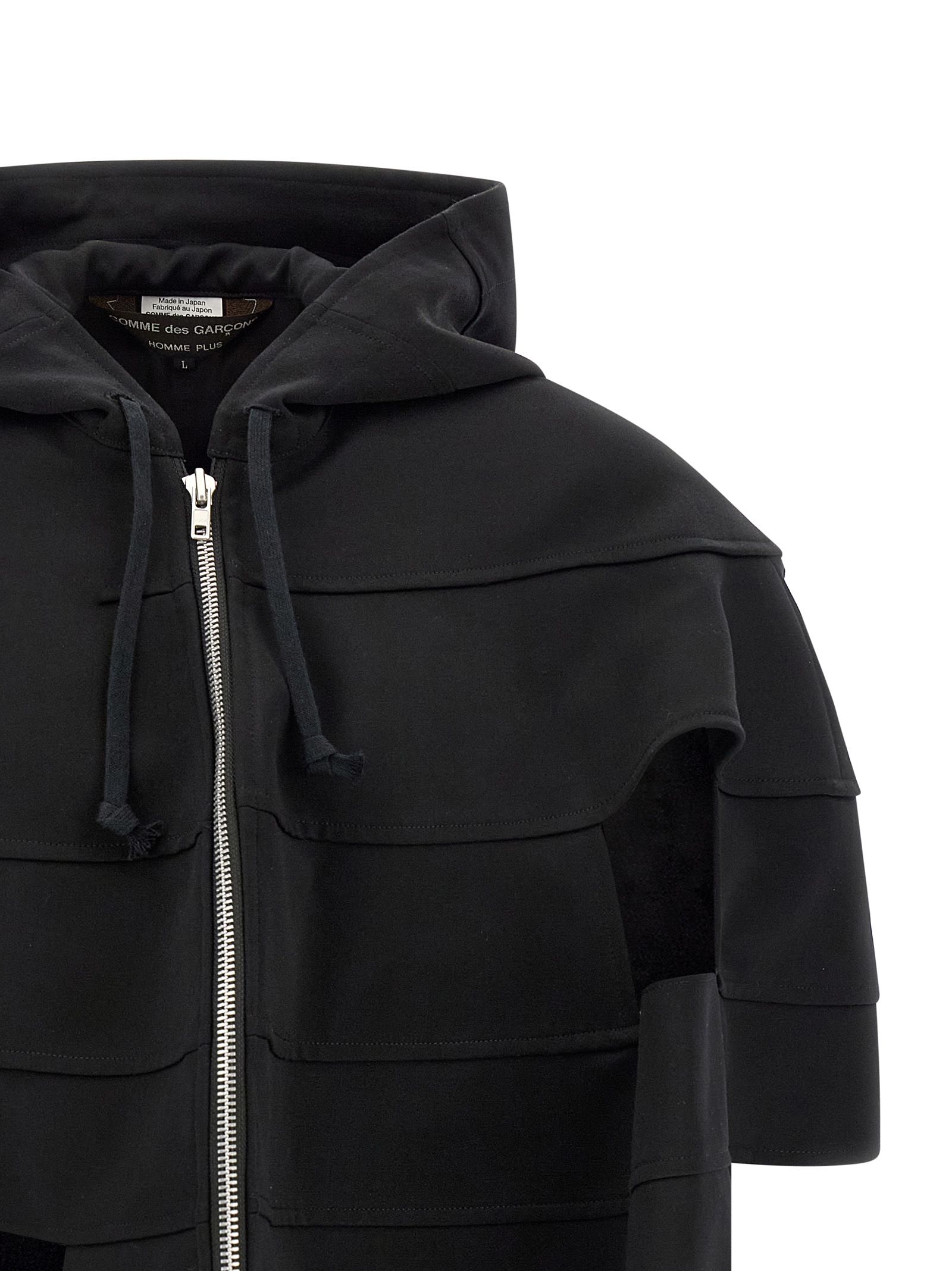 Wool jacket, armor-inspired construction, cut-out details to pass through the arms, adjustable hood, front zip closure, pockets, cupro lining.