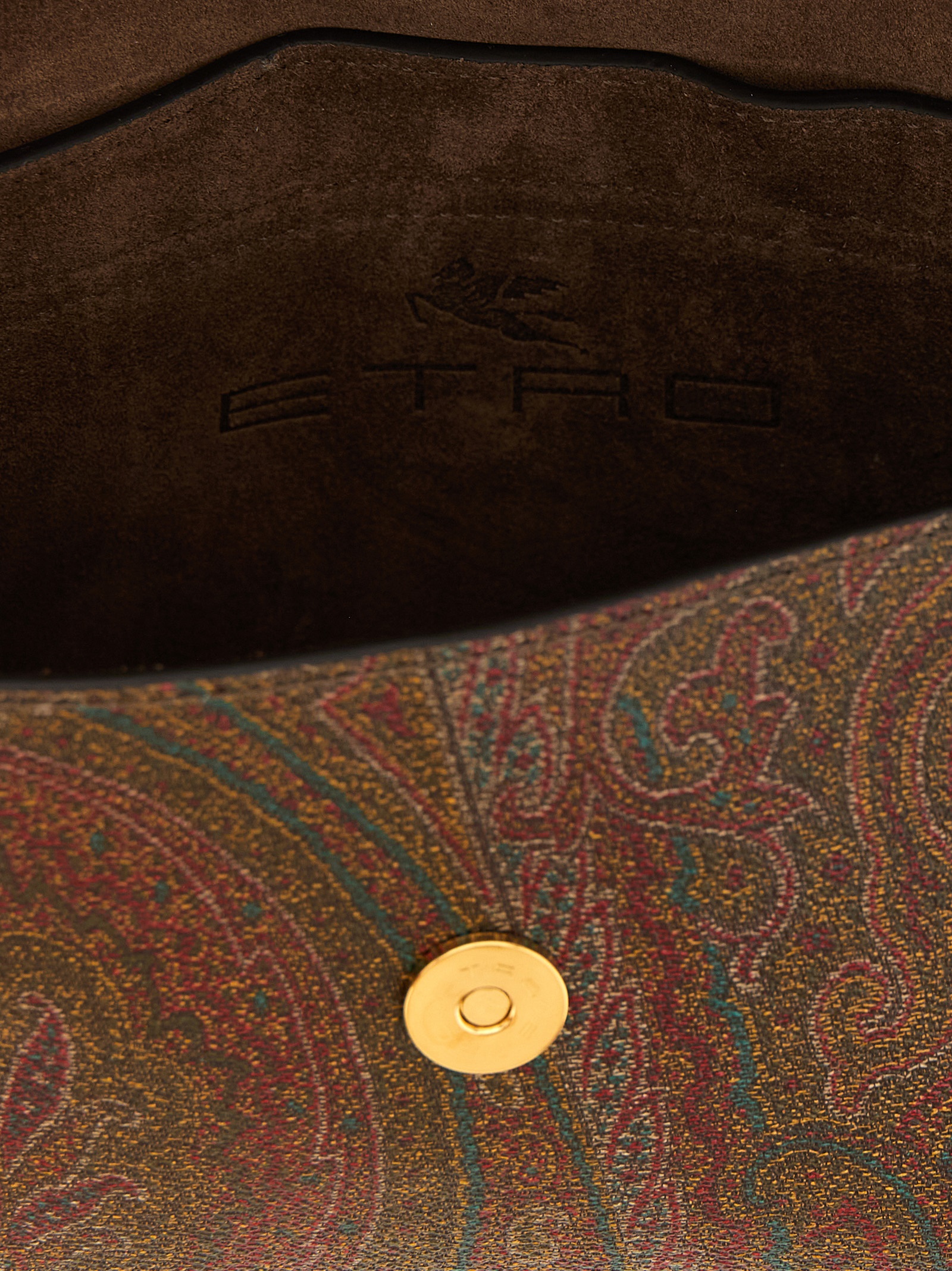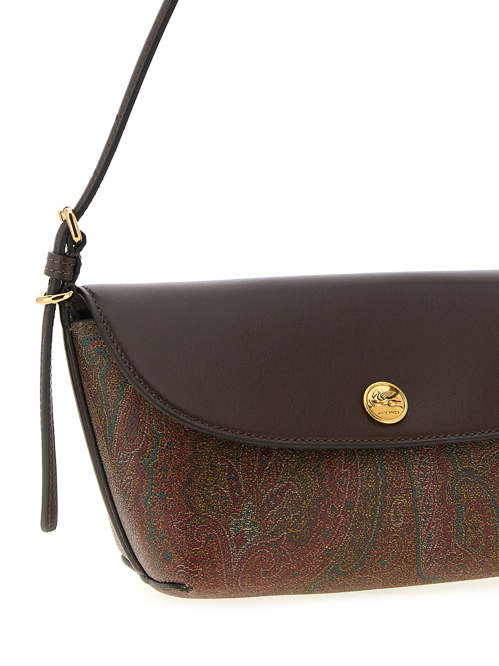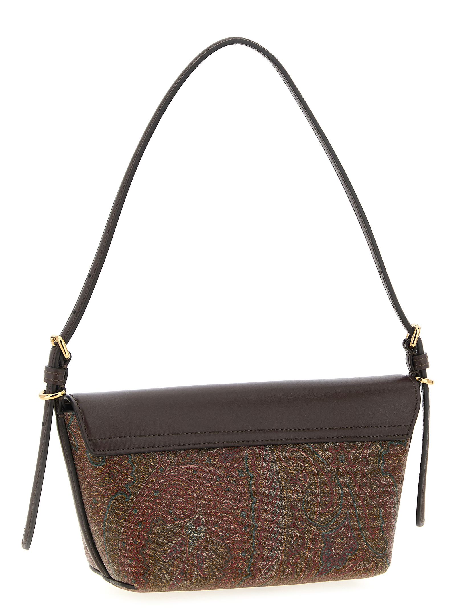 Small shoulder bag in matt-grain coated Paisley jacquard cotton fabric with canvas and leather doubled in canvas and leather, boat style, magnetic flap closure with front engraved logo button, adjustable handle.