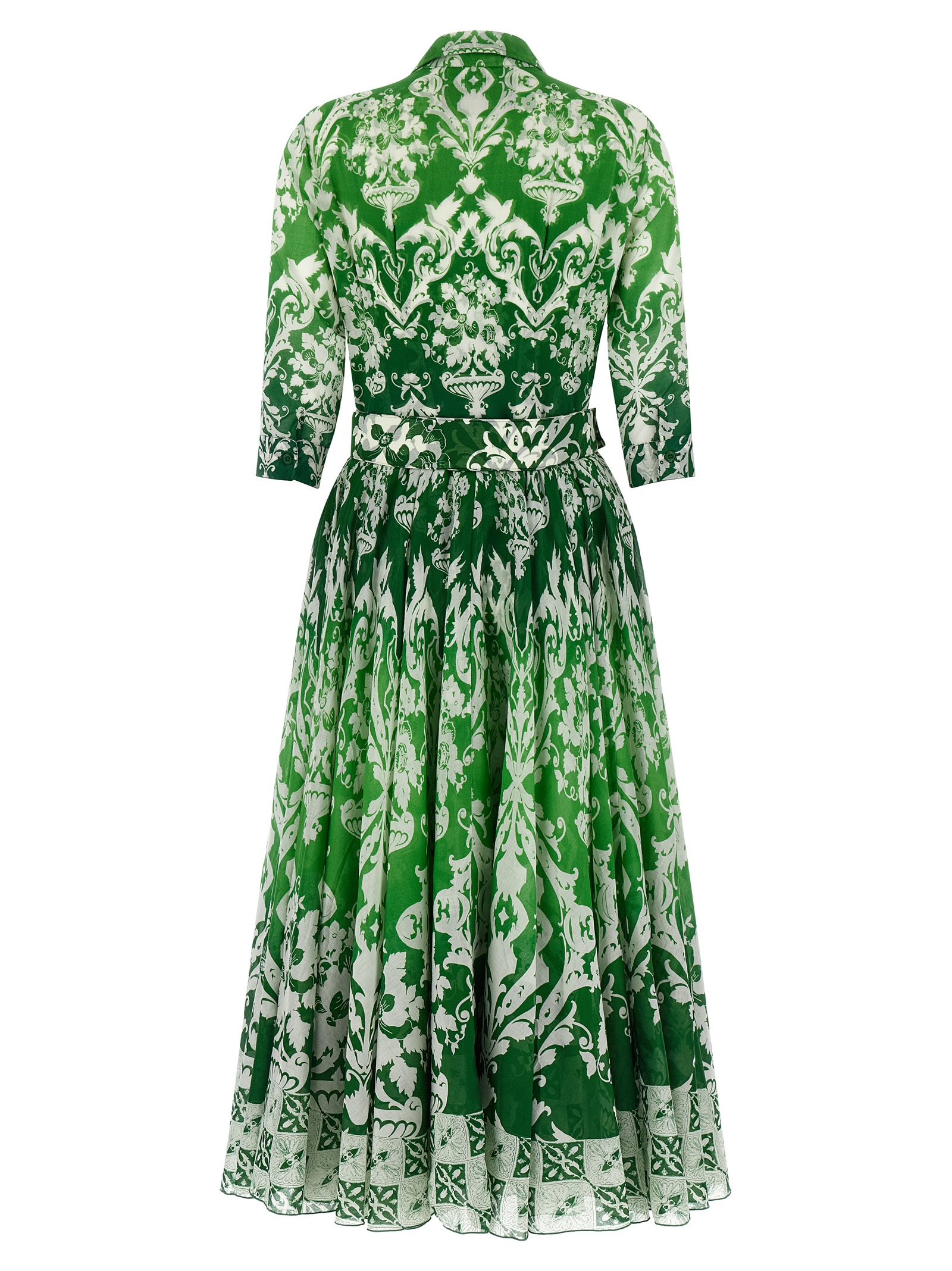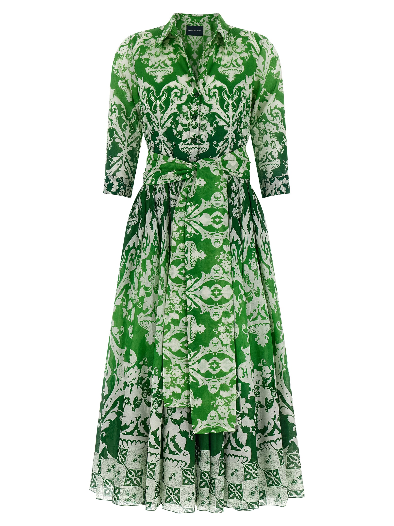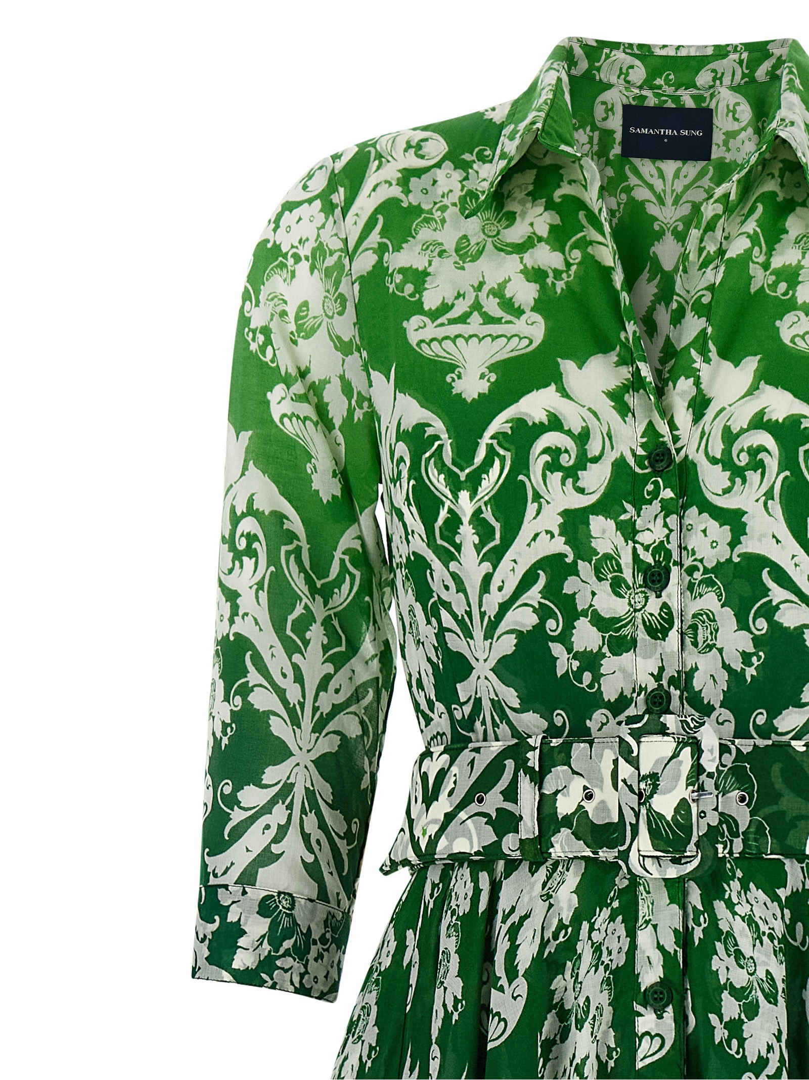 All over print cotton muslin ‘Aster’ midi dress with front button closure, 3/4 sleeves, full skirt, underskirt, removable pockets, belt and sash detail.