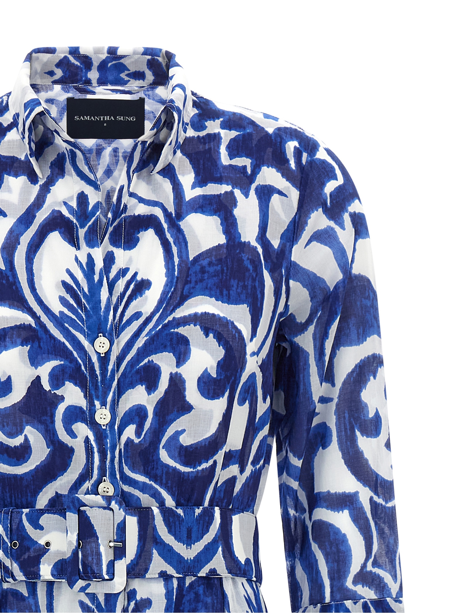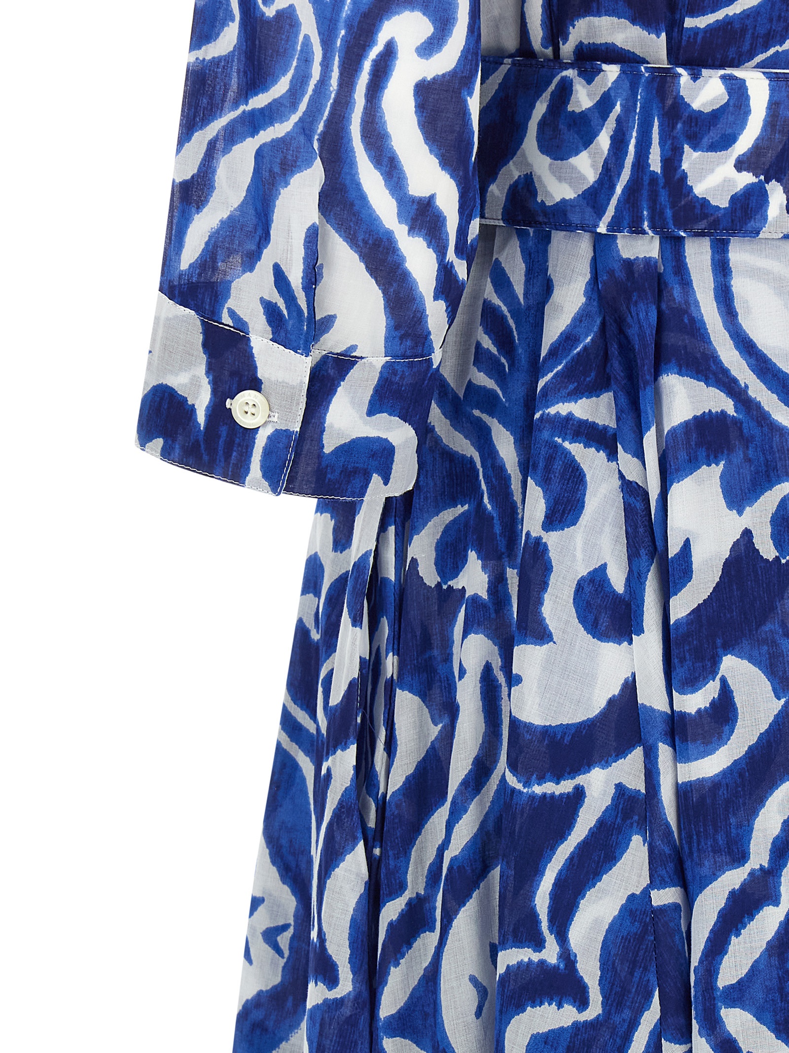 All over ‘Maiolica Blue Tile Aster’ cotton muslin midi dress with front button closure, 3/4 sleeves, full skirt, underskirt, removable matching belt, pockets, belt and sash.