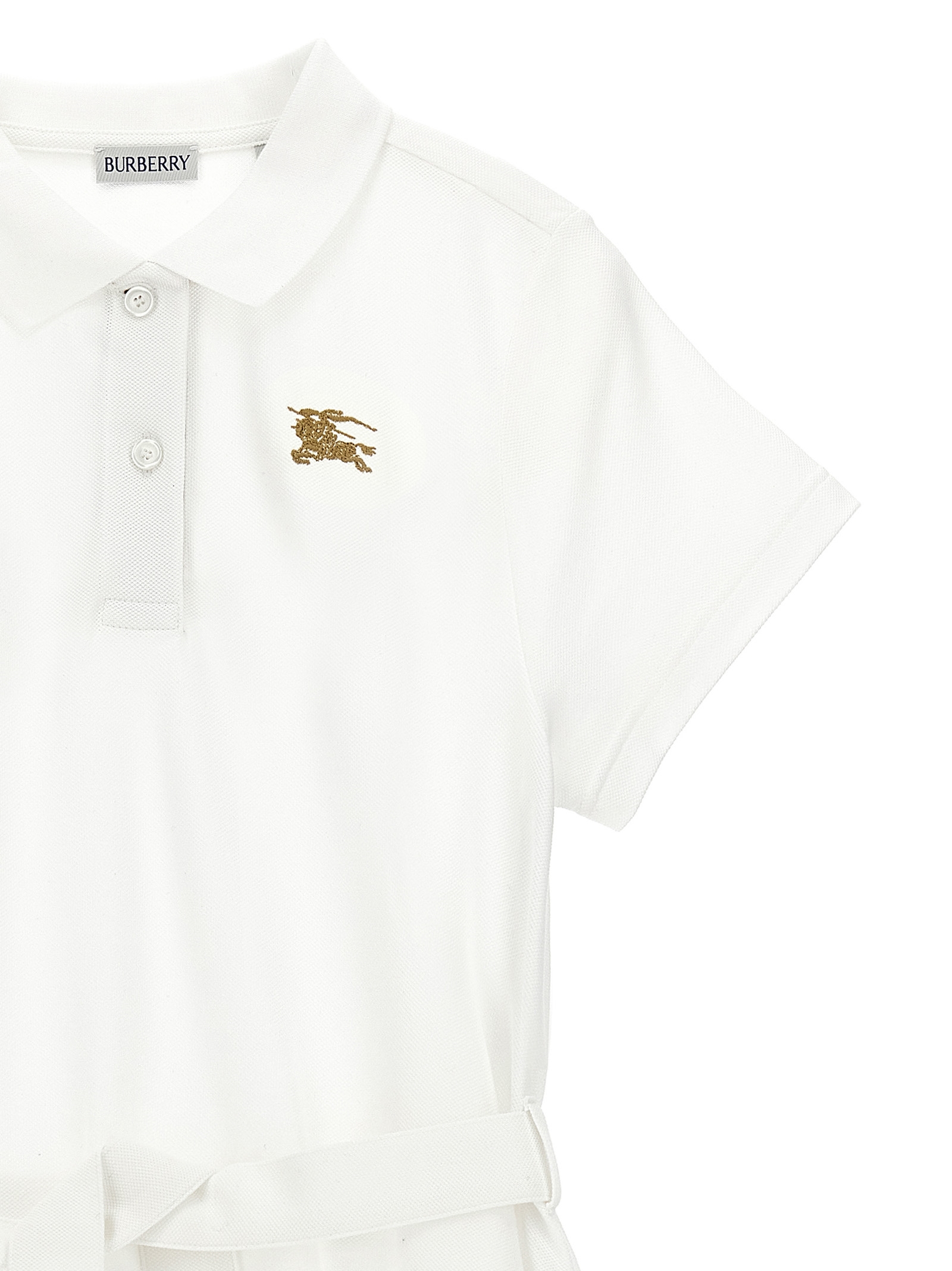 ‘Astrid’ cotton piqué polo dress with collar and buttons, front logo embroidery, short sleeves, full skirt, removable belt.