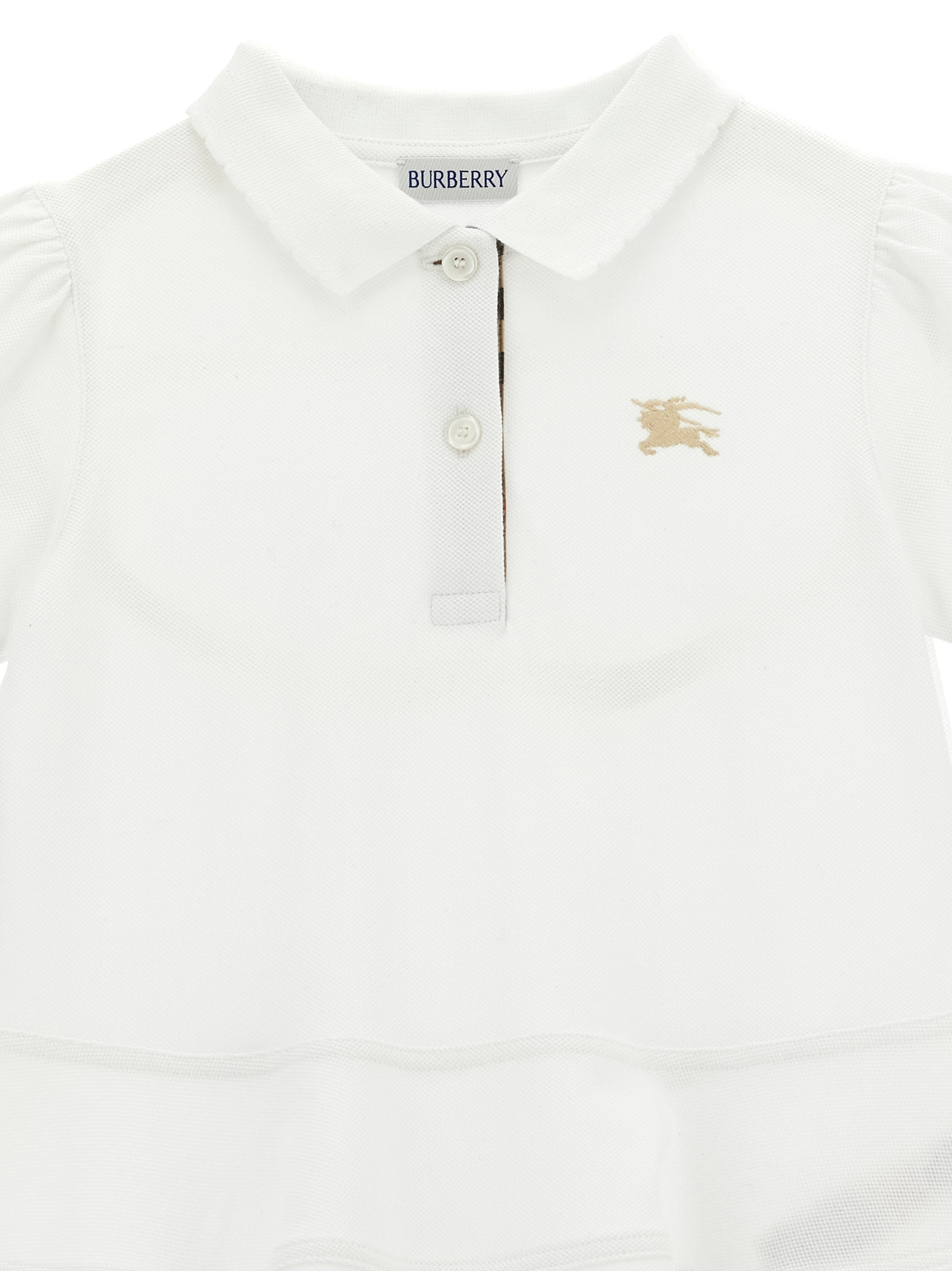 ‘Astrid’ cotton piqué polo dress with collar and buttons with Burberry Check placket, front ‘Equestrian Knight Design’ embroidery, short puff sleeves with scalloped trims, flared skirt.
