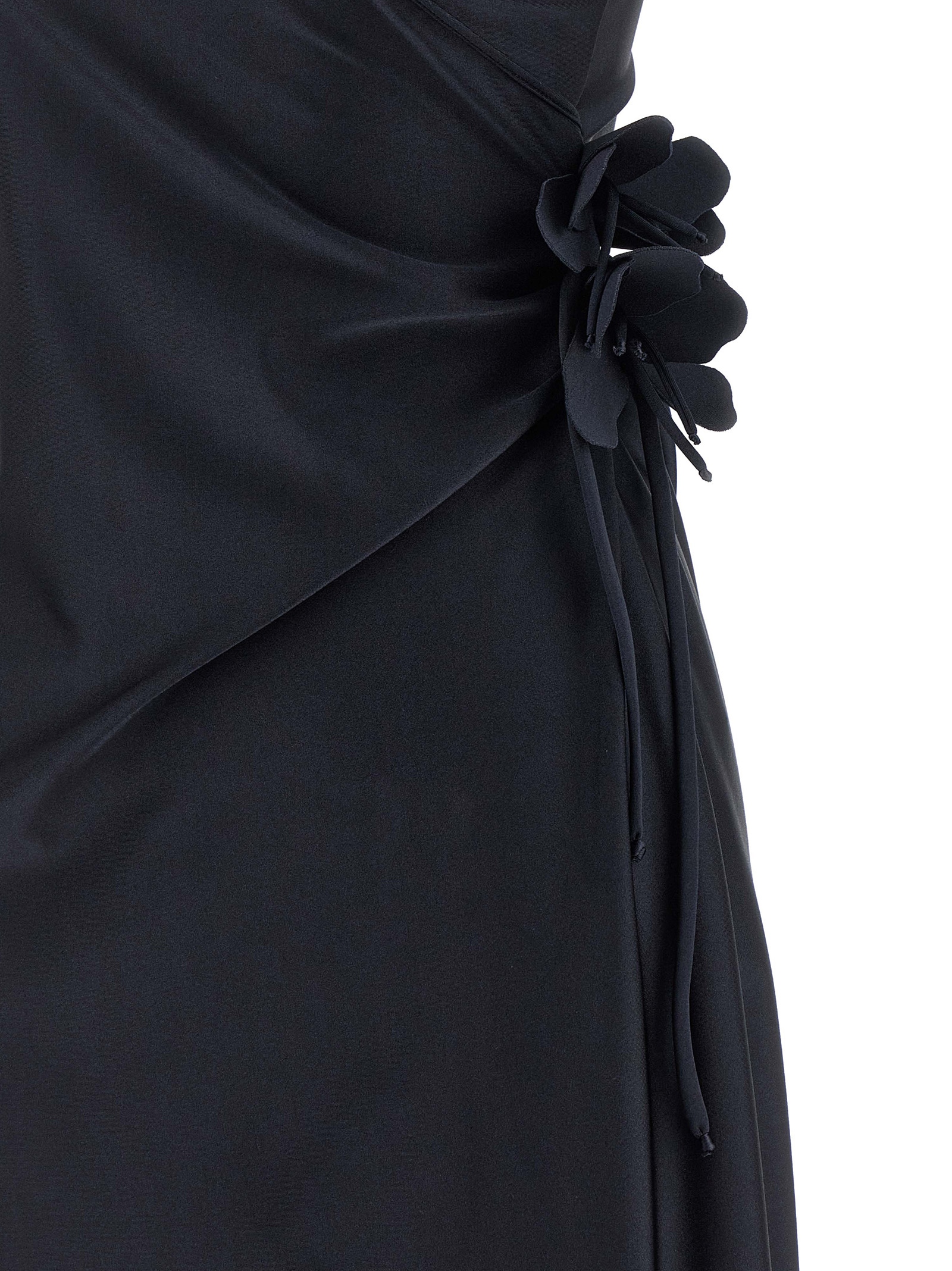 ‘Asymmetric Mini Flower’ midi dress in stretch technical jersey, one-shoulder model, front cut-out detail, brand petal knots on the shoulders and waist, sleeveless, side split, asymmetrical hem.