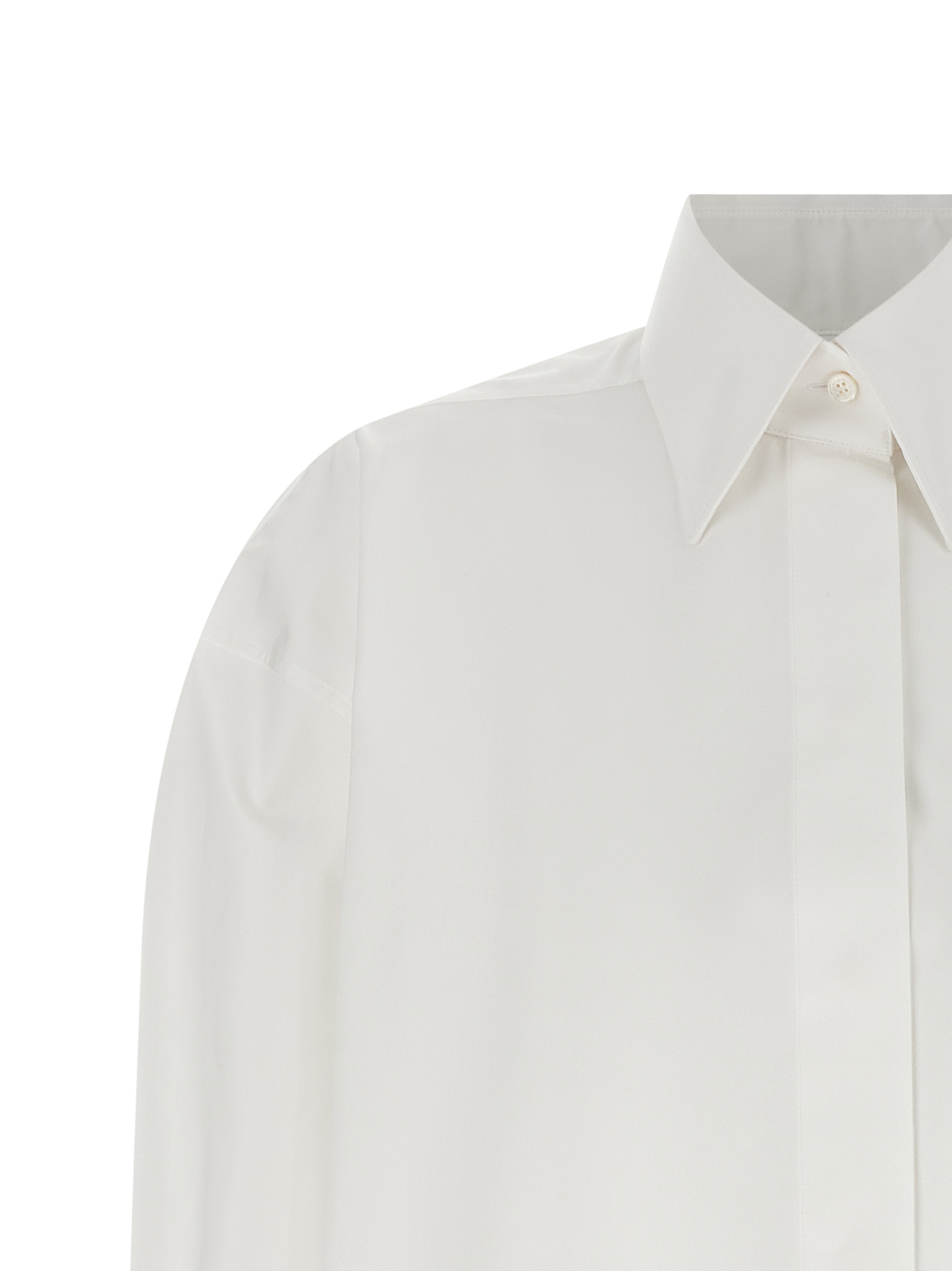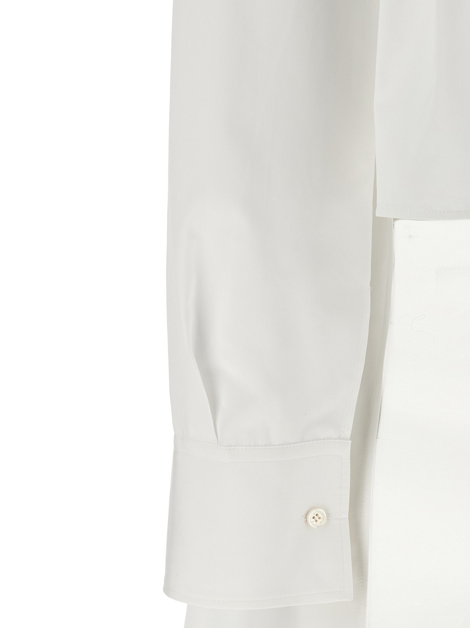 Cotton poplin shirt, asymmetrical construction with front part to be left loose or tied in a bow, pointed collar, concealed front button closure, long sleeves with French cuffs and dropped shoulder.