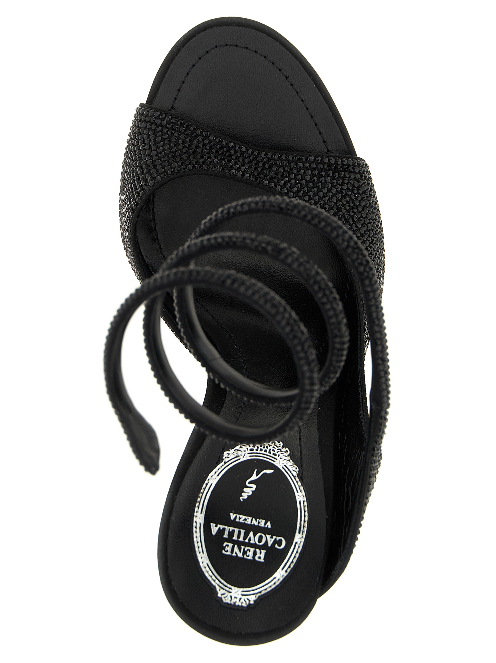 Audrey’ satin sandals with all-over rhinestone appliqué, ankle wrap band, heel, stardust sole.
