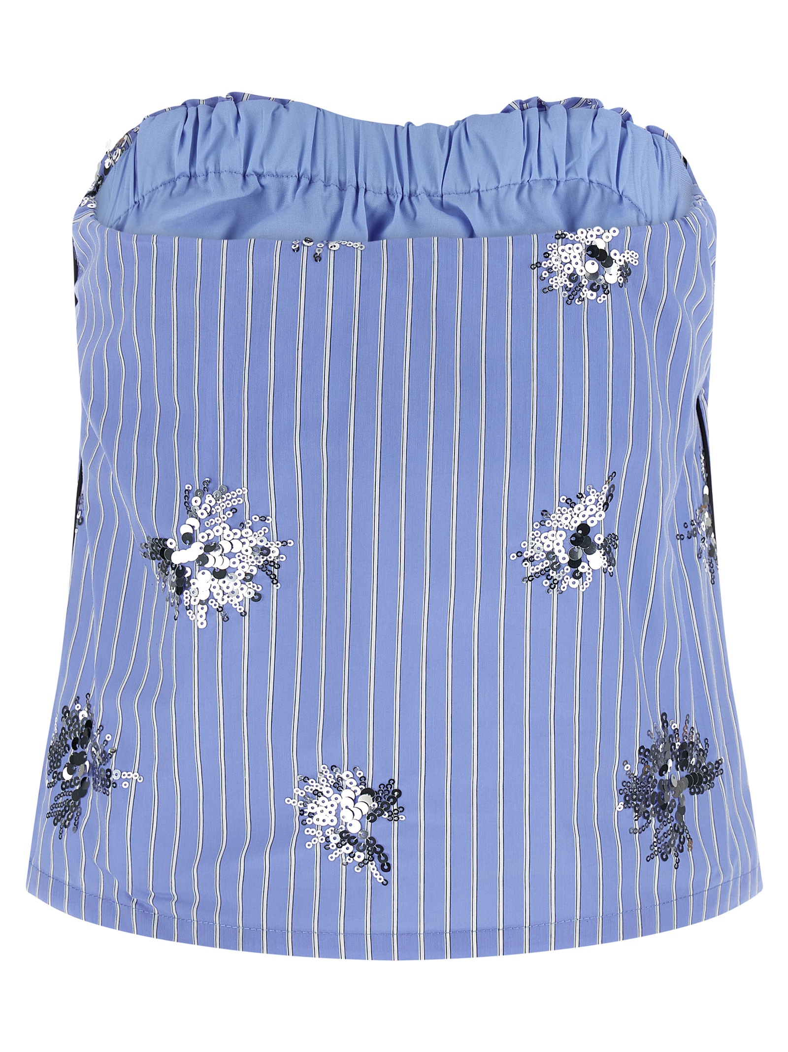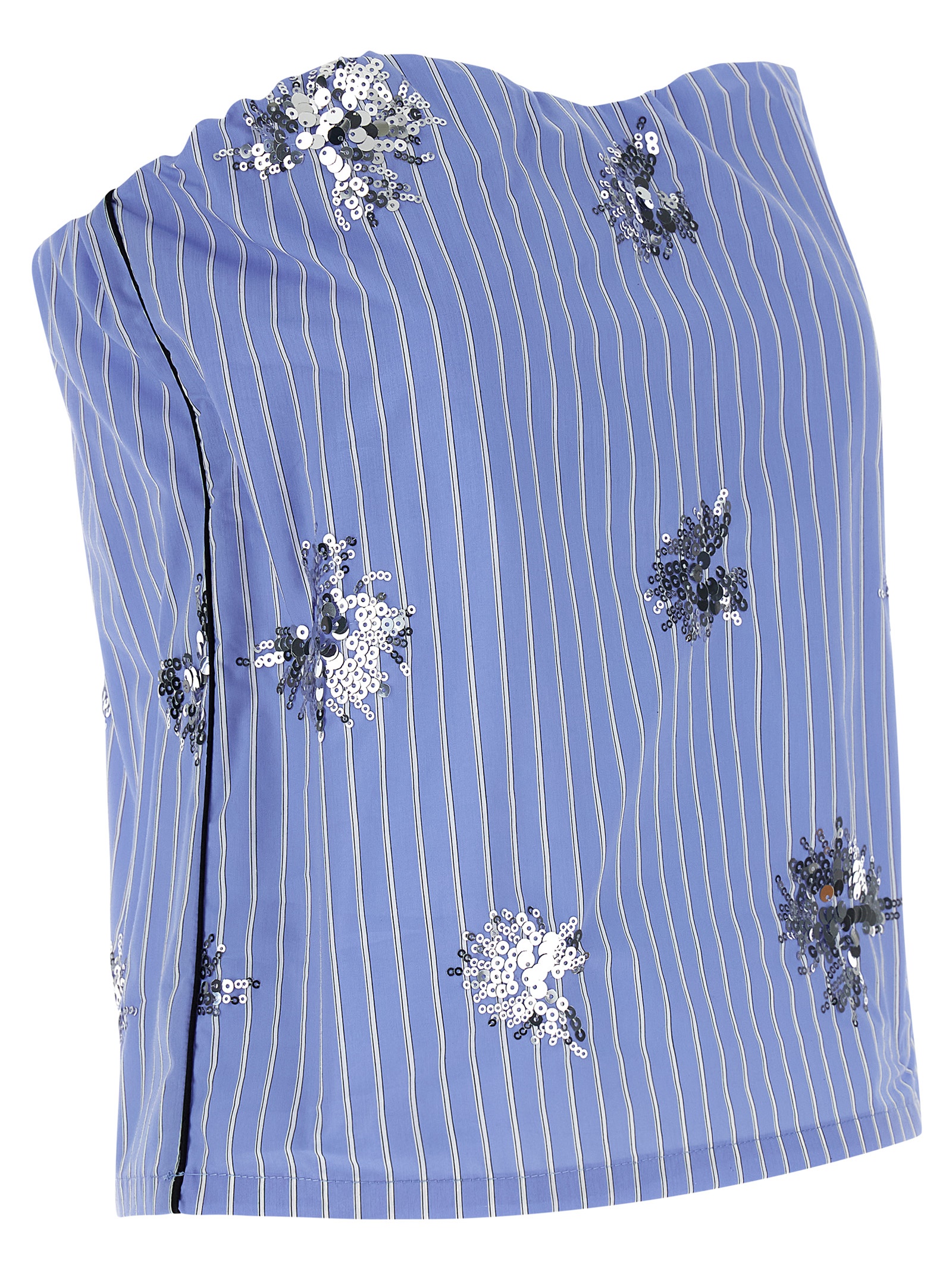 ‘Aura’ striped cotton poplin top with sequin embroidery, contrast satin piping, off-the-shoulder style with inner elastic band on the bust.