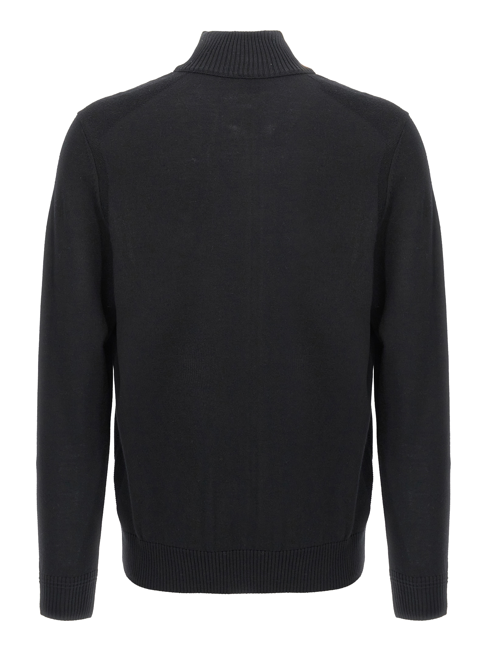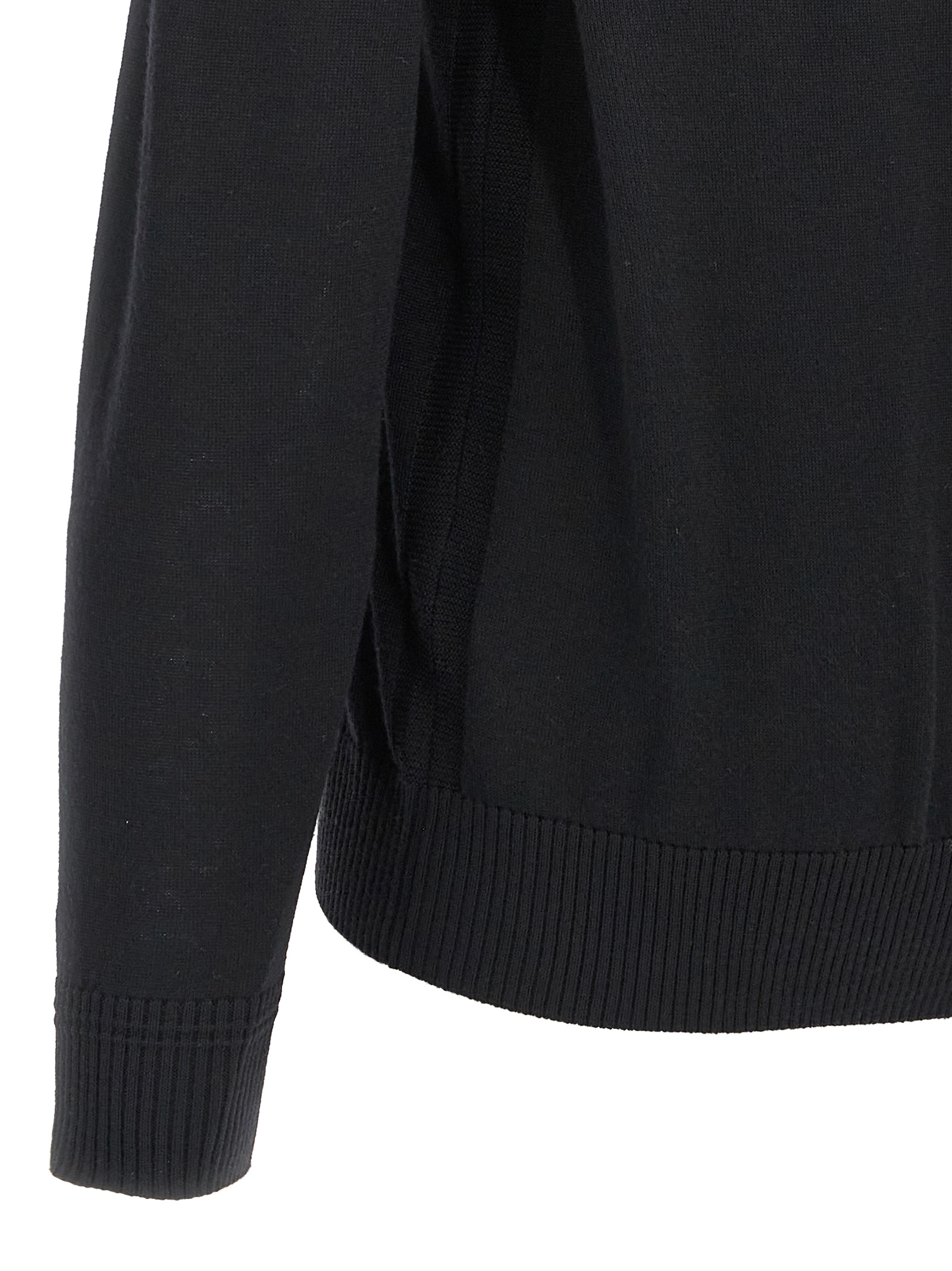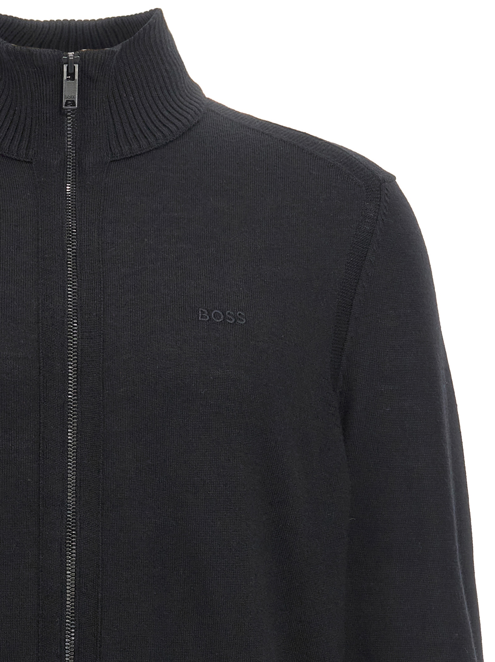 ‘Avac FZ’ wool blend knit cardigan with tone-on-tone front logo embroidery, zip closure, high neck, long cuffed sleeves.