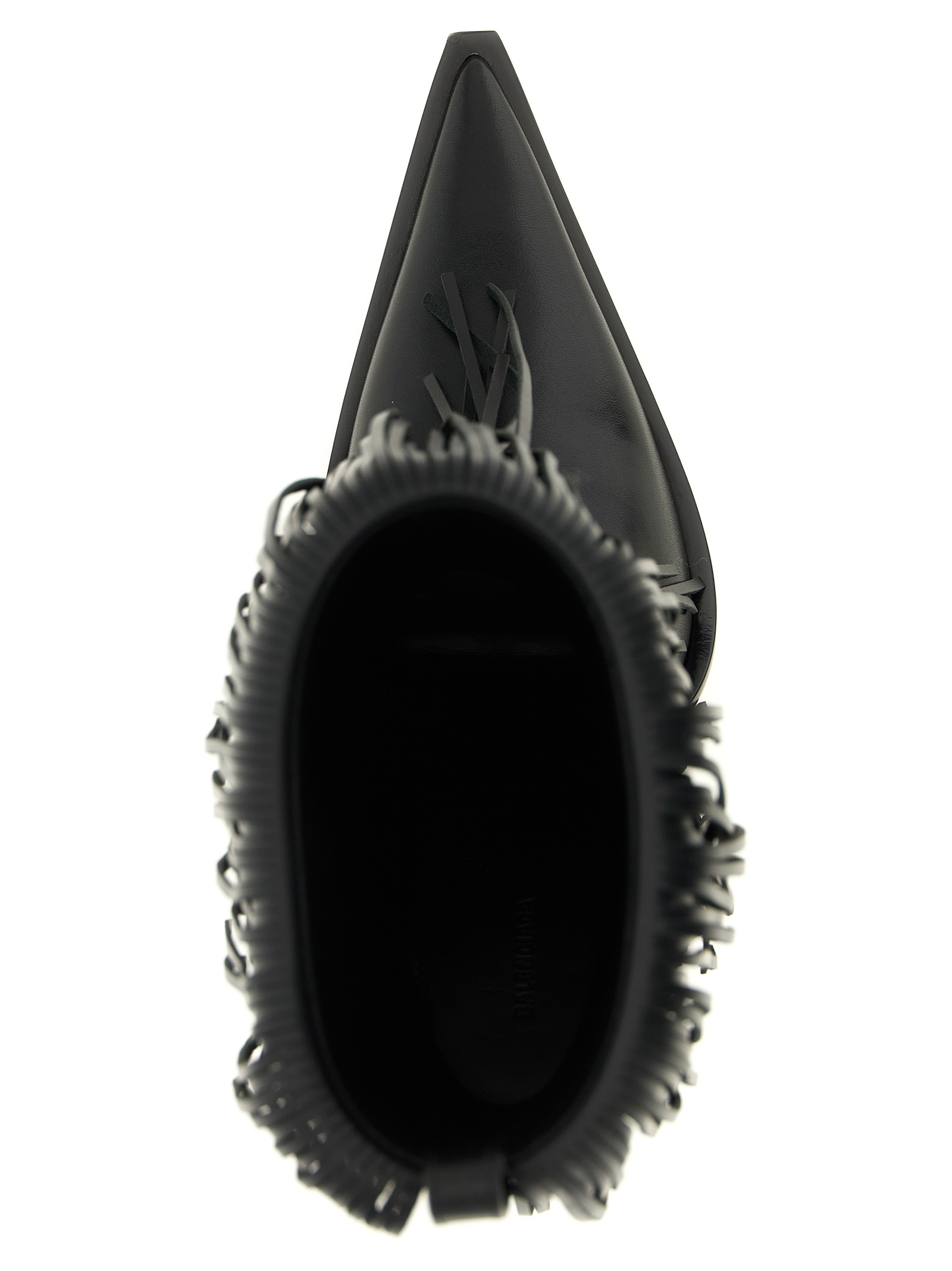 ‘Avenue Fringe’ ankle boots in matte calf leather, pointed toe, tubular leg with fringes, back loop with embossed logo, Knife heel, leather sole.