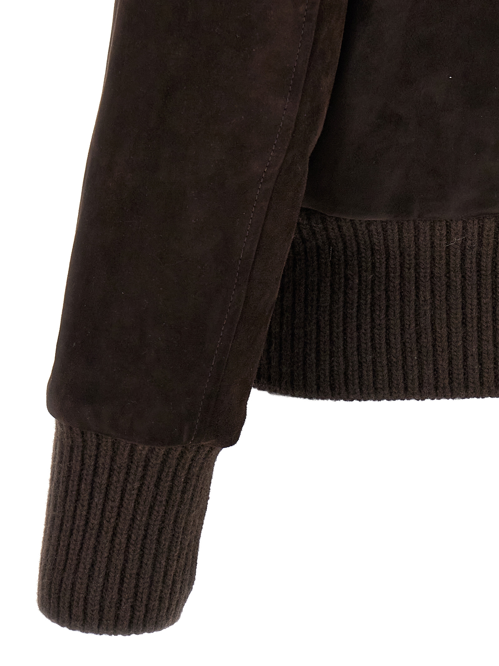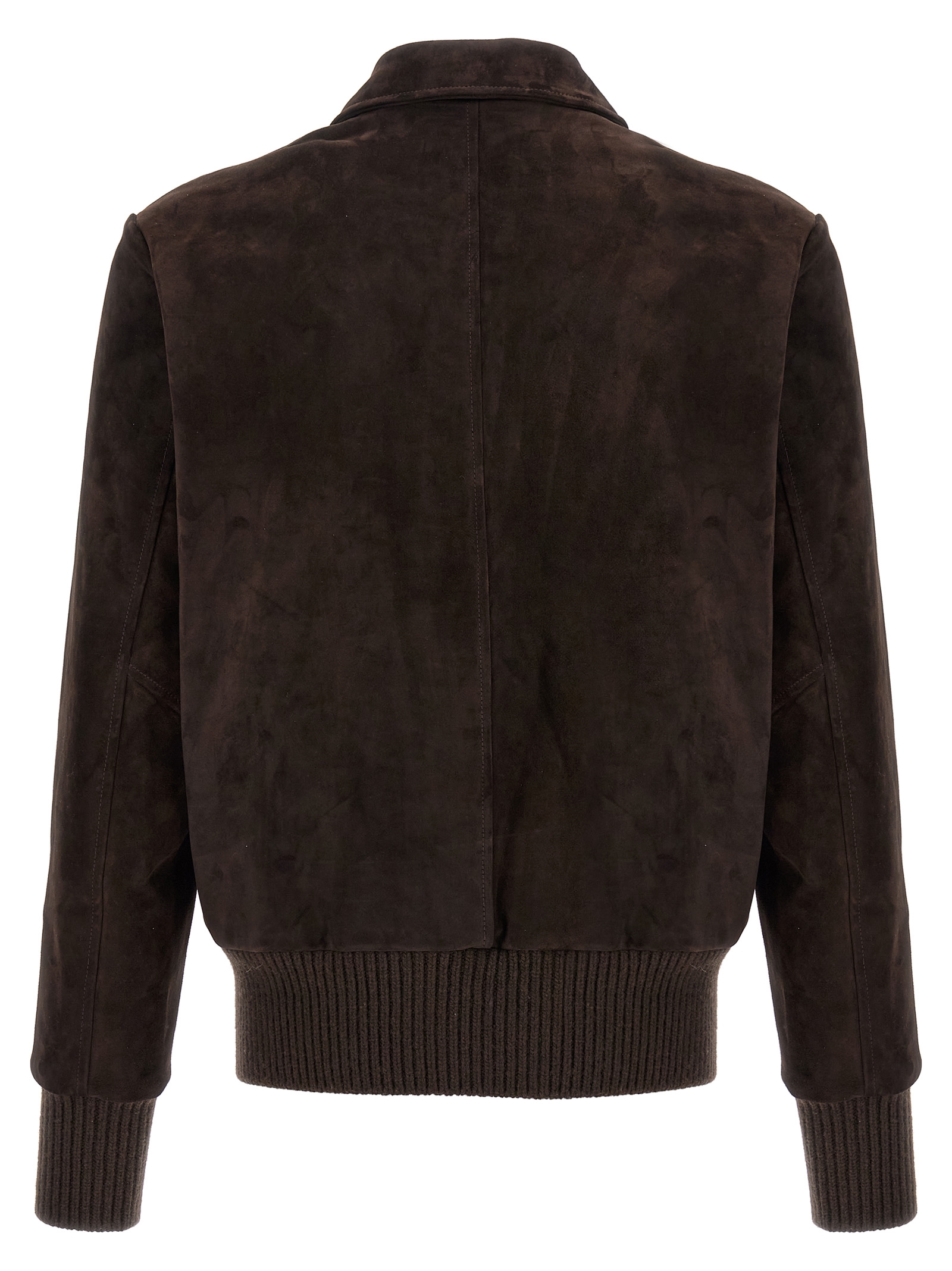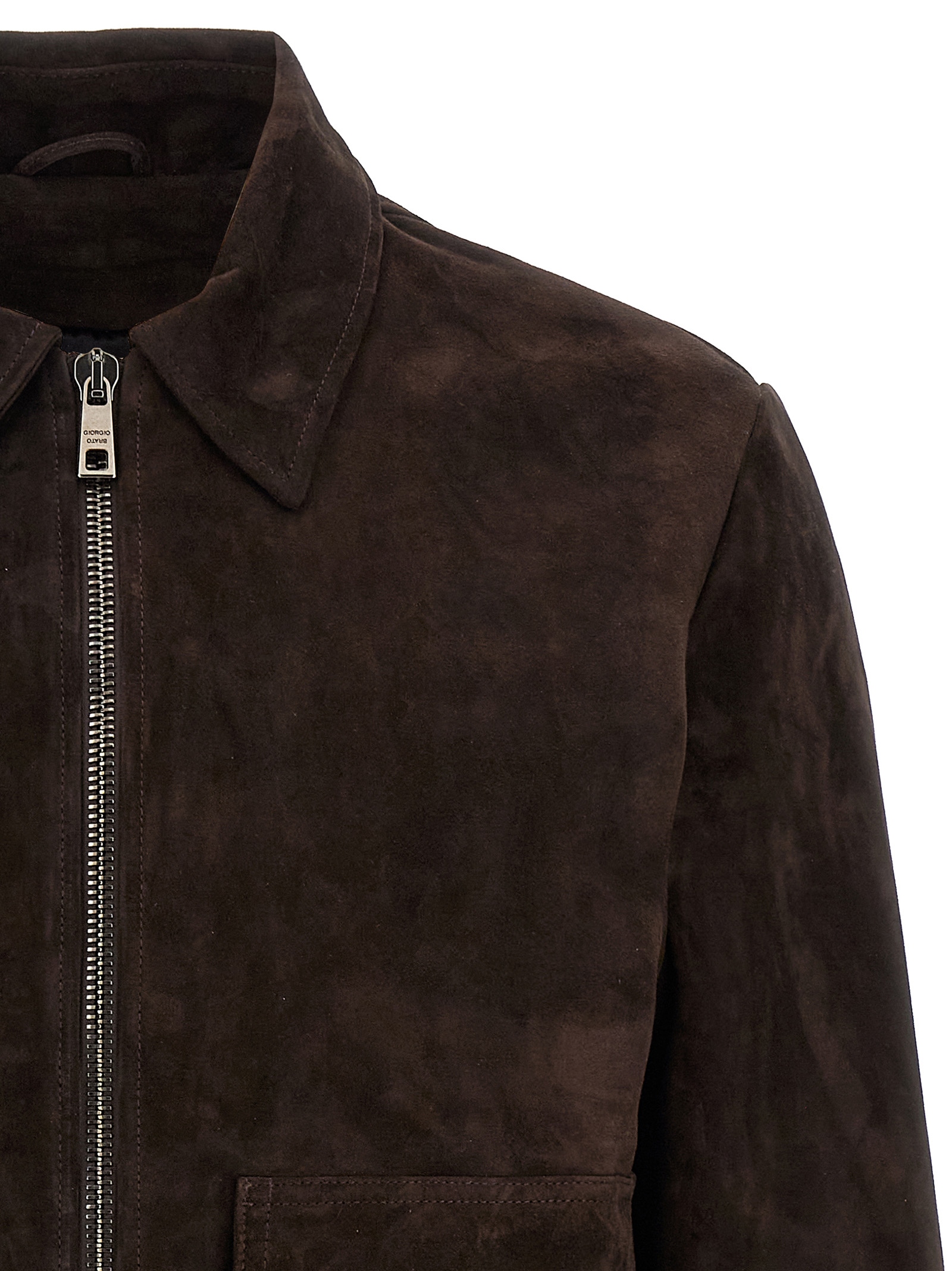 ‘Aviatore’ suede jacket with shirt collar, lined interior, front zip closure, patch pockets, long sleeves with wool cuffs.