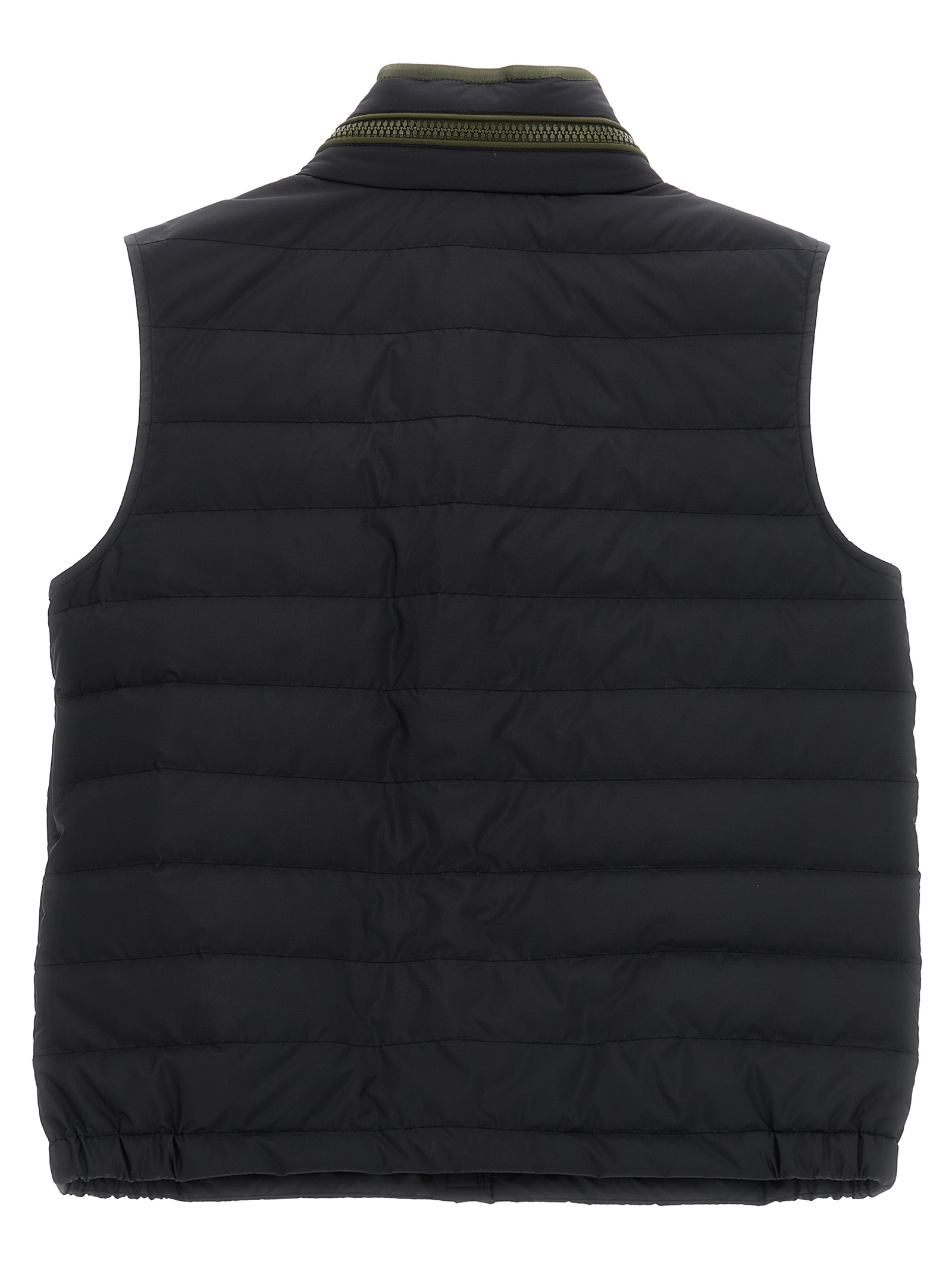 ‘Ayten’ vest in quilted technical fabric and slightly goose feather padding, nylon lining, contrasting satin piping, standing collar with removable hood, felt logo patch and front zip closure, pockets, elastic hem.
