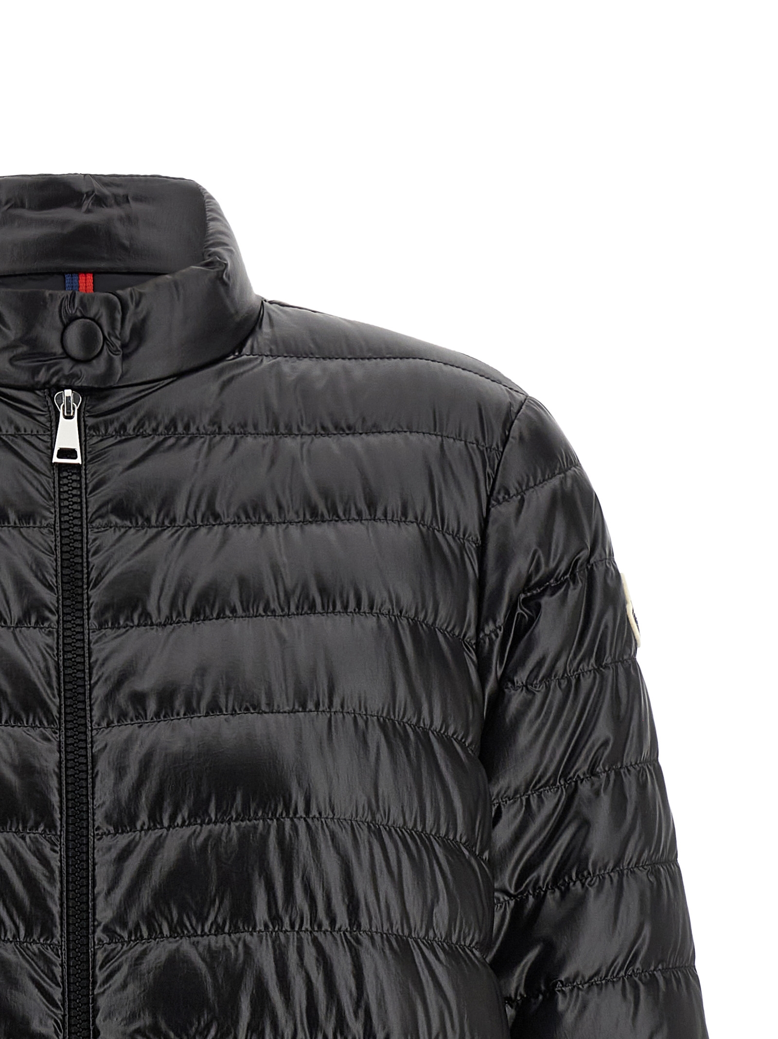 ‘Azalee’ short quilted nylon down jacket, goose down padded saison longue lining, standing collar with snap button closure, front zip closure, pockets, long sleeves with elastic cuffs and felt logo patch, side slits with zip, ribbon drawstring on the hem.
