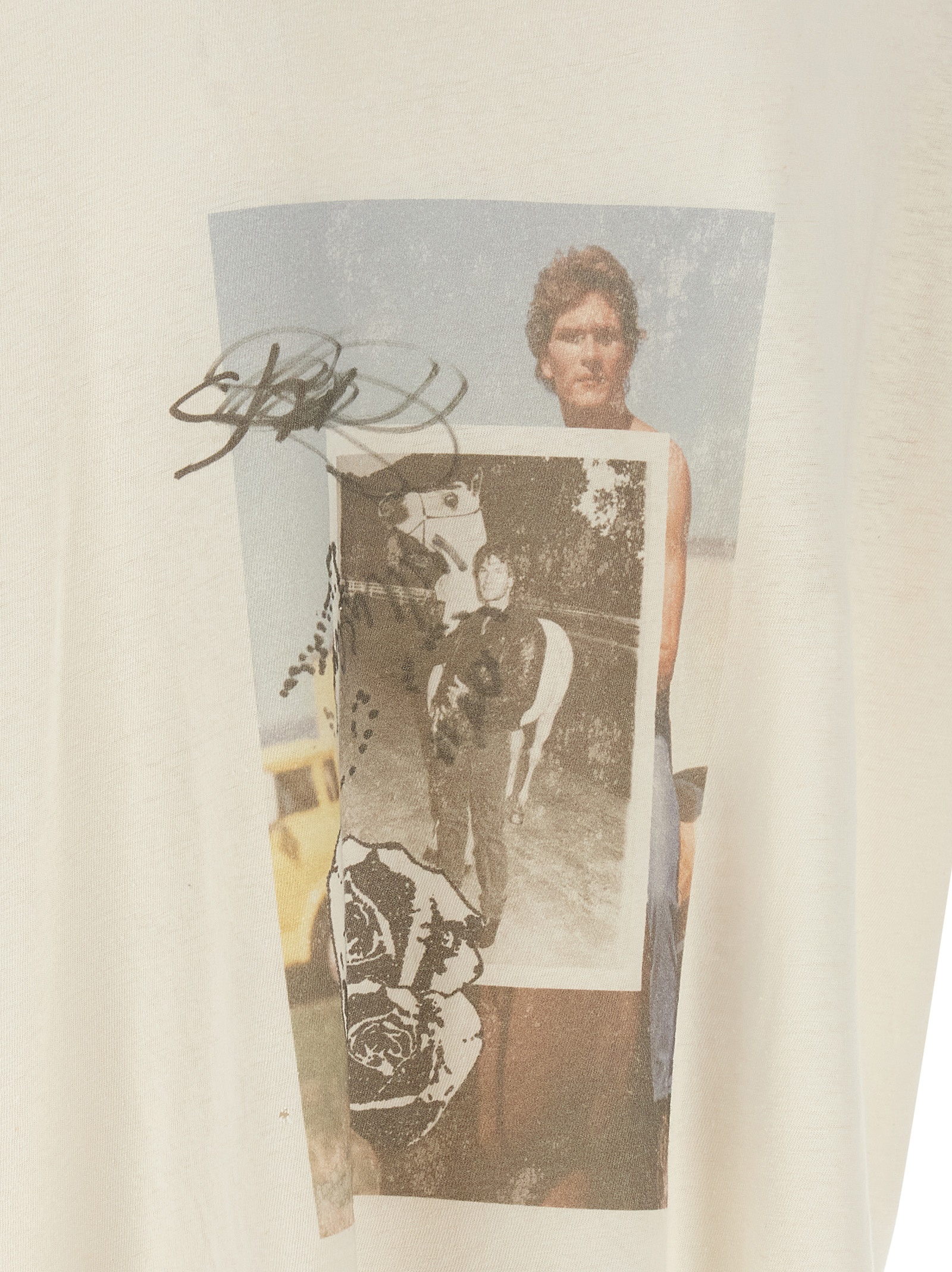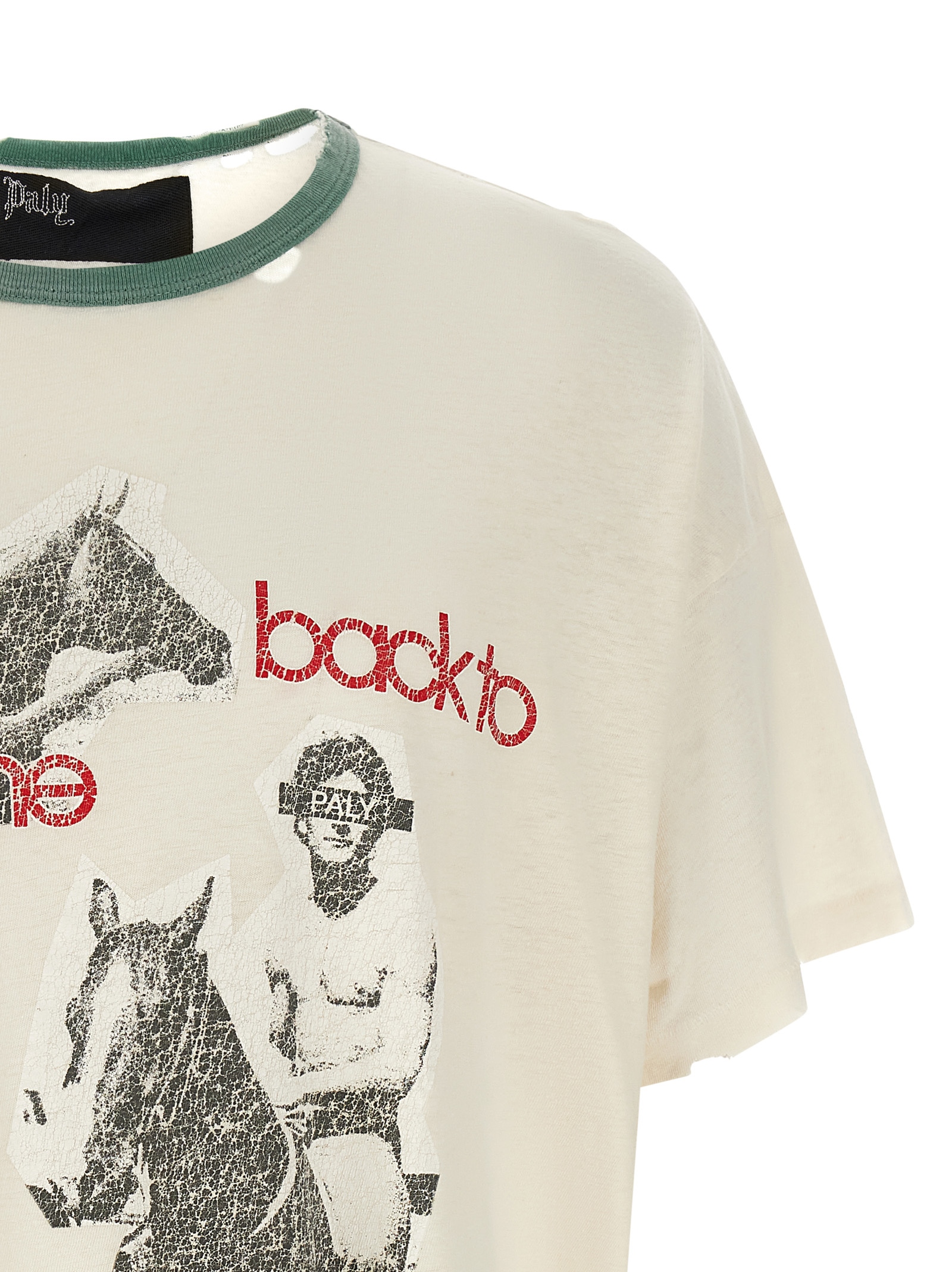 ‘Back To Life Ringer’ jersey T-shirt in flamed hemp blend jersey subjected to intense vintage wash with sun-faded details and hand-worn effects, front and back print, crew neck, short sleeves, asymmetrical hem.