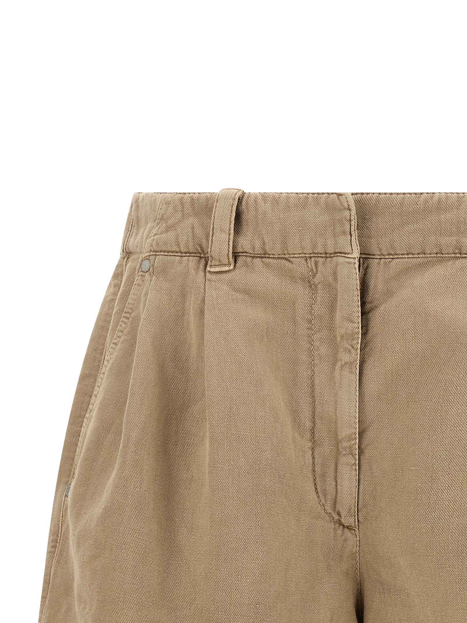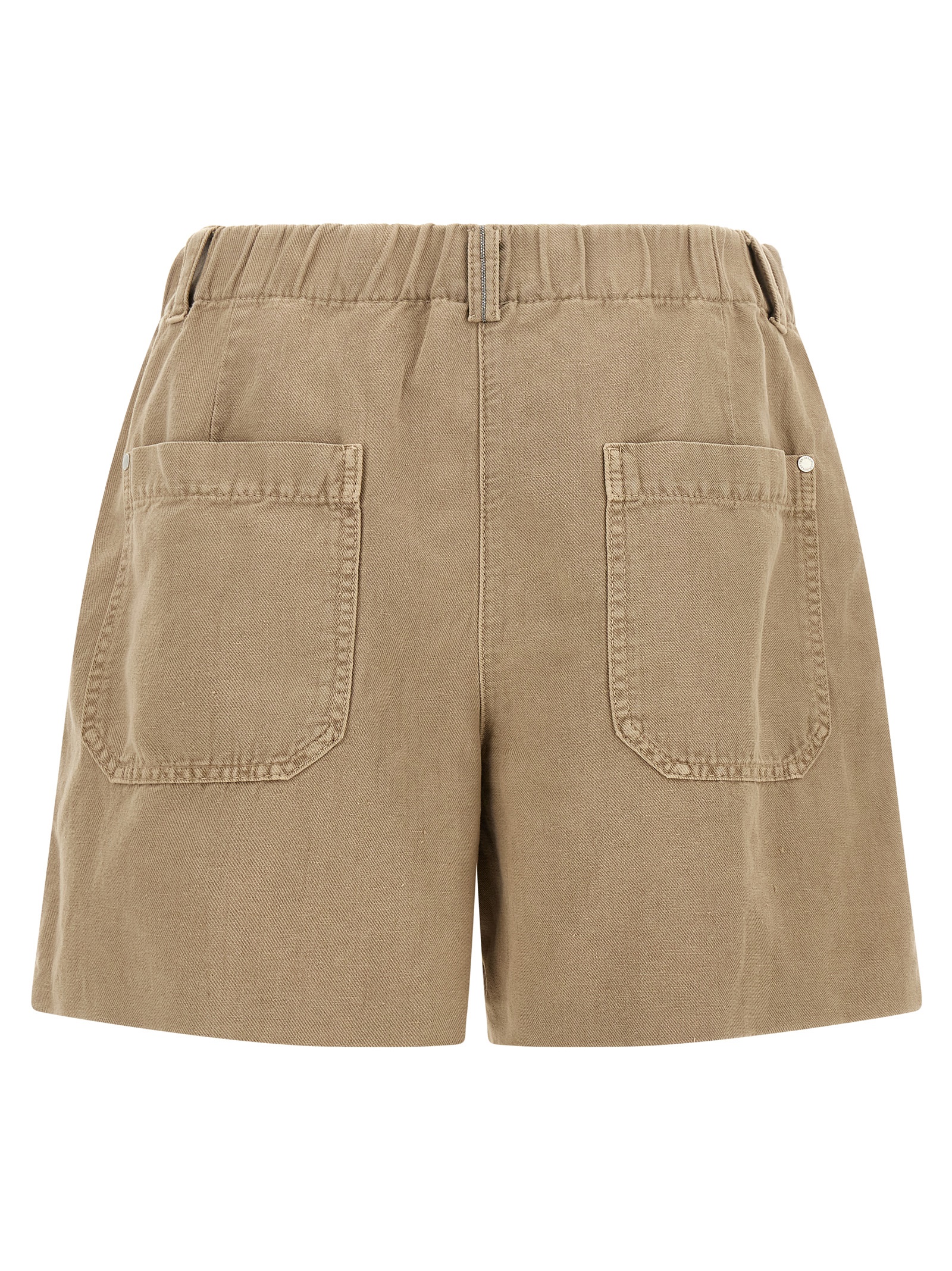 ‘Baggy’ shorts in garment-dyed cotton and linen cover, double front pincer, Monile detail and elastic waistband at the back, zip hook and front button closure, front American pockets, back welt pockets.