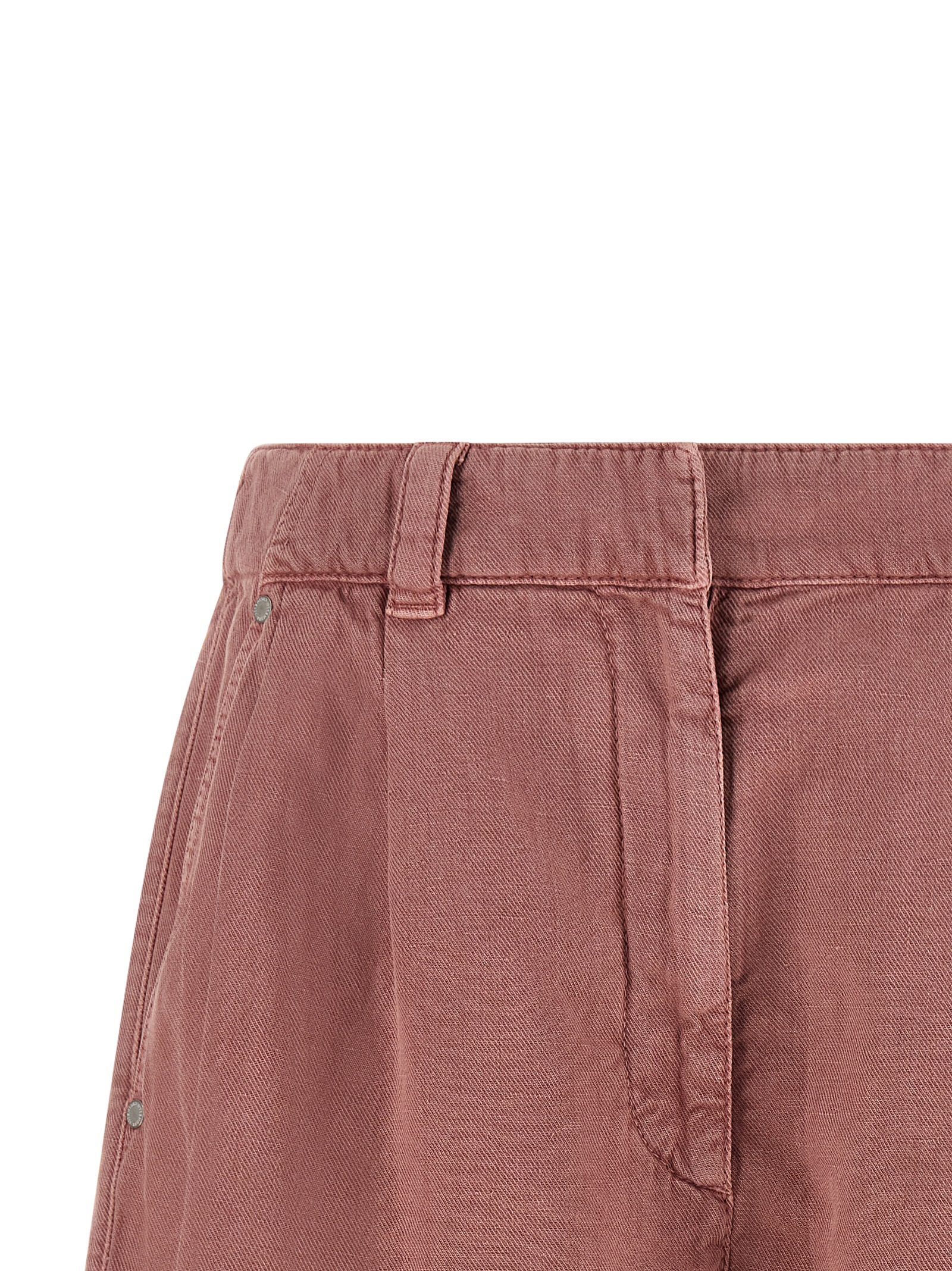 ‘Baggy’ shorts in garment-dyed cotton and linen cover, double pince, hook and front button zip closure, pockets, wide leg, back ‘Monile’ detail.