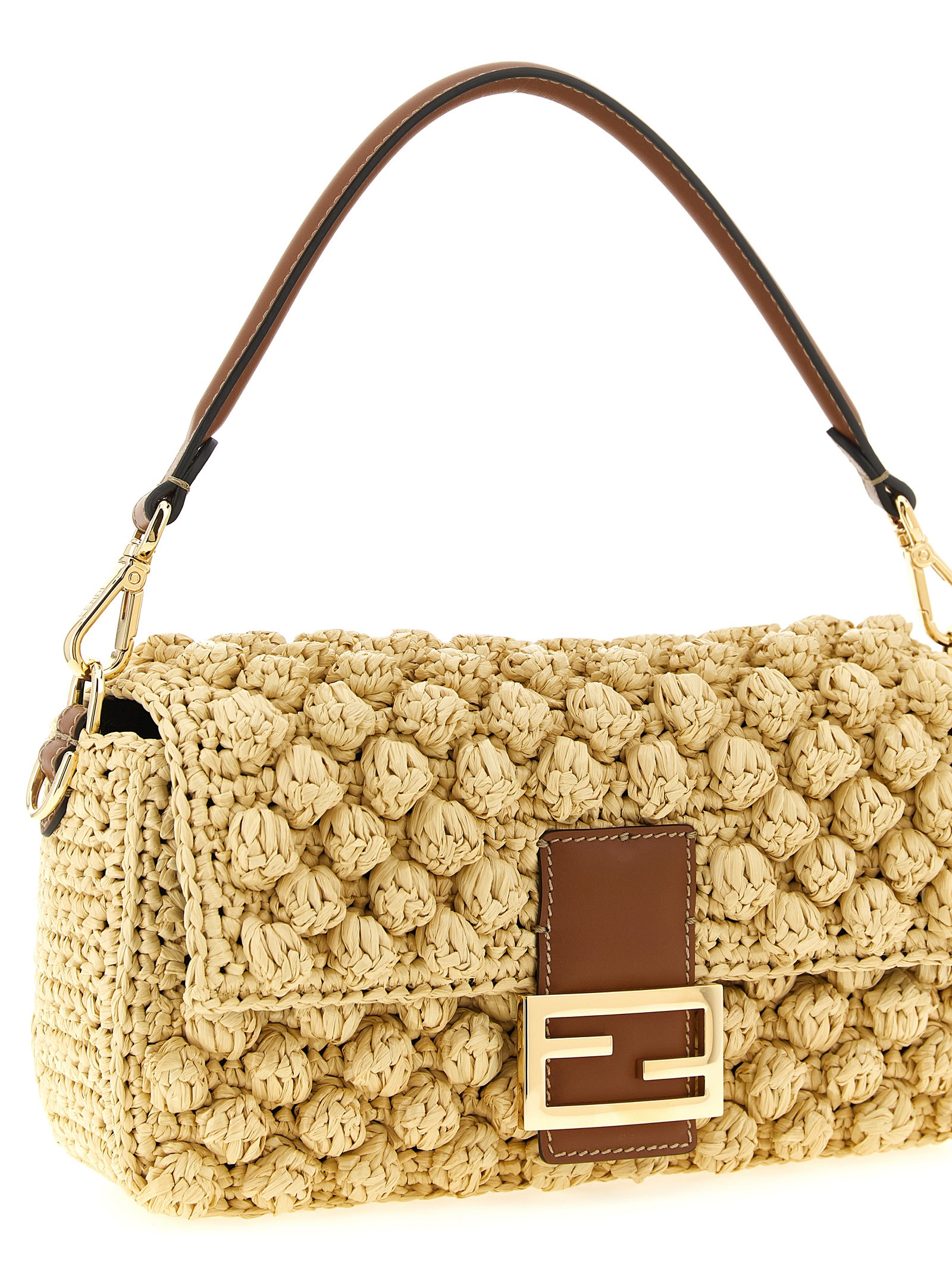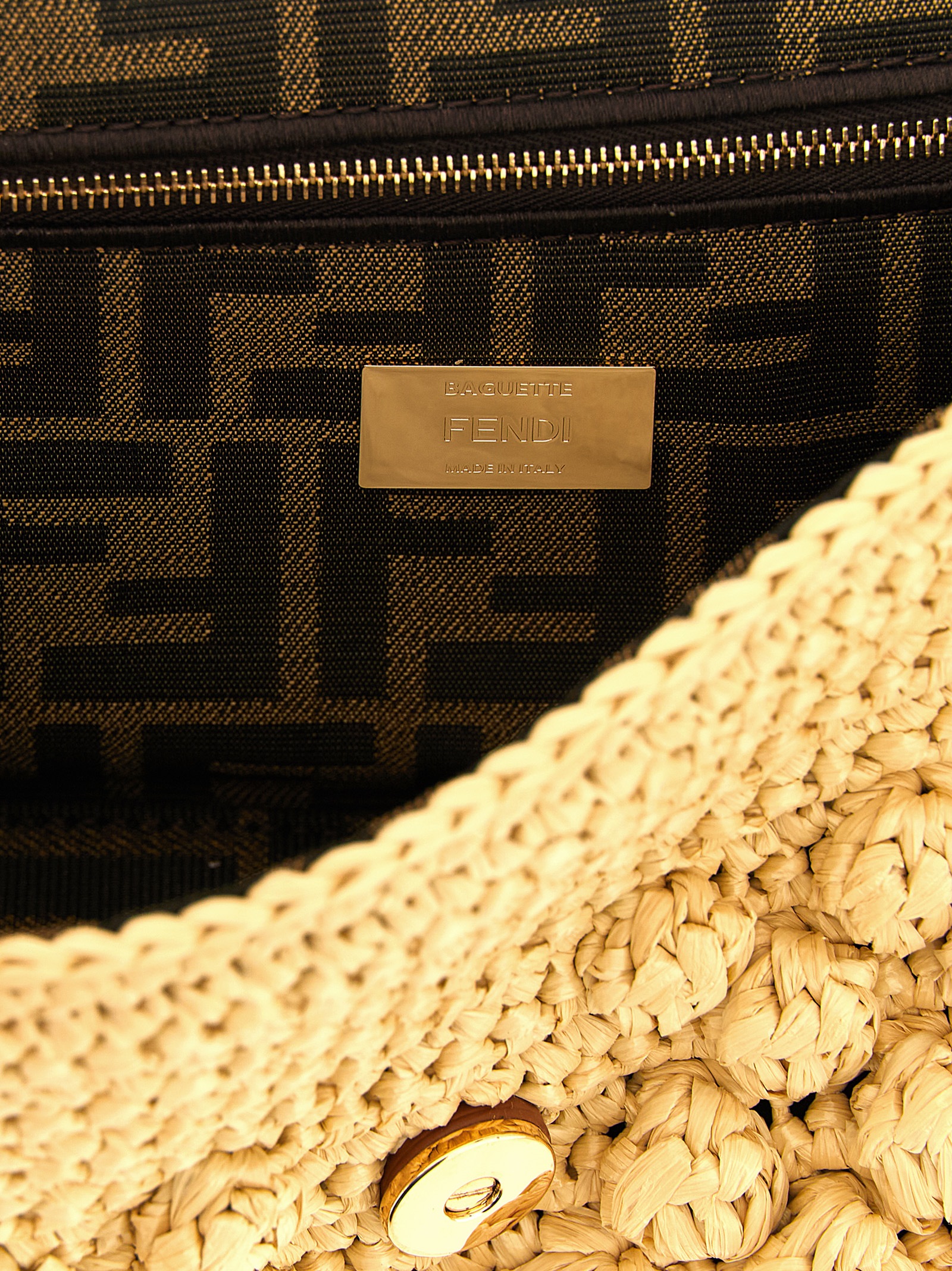 Baguette®’ raffia medium shoulder bag with handmade peanut stitch and calf leather three-dimensional weave, magnetic flap closure with front metal FF buckle, iconic FF jacquard lining with inside pocket, removable handle, and removable shoulder strap.