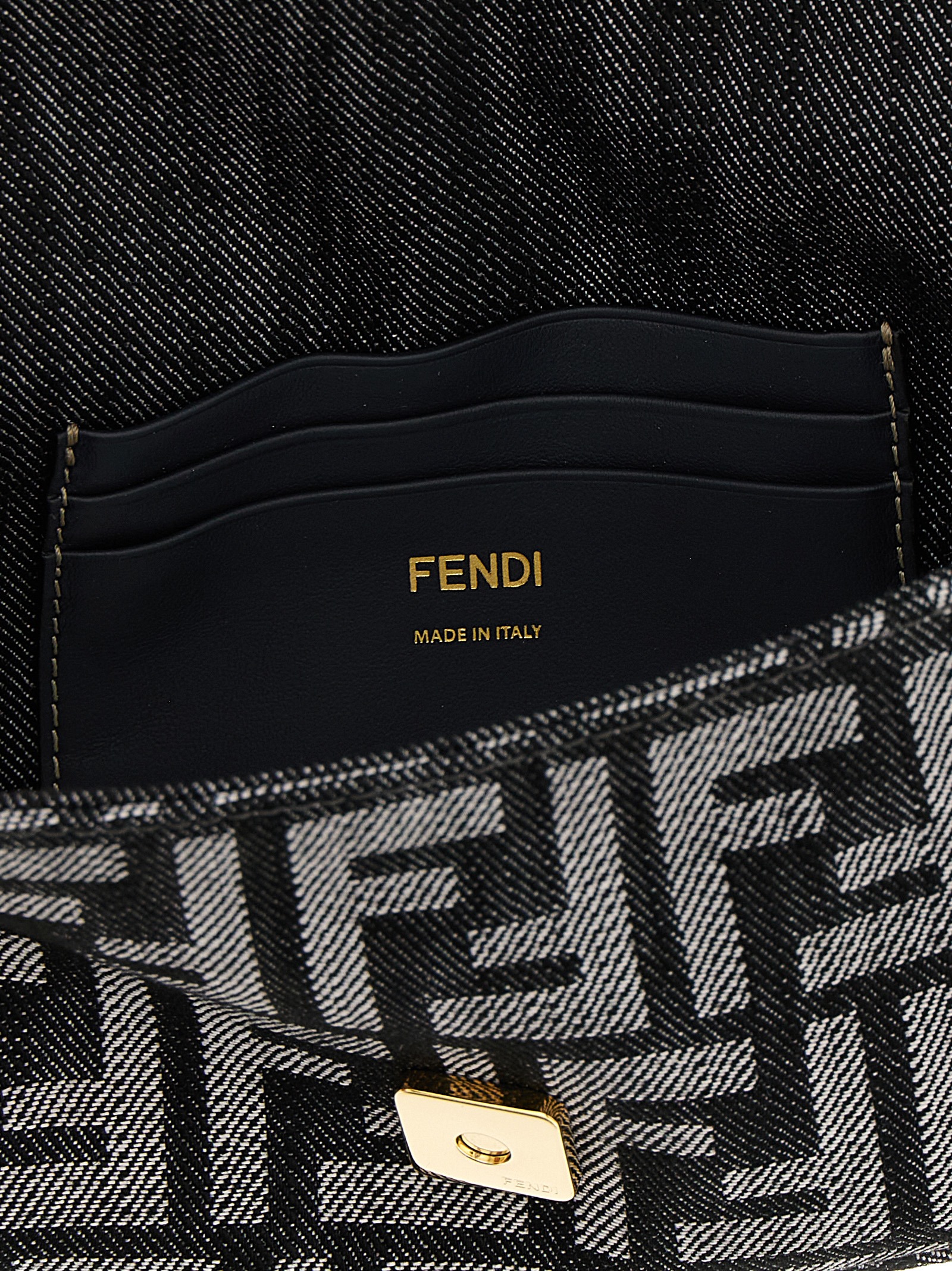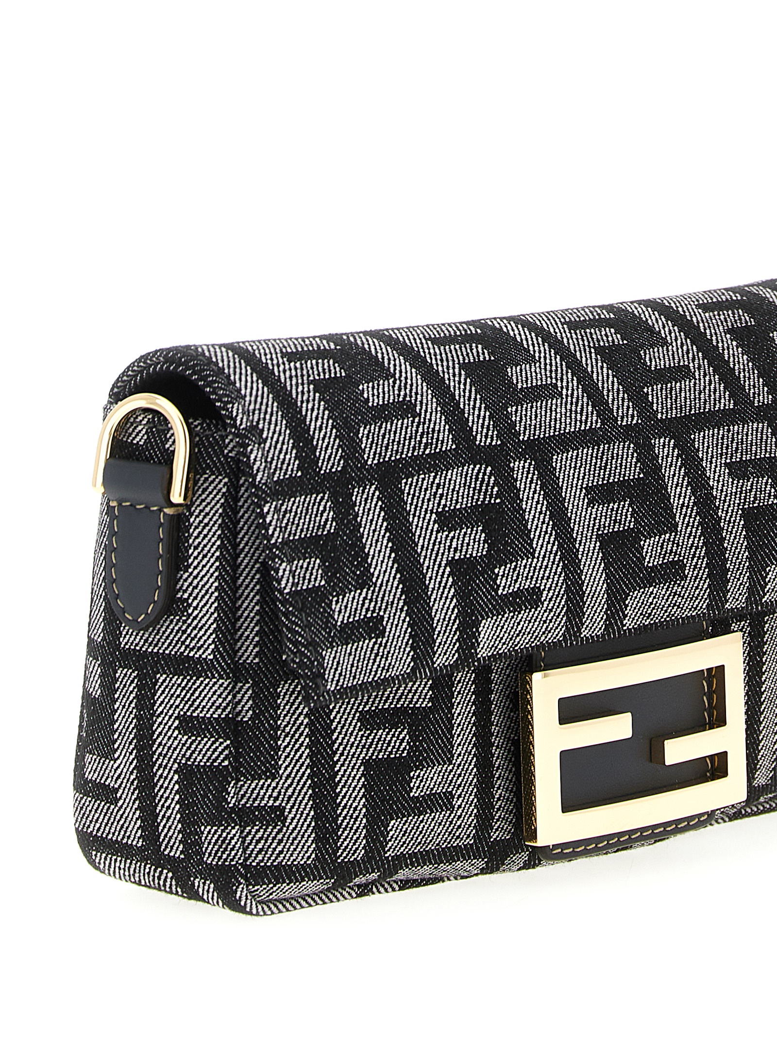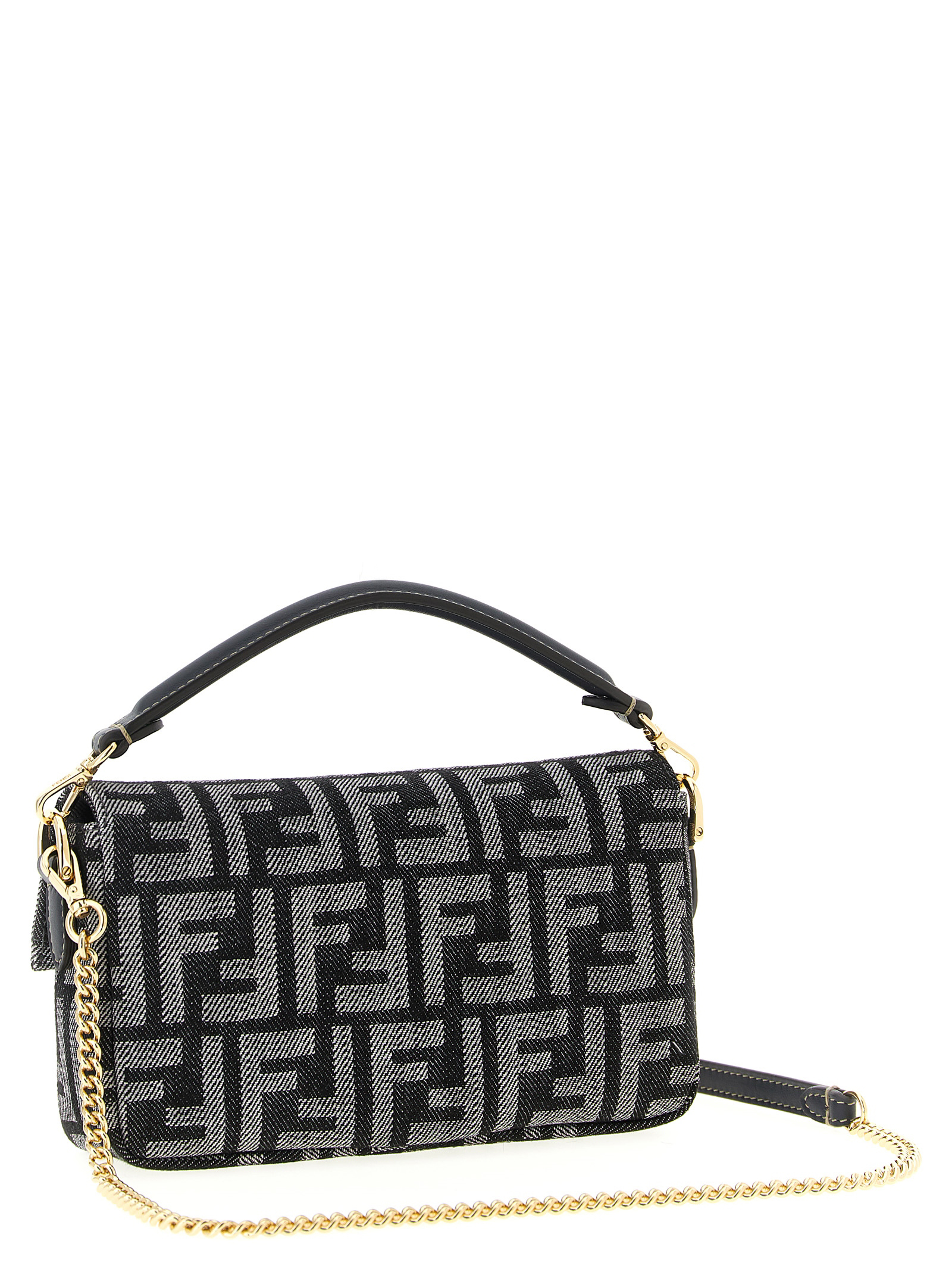 ‘Baguette®’ FF denim-effect jacquard mini handbag with smooth leather details, magnetic flap closure with front metal logo buckle, removable leather handle, chain shoulder strap with removable leather protection.
