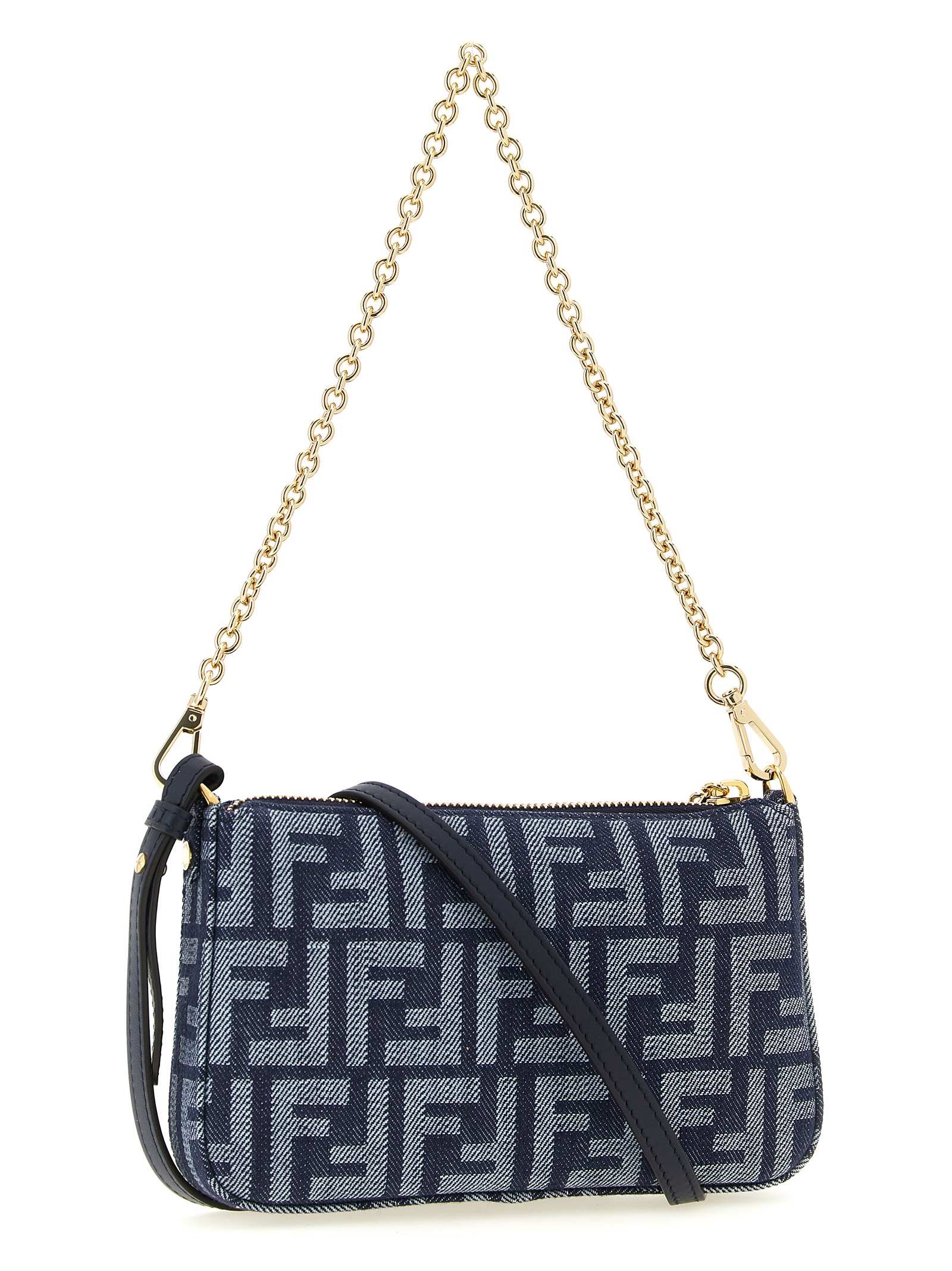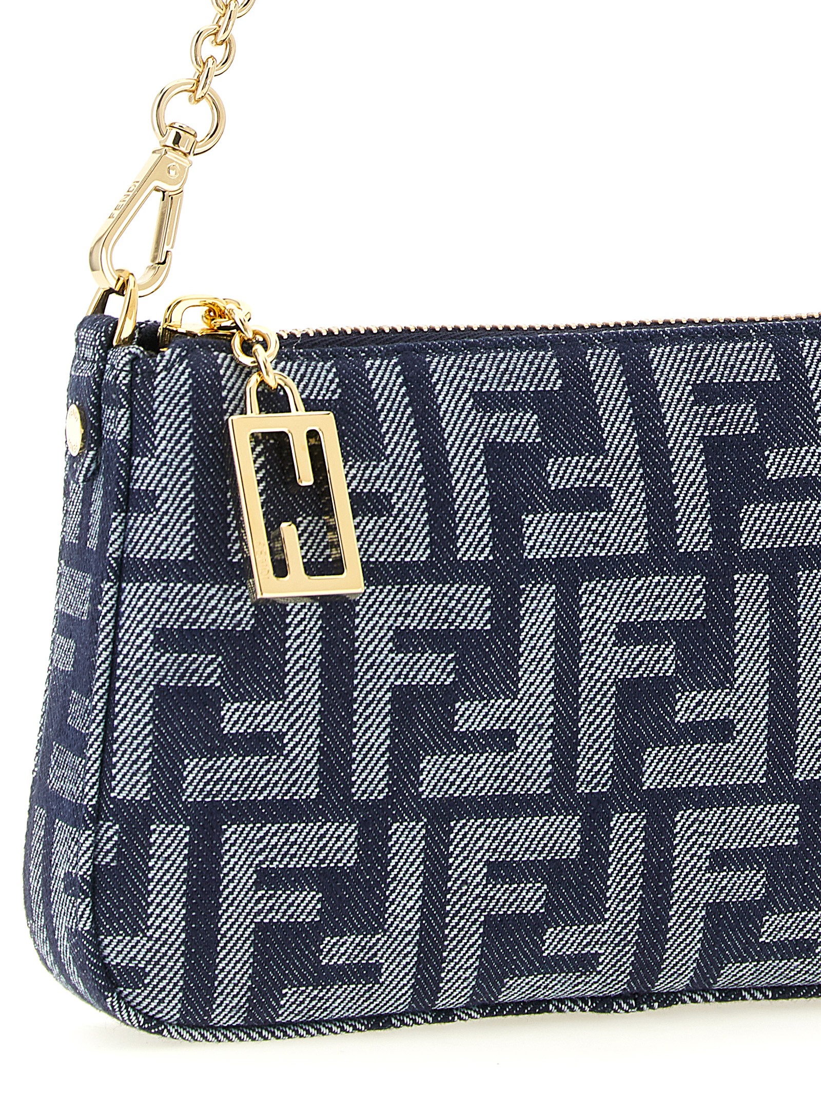 ‘Baguette’ denim-effect FF jacquard pouch, top zip closure with zip puller with iconic metal FF pattern, removable chain handle, adjustable and removable leather shoulder strap.