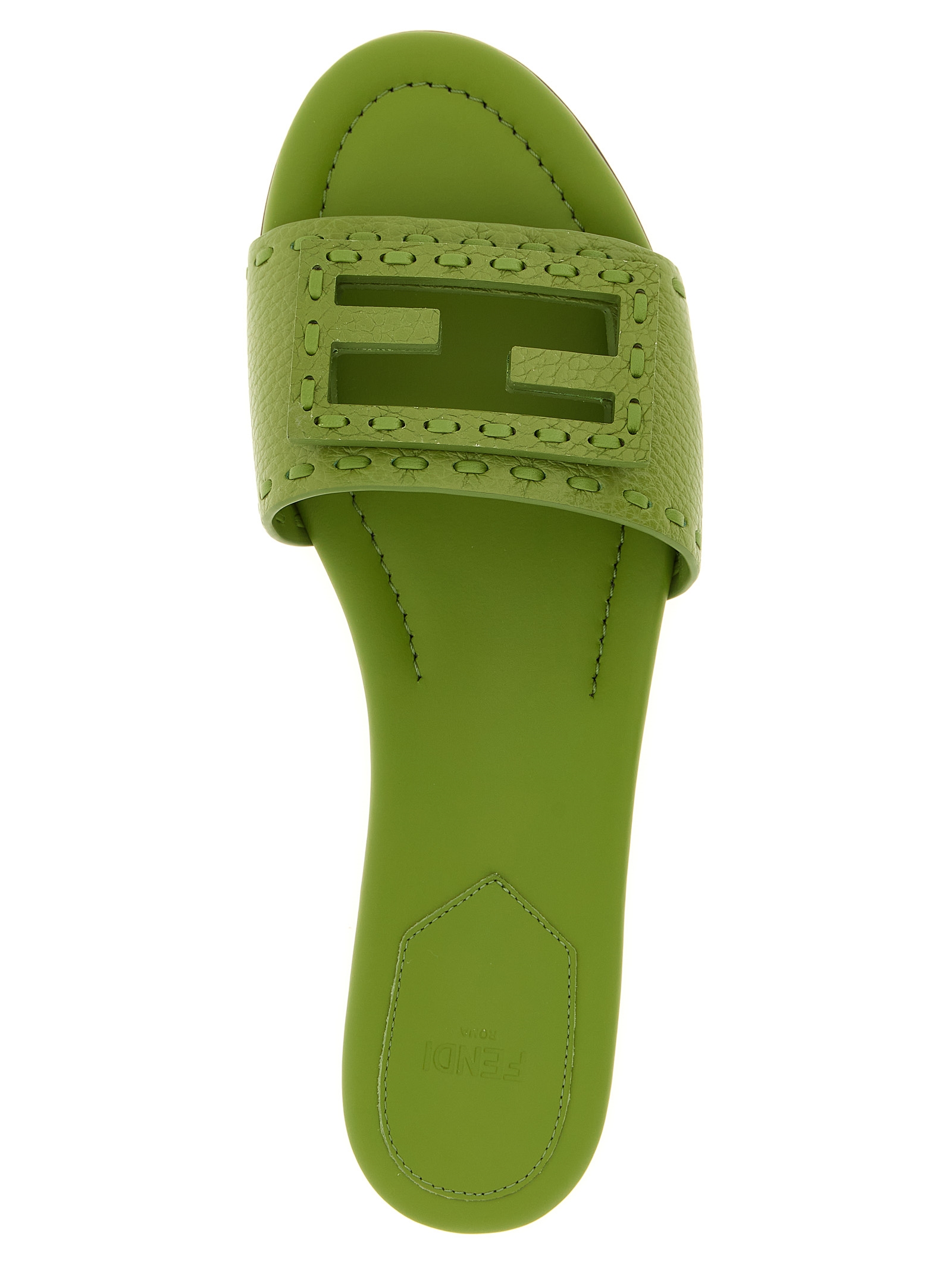 ‘Baguette’ slides in tumbled leather finished with tonal handmade macro stitching, front FF cut-out logo, leather sole.