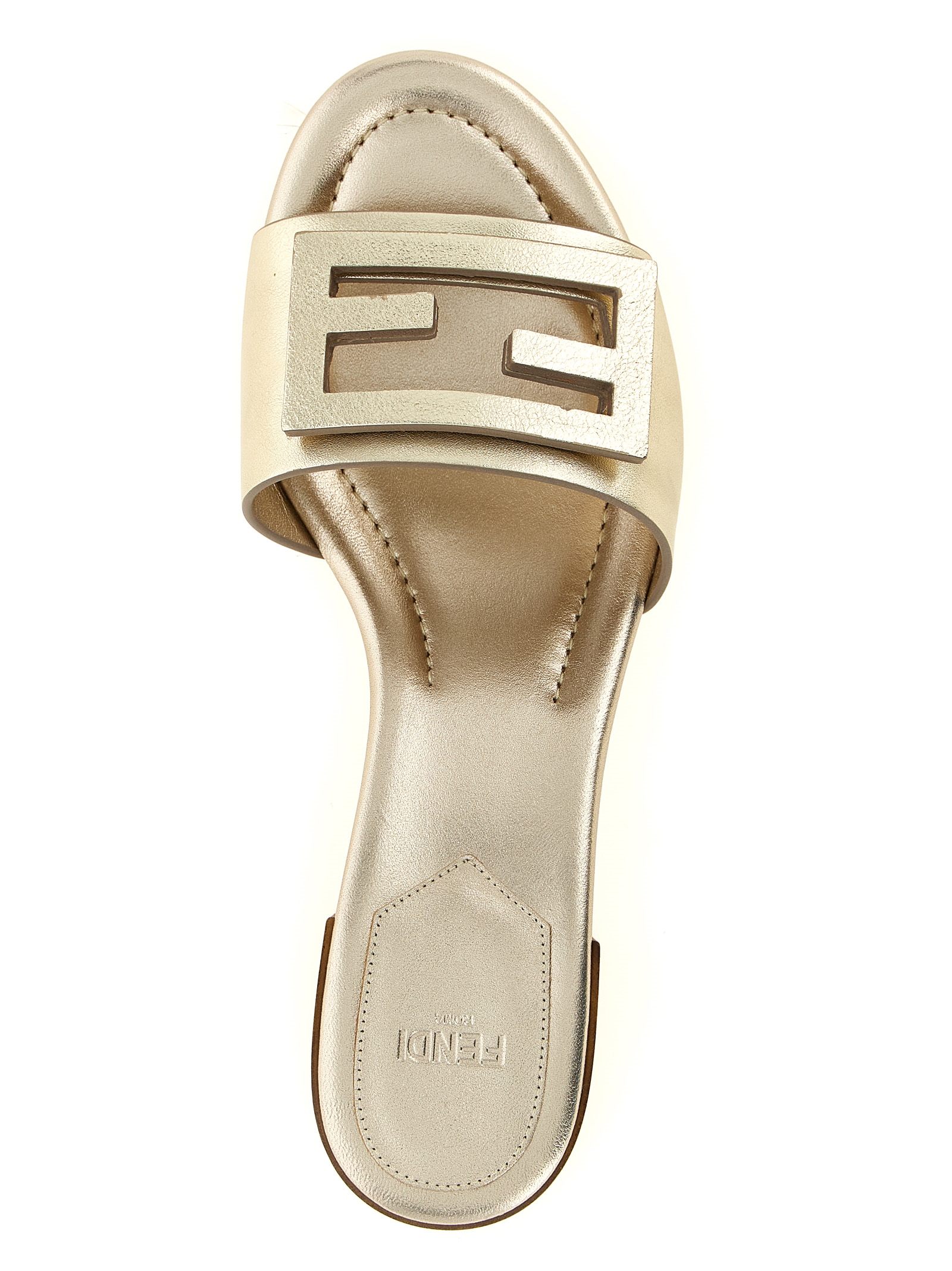 Laminated leather slides finished with handmade tone-on-tone macro stitching, round toe, wide band with front cut-out FF ‘Baguette’ pattern, covered wide heel and leather sole.