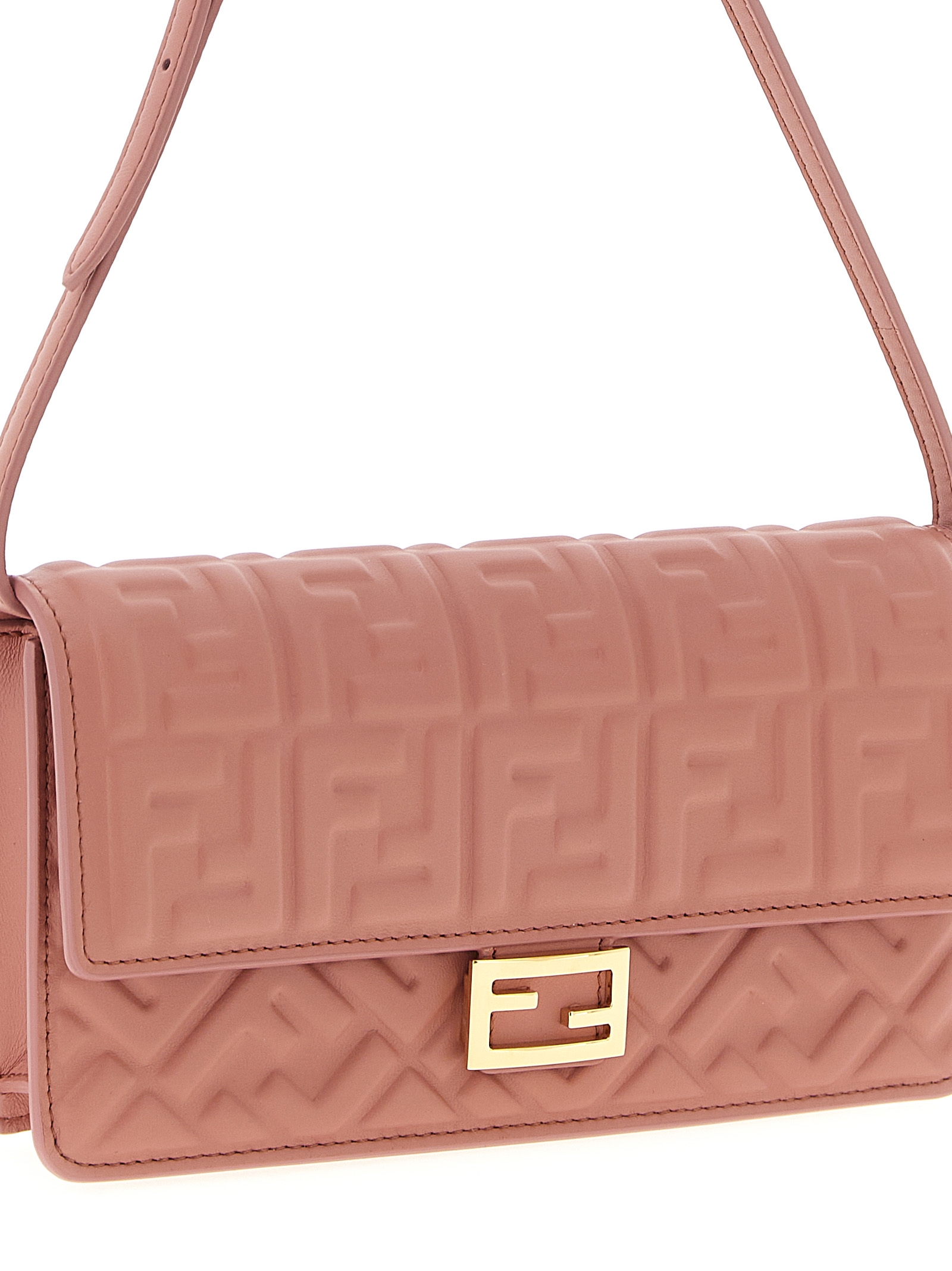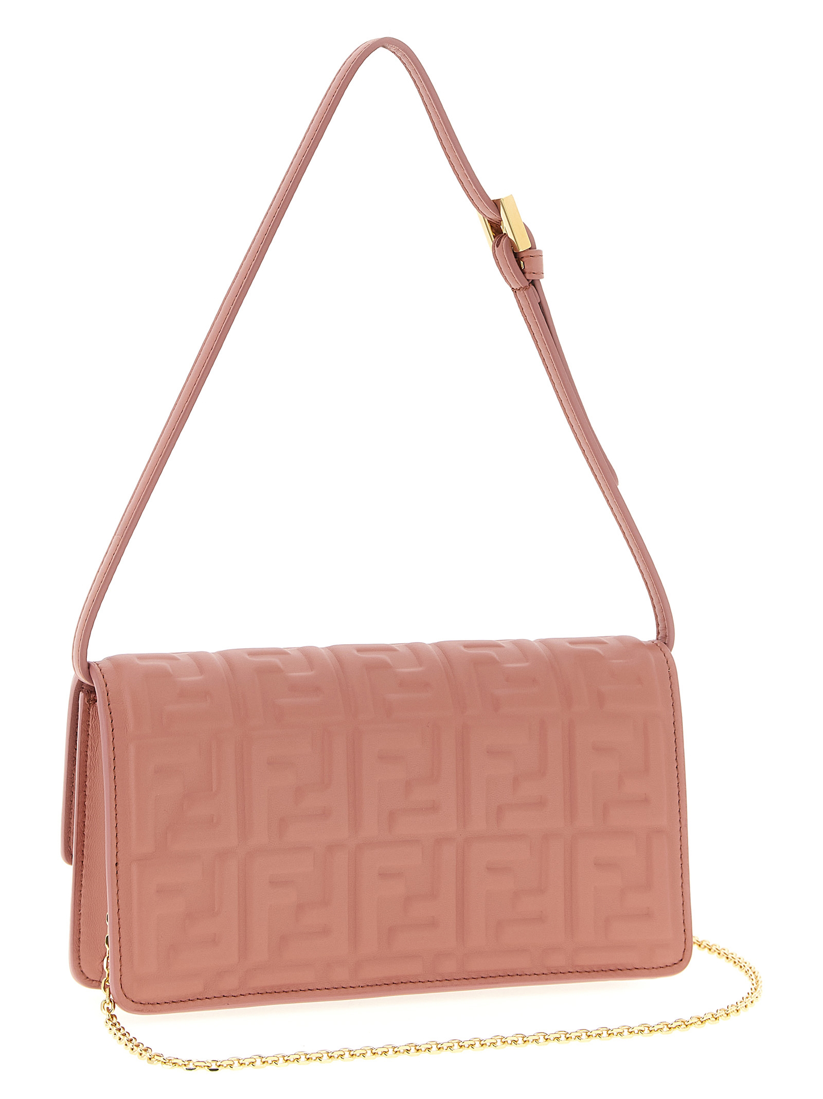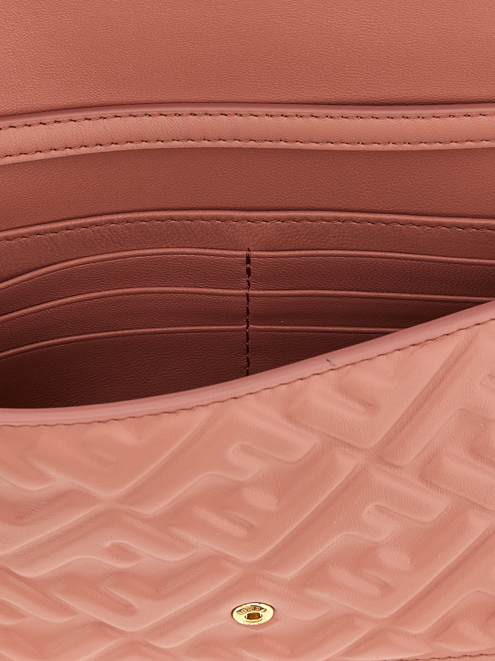‘Baguette’ nappa wallet on chain with iconic embossed FF pattern with a three-dimensional effect, magnetic flap closure with front metal FF logo, adjustable and removable short leather shoulder strap, and removable chain shoulder strap.