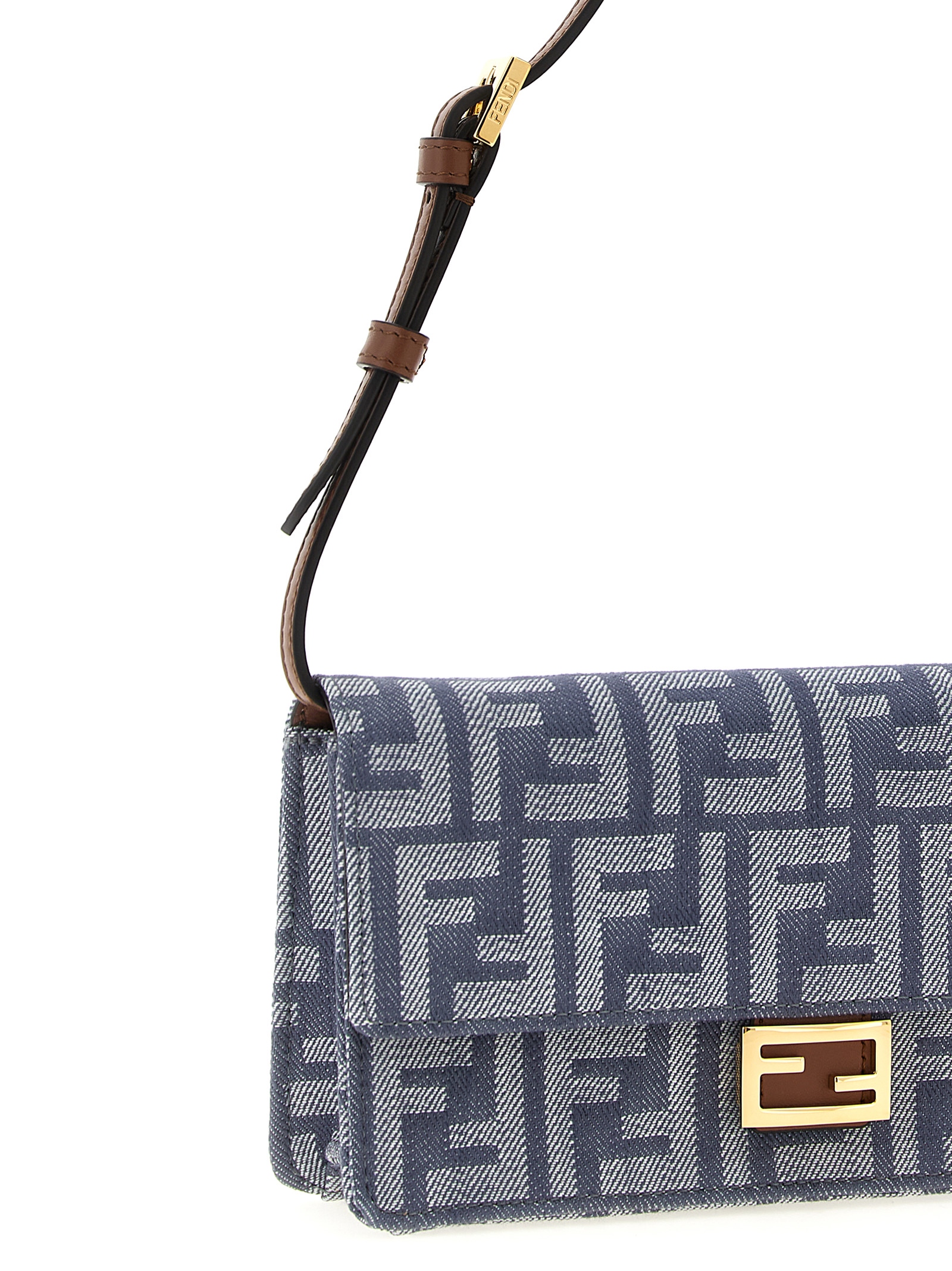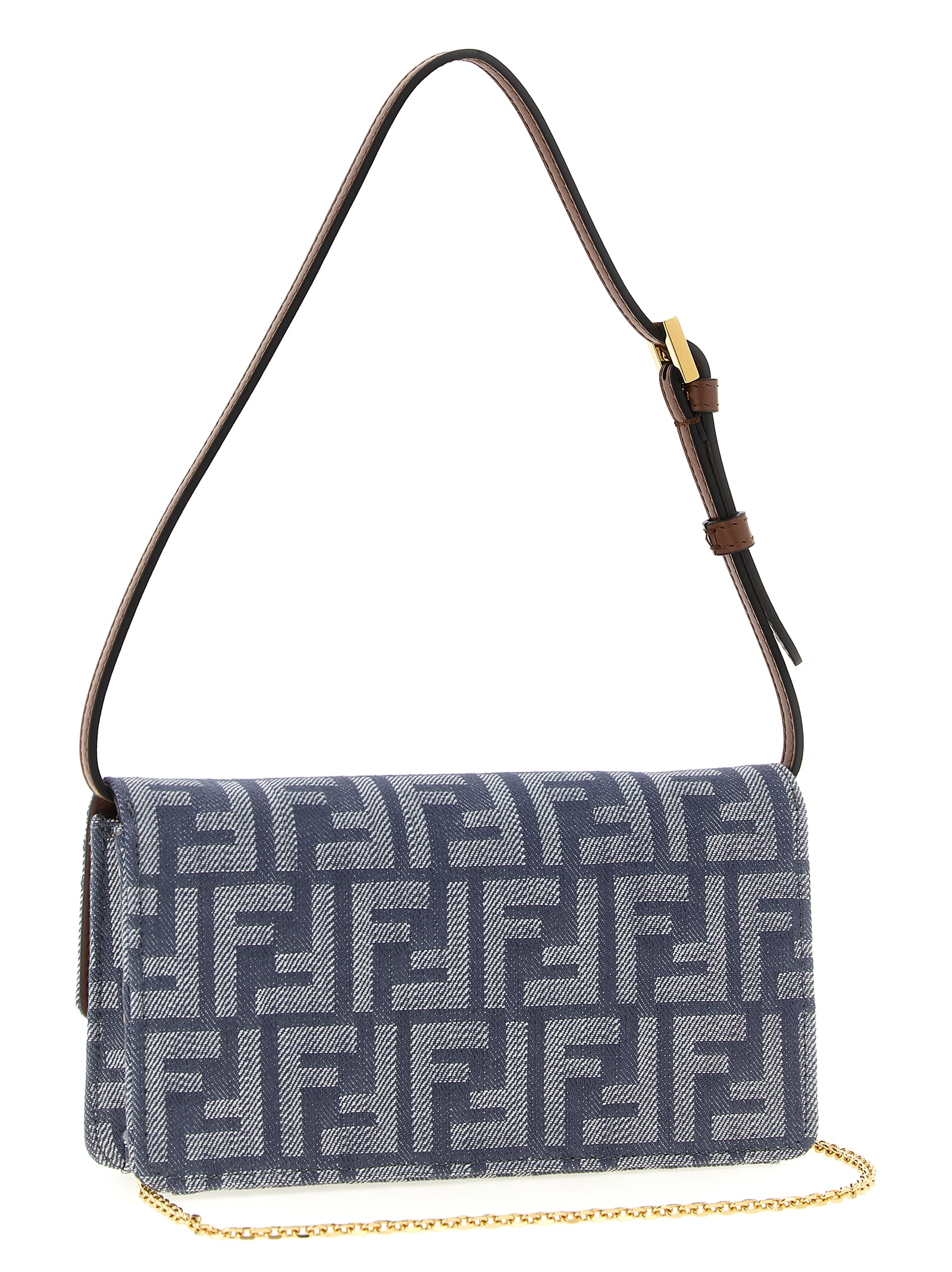 ‘Baguette’ wallet on chain in FF jacquard with denim effect, flap closure with snap button and front metal logo, leather interior, adjustable and removable leather handle, removable chain shoulder strap.