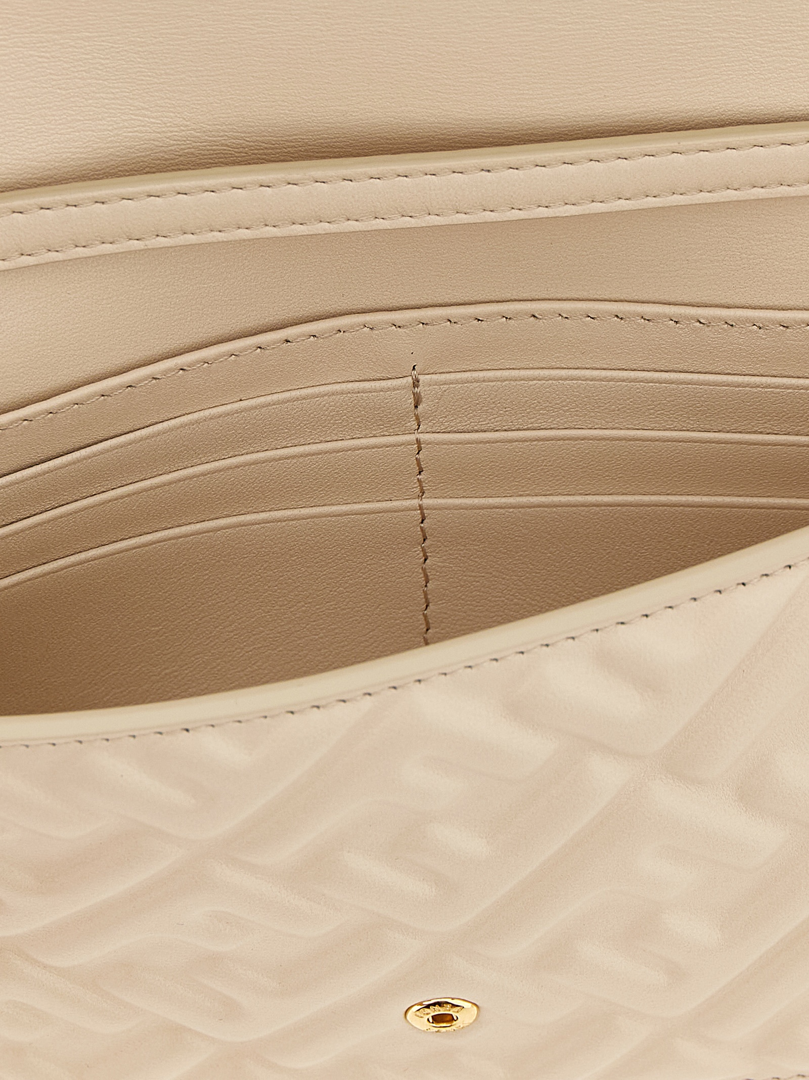 ‘Baguette’ nappa wallet on chain with iconic embossed FF pattern with a three-dimensional effect, magnetic flap closure with front metal FF logo, adjustable and removable short leather shoulder strap, and removable chain shoulder strap.