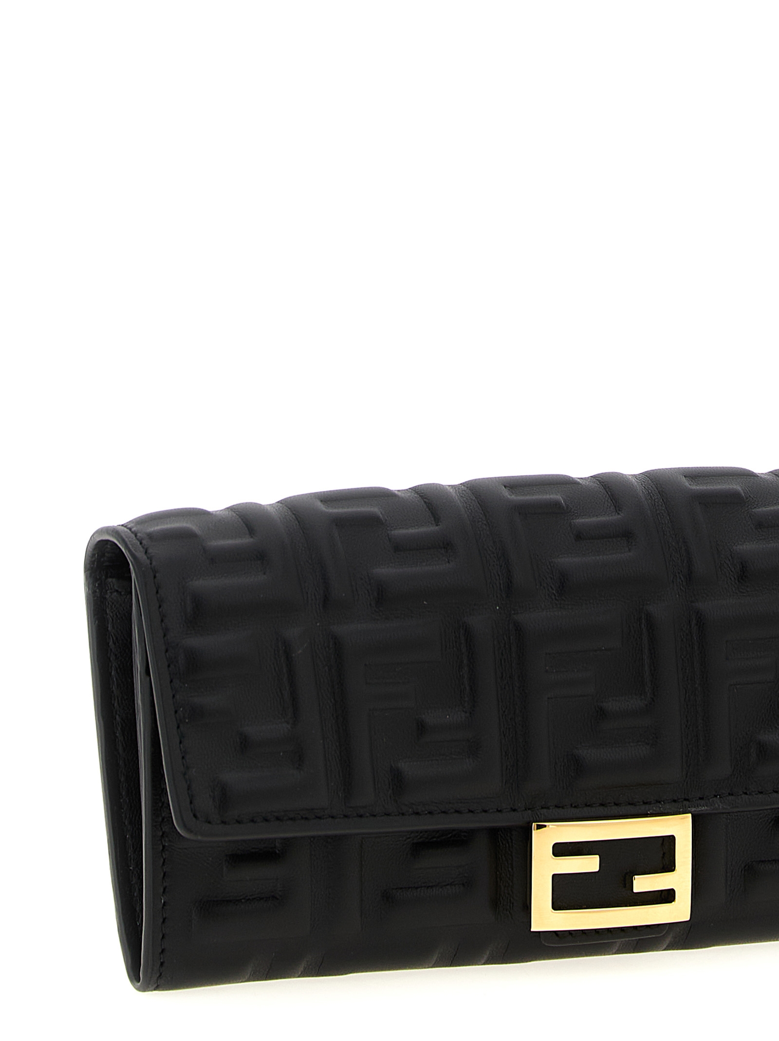 ‘Baguette’ nappa continental wallet with all-over embossed FF pattern, thin and removable chain shoulder strap, 2 inner gusset compartments, zip pockets, slip pockets and 10 card slots, and gold hardware.