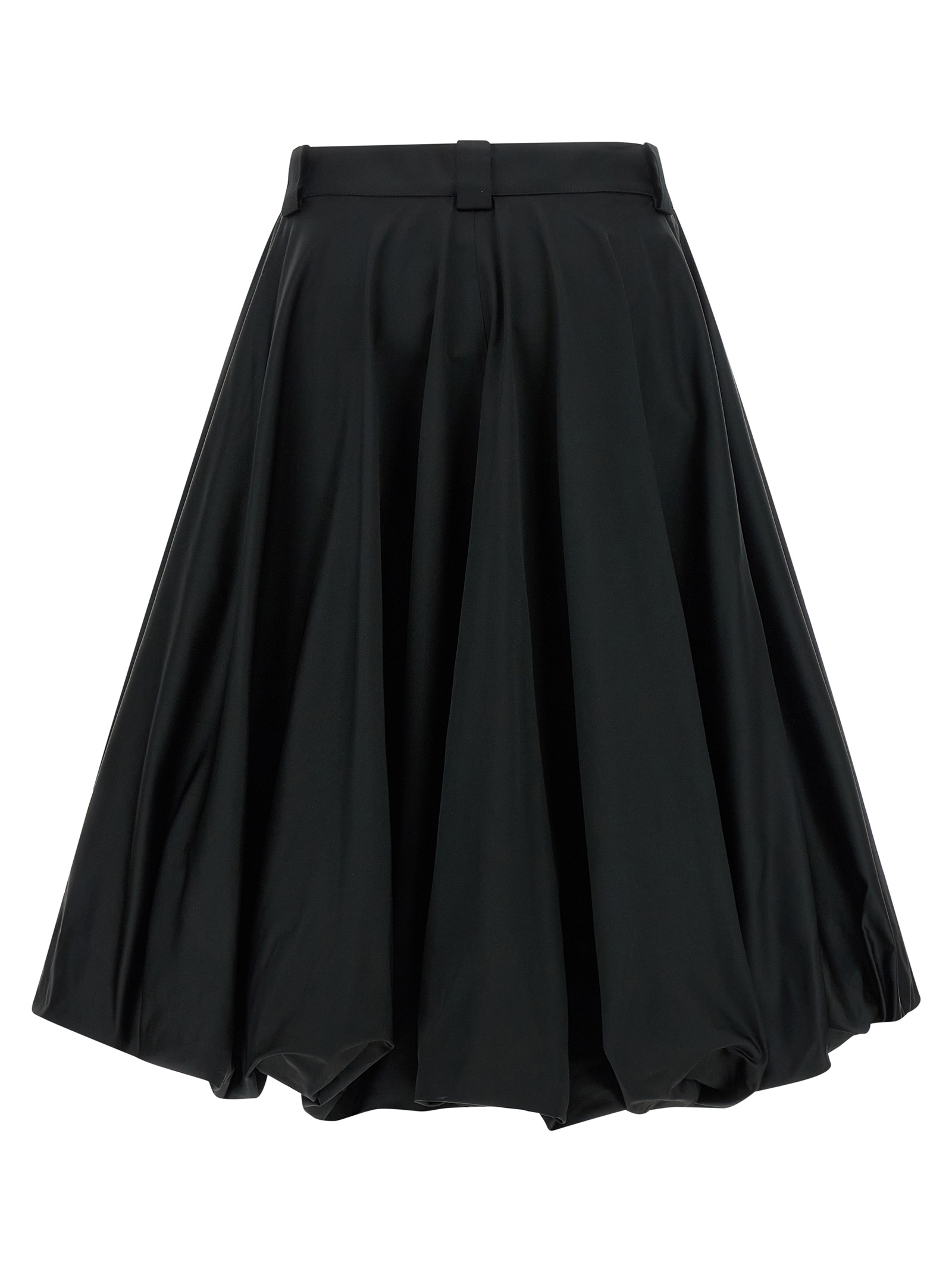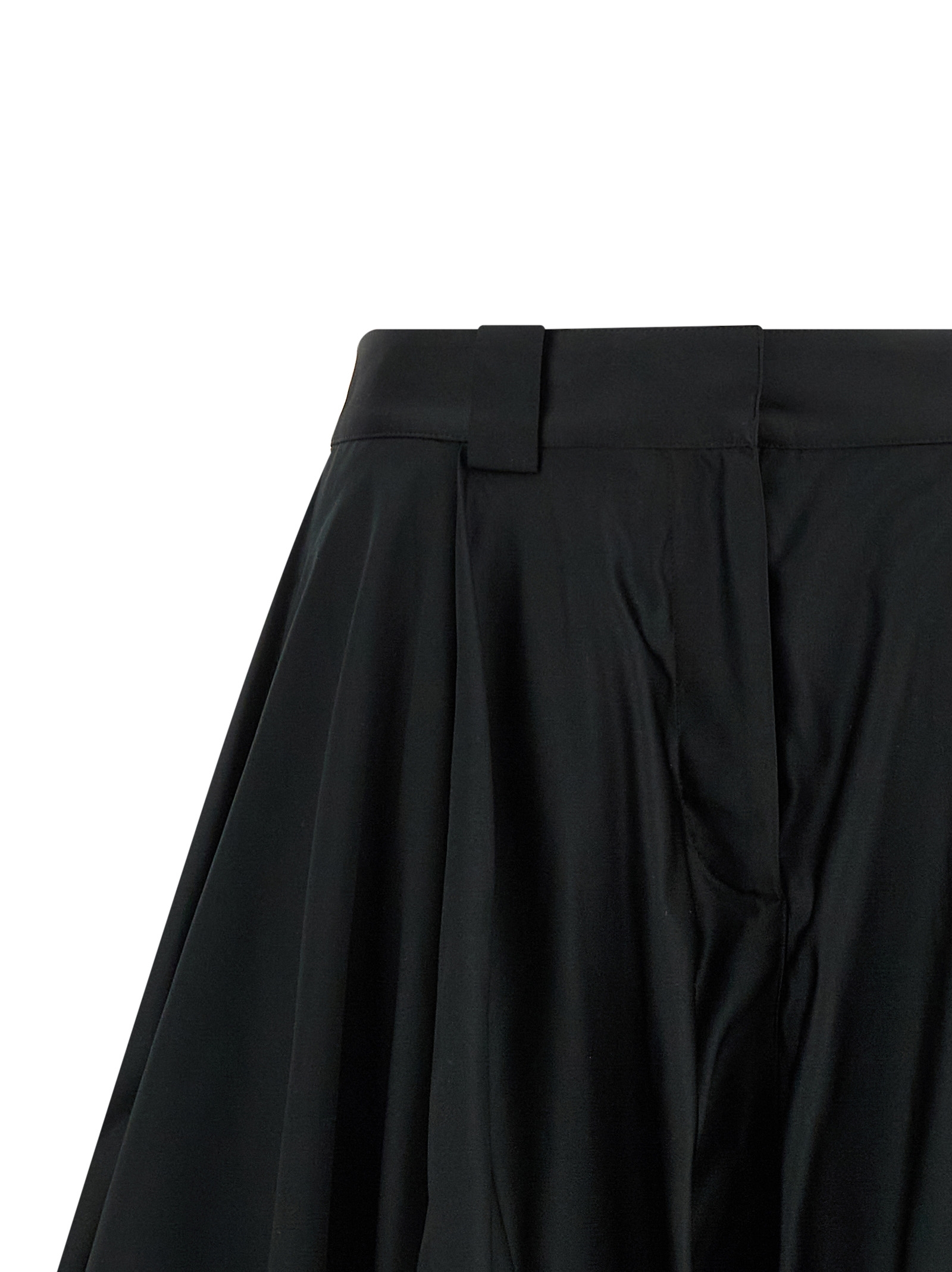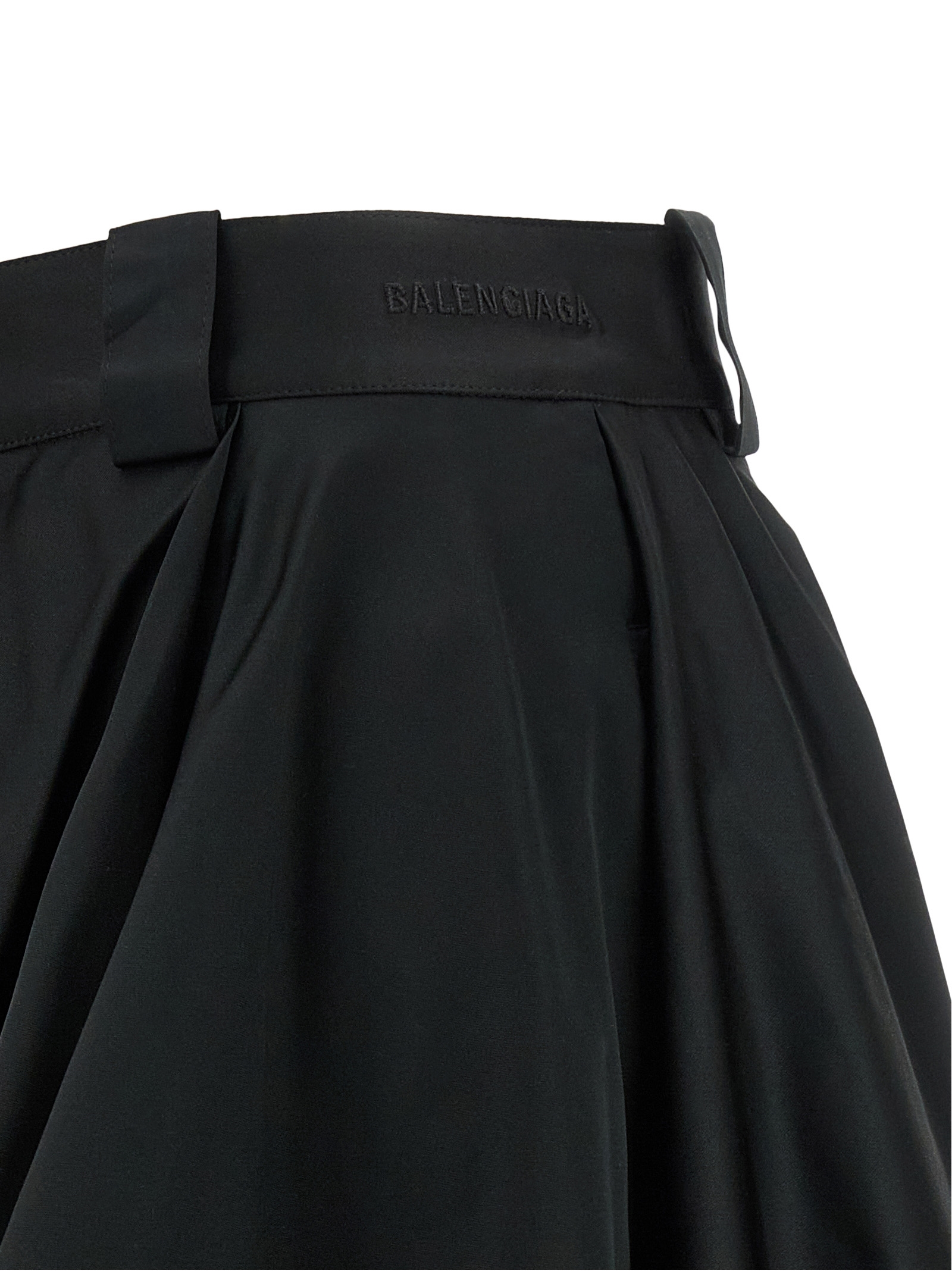 Bermuda shorts in shiny silk blend, wide leg with ‘Balloon’ silhouette and curled leg bottom, tone-on-tone logo embroidery at the waist, front zip and snap button closure, pockets, back trompe l’oeil skirt insert with pleats.