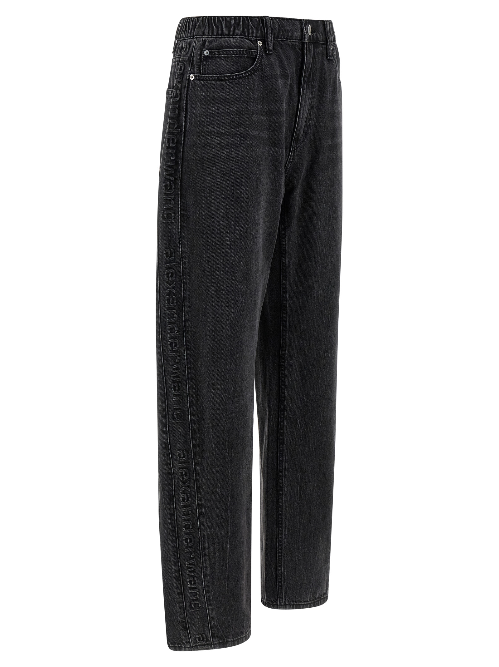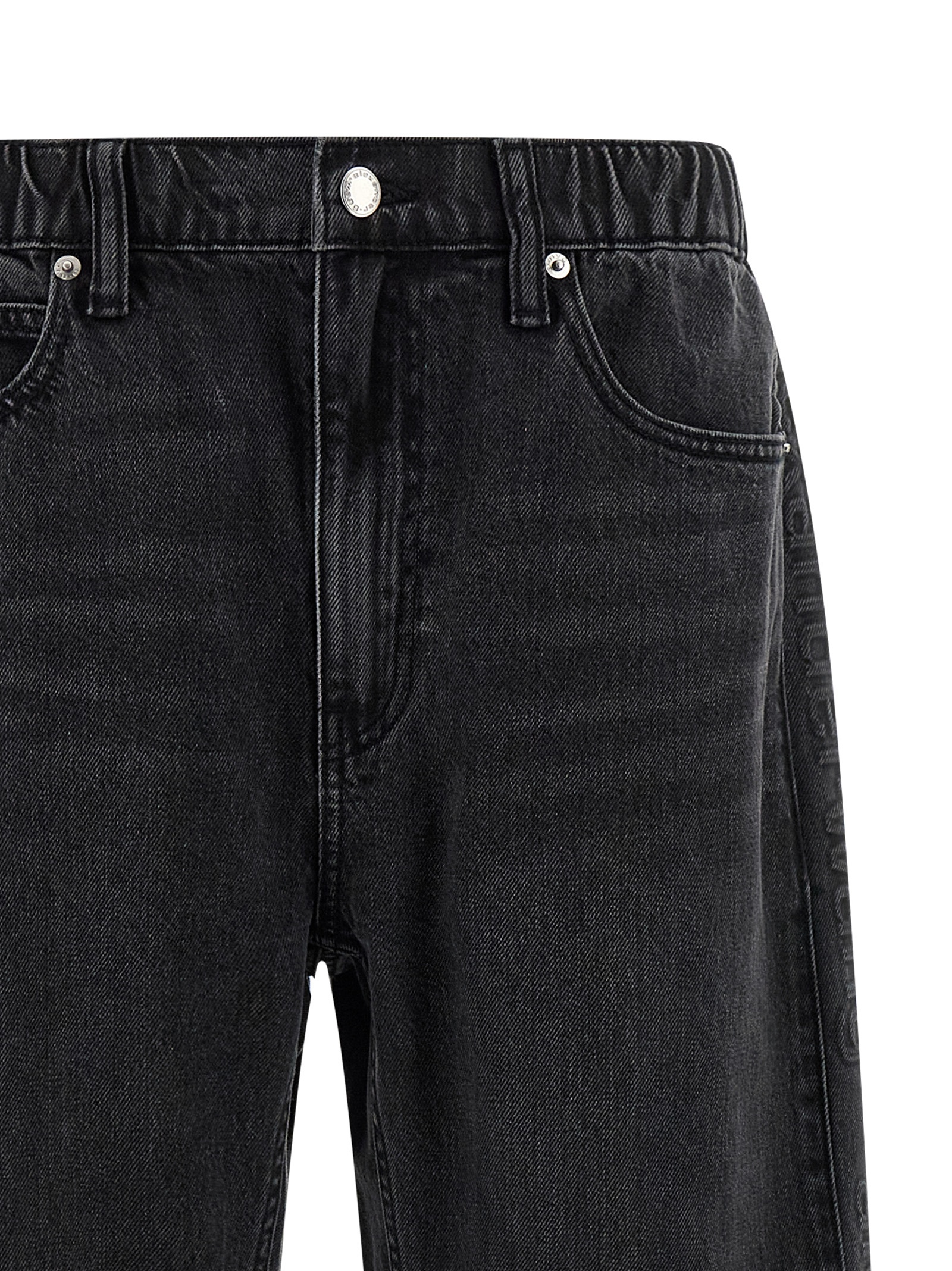 ‘Balloon Jogger’ cotton denim jeans, wide leg with side band with ’embossed’ logo, 5 pockets, front zip and button closure, elastic waistband, leather back logo tag.