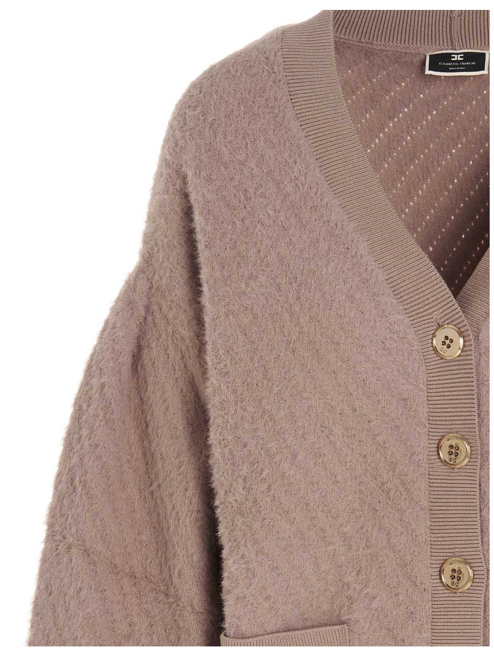 Cardigan with balloon sleeves, a gold button closure with a logo, knit cuffs, and pockets.