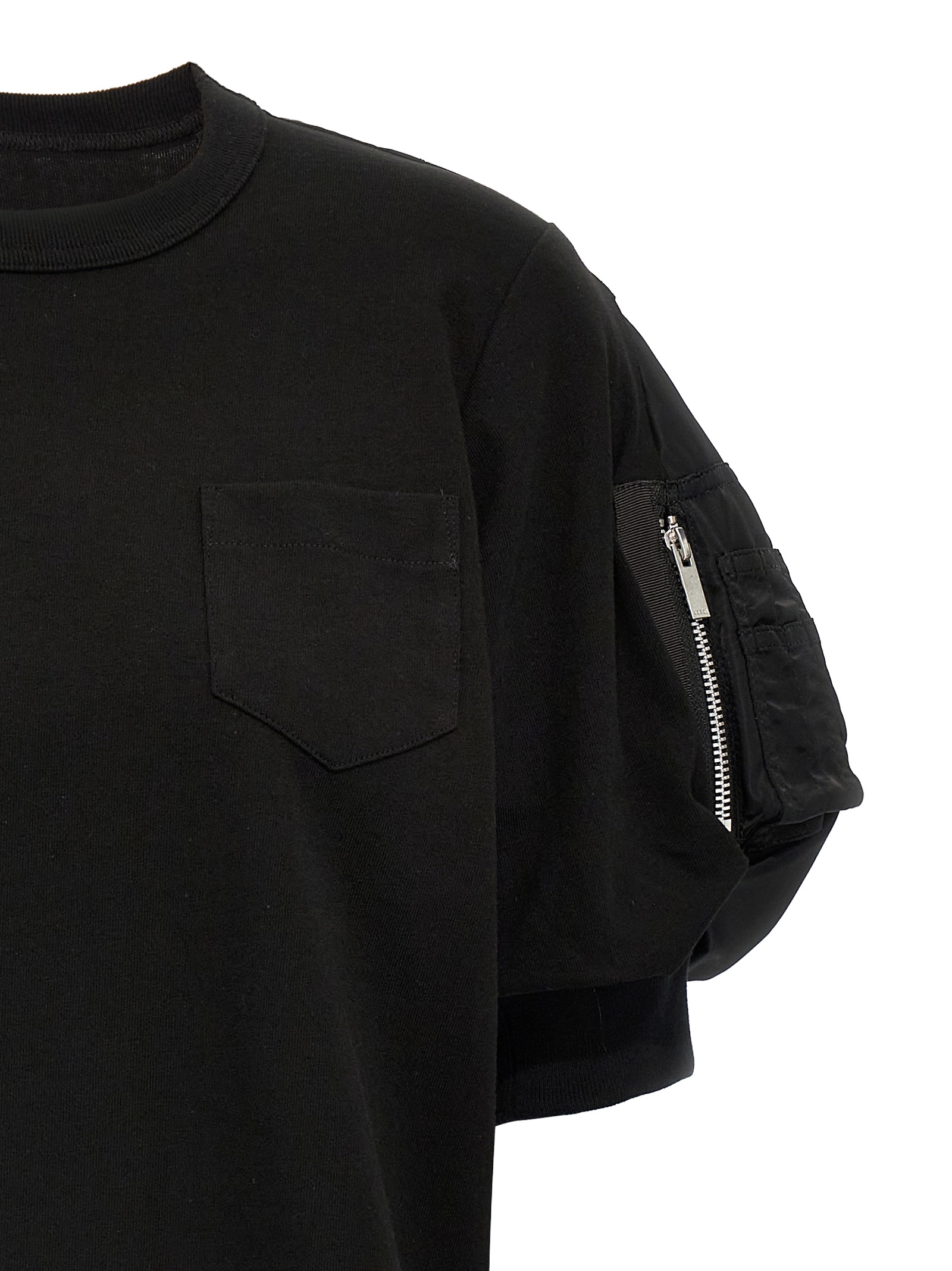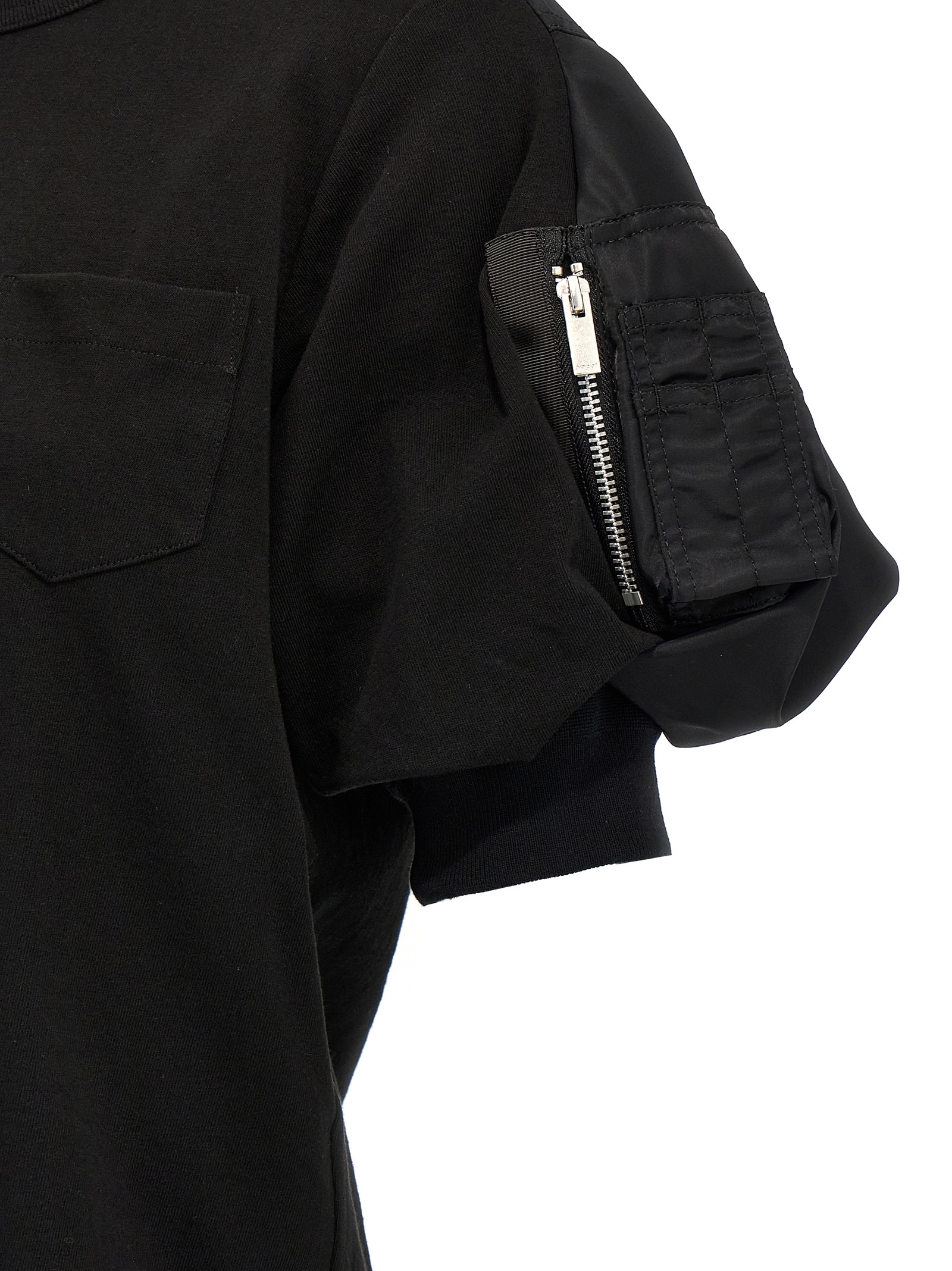 Cotton T-shirt with short nylon balloon sleeves and knitted cuffs, crew neck.
