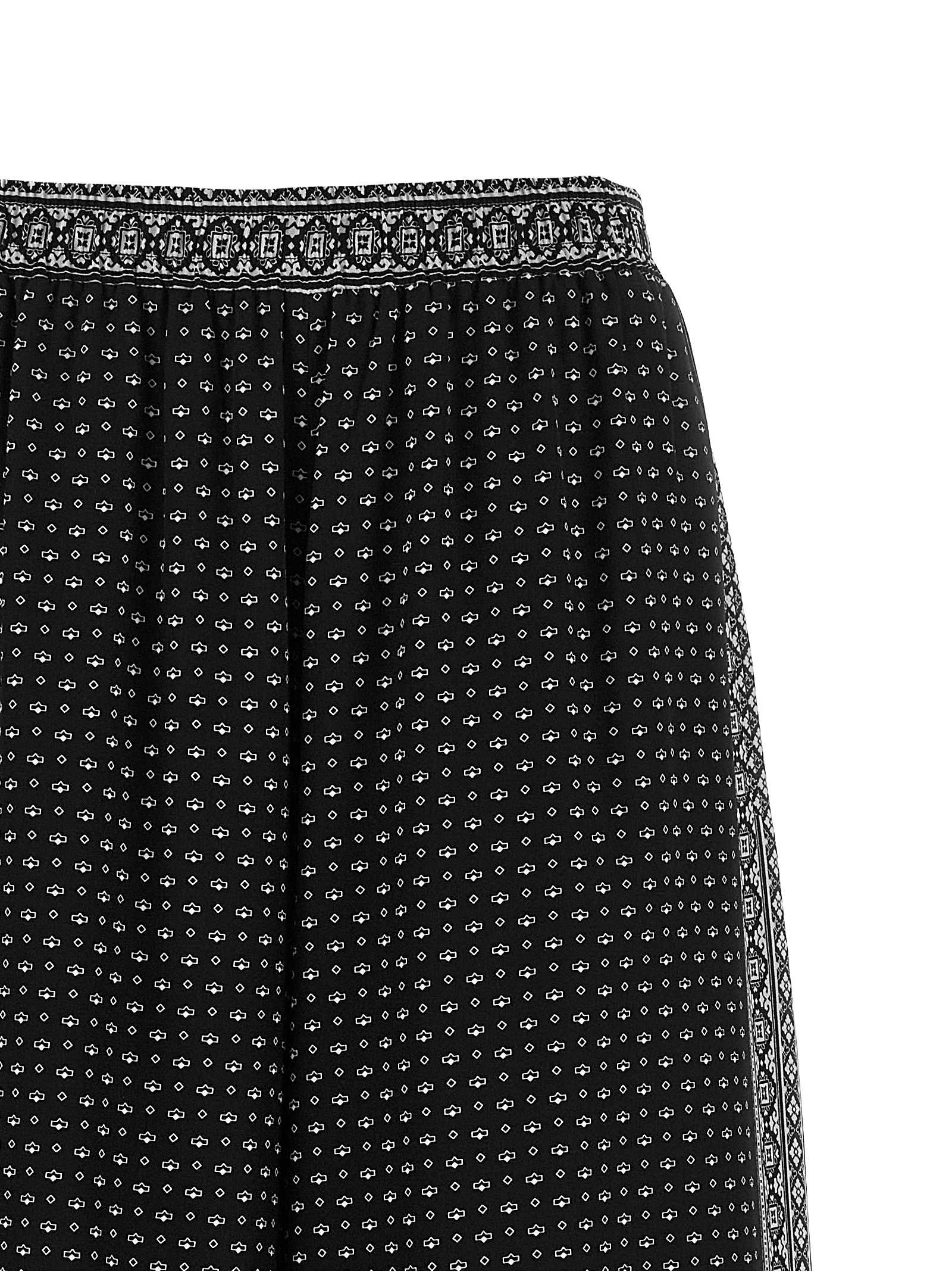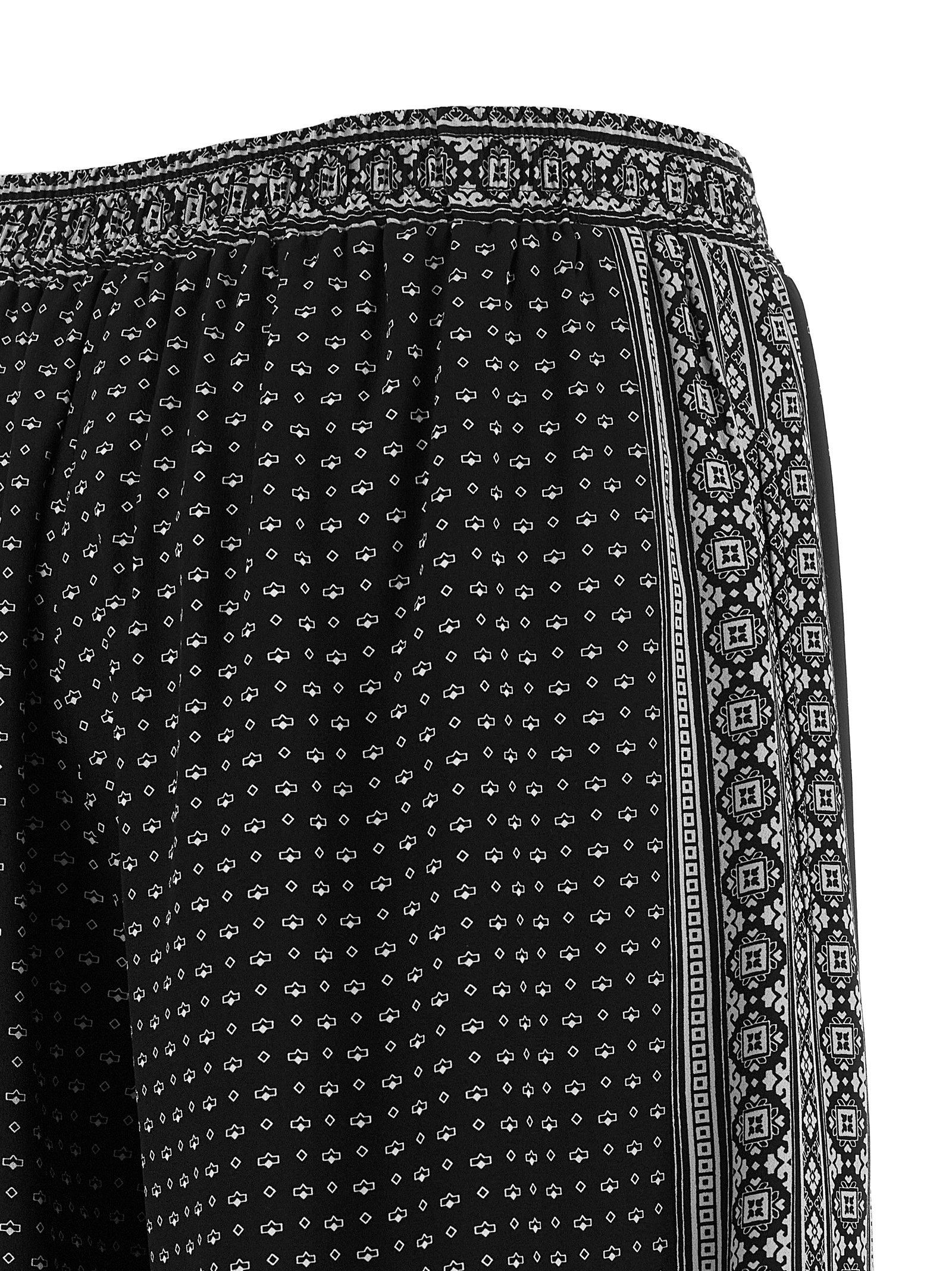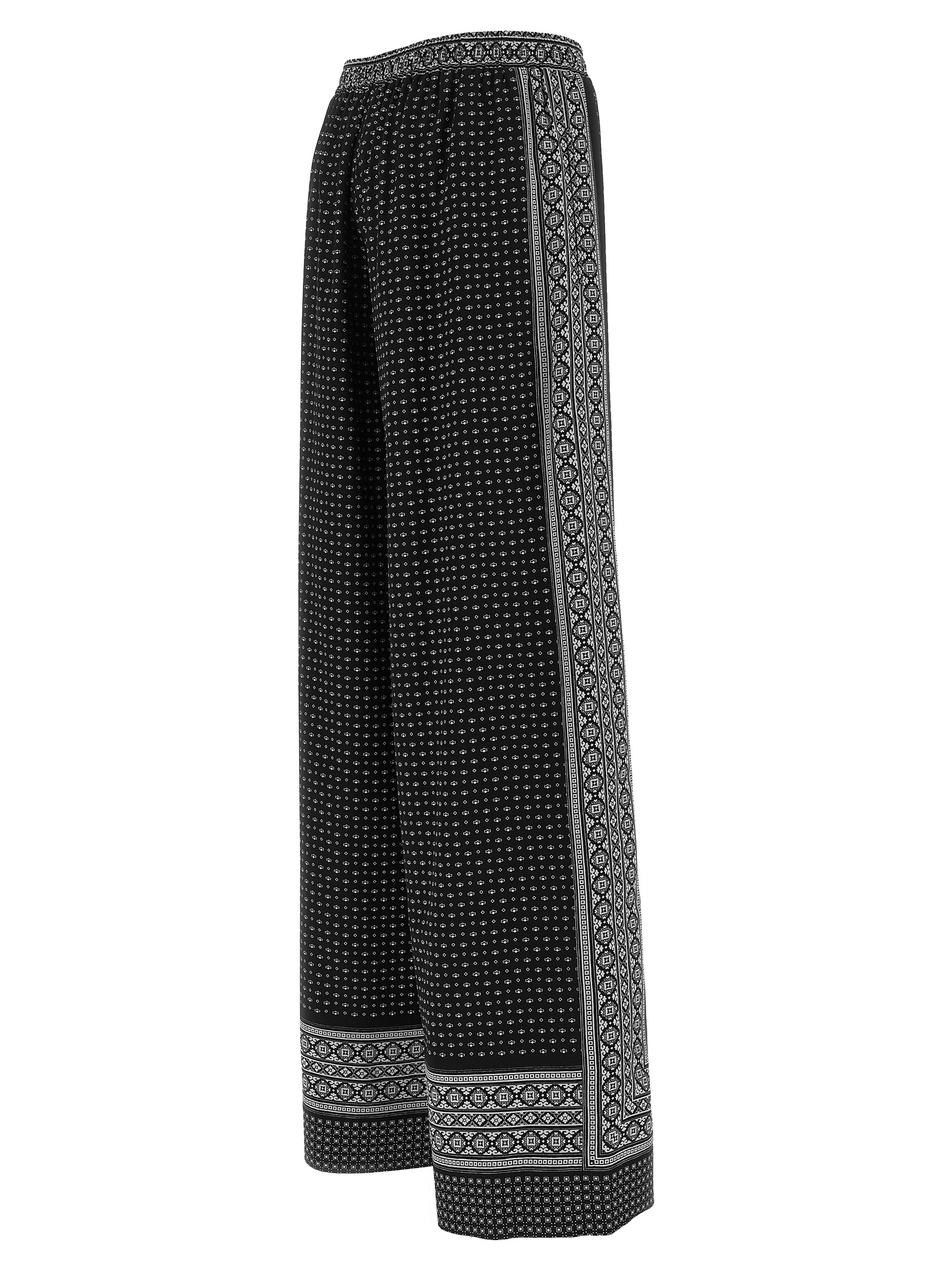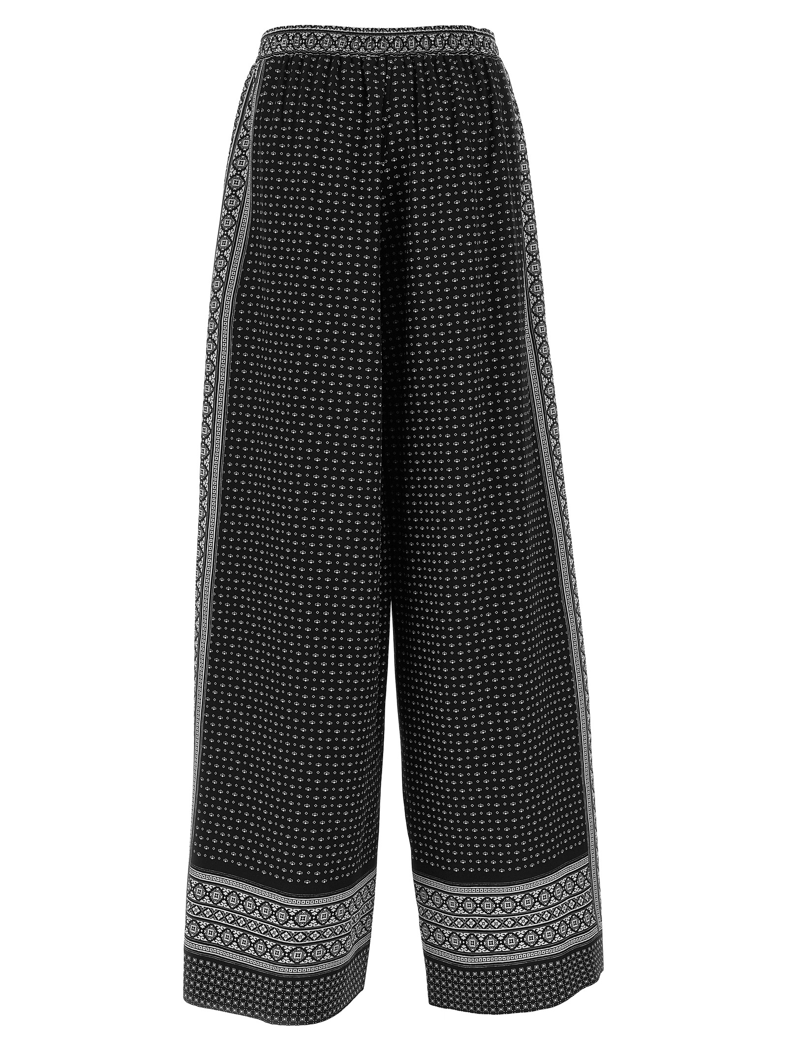 Pure silk bandana print pants, palazzo model with wide leg and elastic waistband, side pockets.