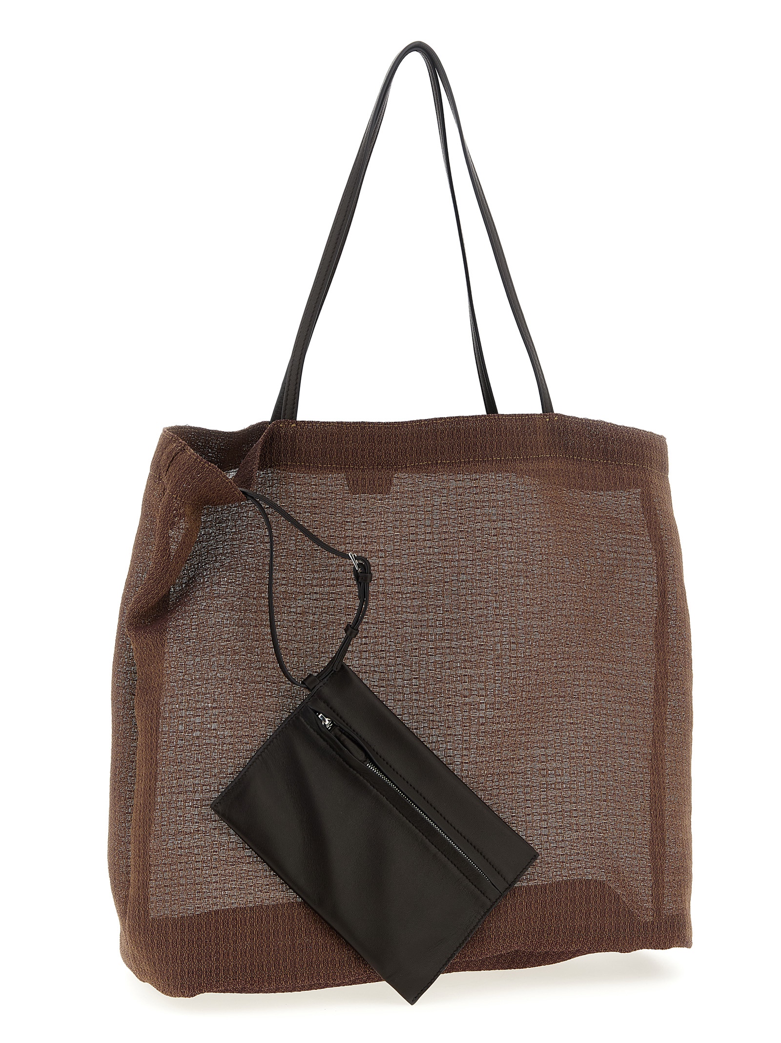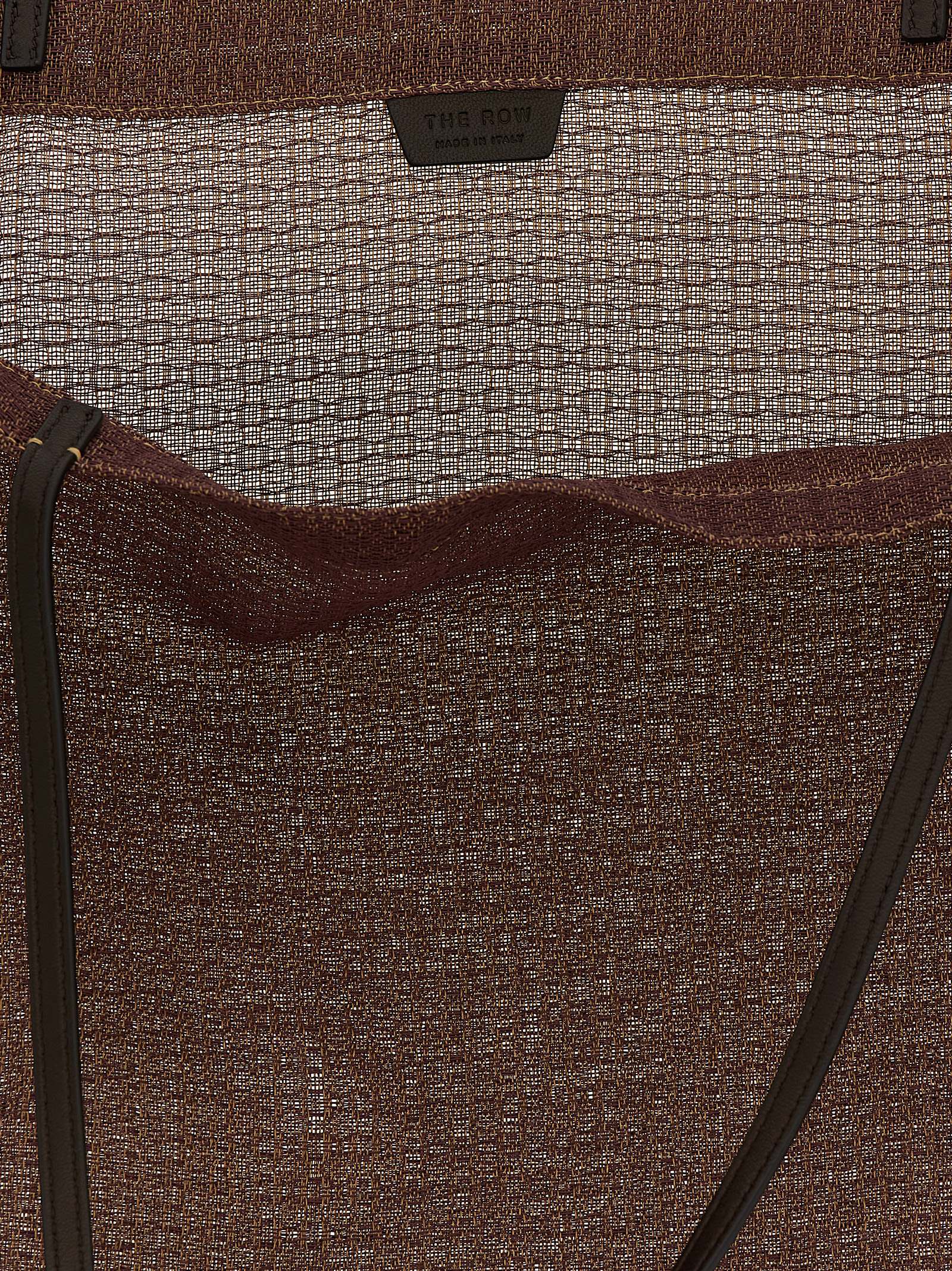 ‘Barn Tote’ shopping bag in woven mesh, geometric line, double fixed leather handle, unlined.