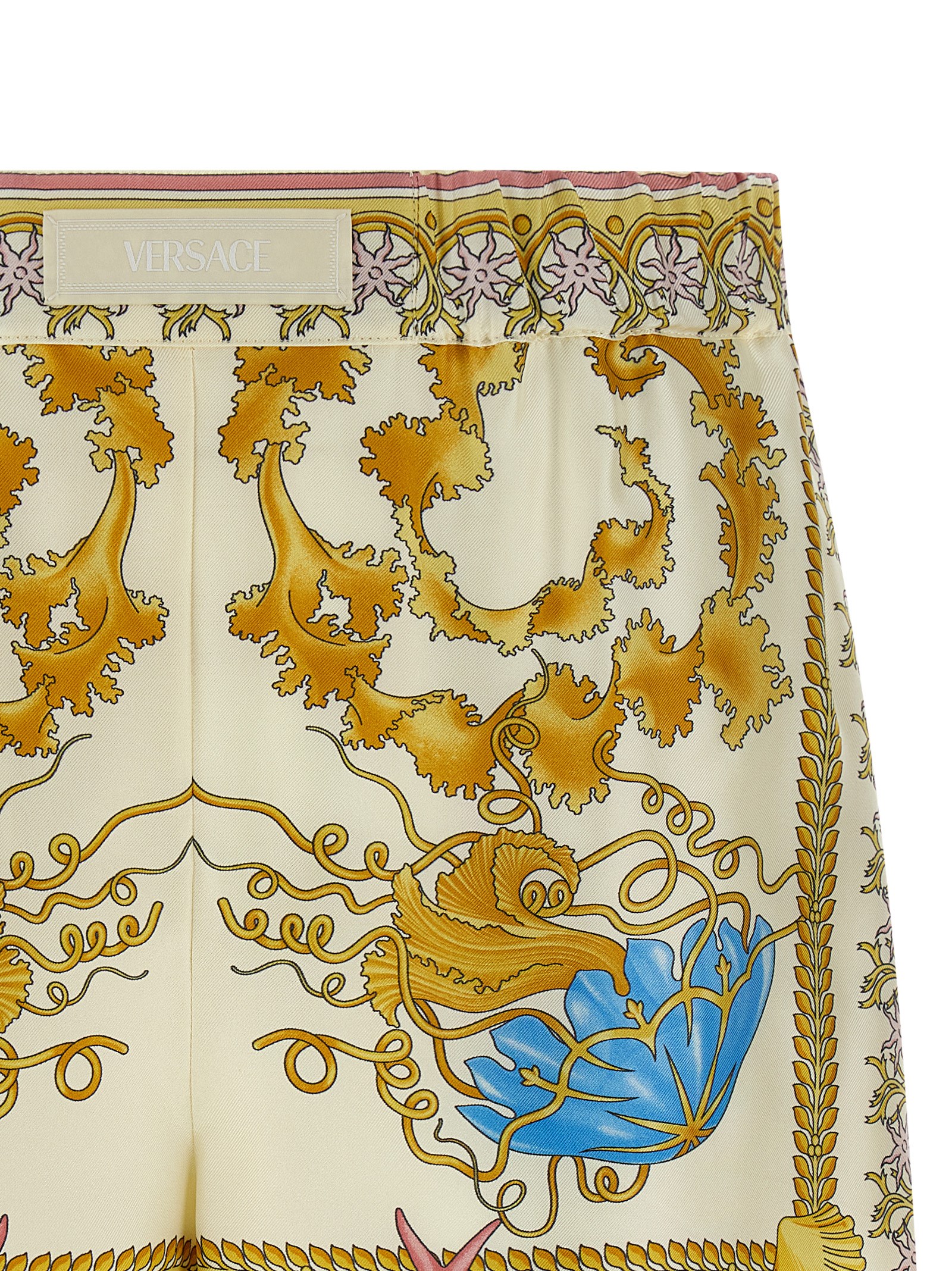 ‘Barocco’ print silk shorts elastic waistband with front logo patch and side pockets.