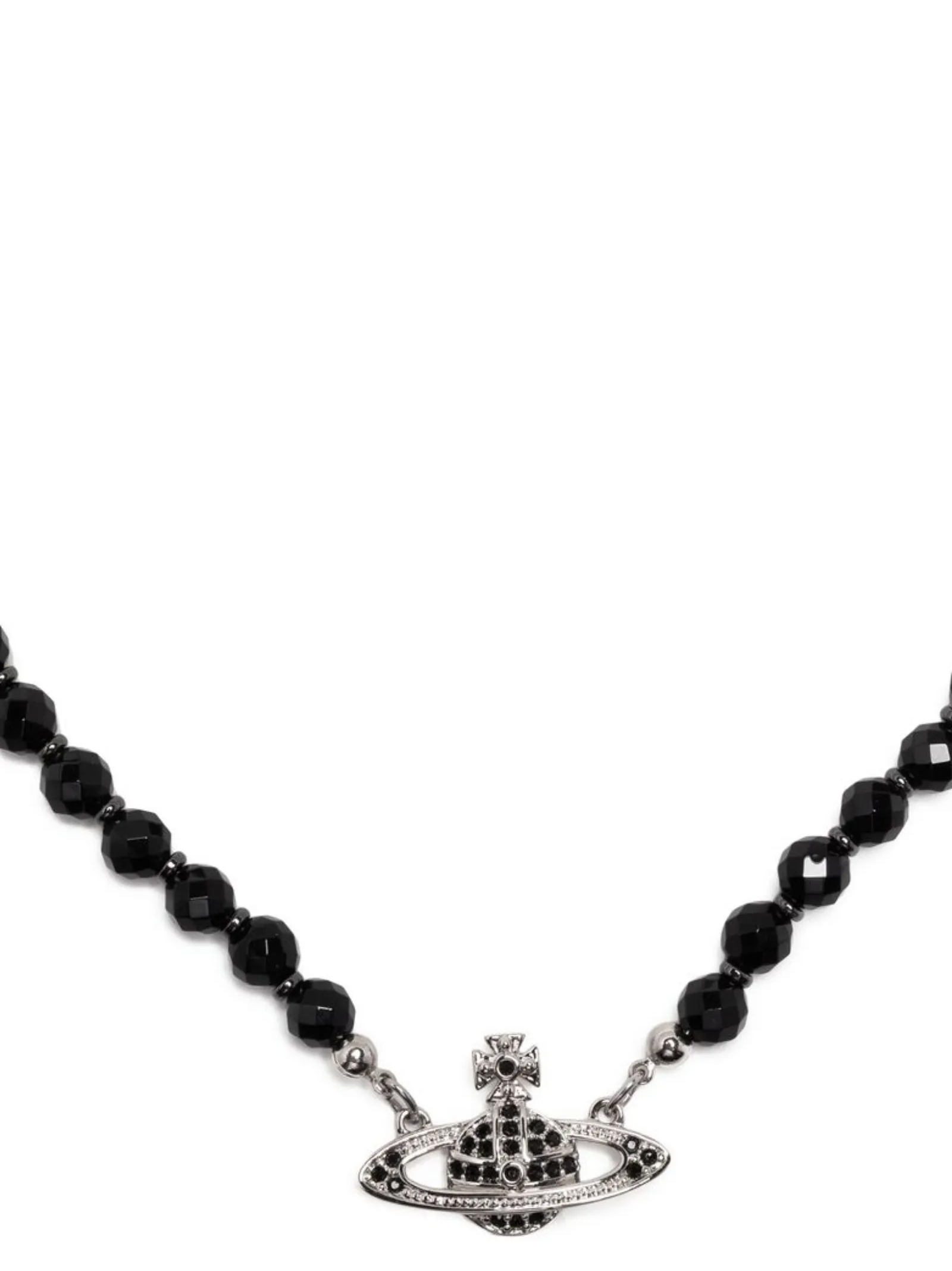 ‘Bas Relief’ choker with faceted crystals, silver metal and rhinestone logo charm, clasp closure.